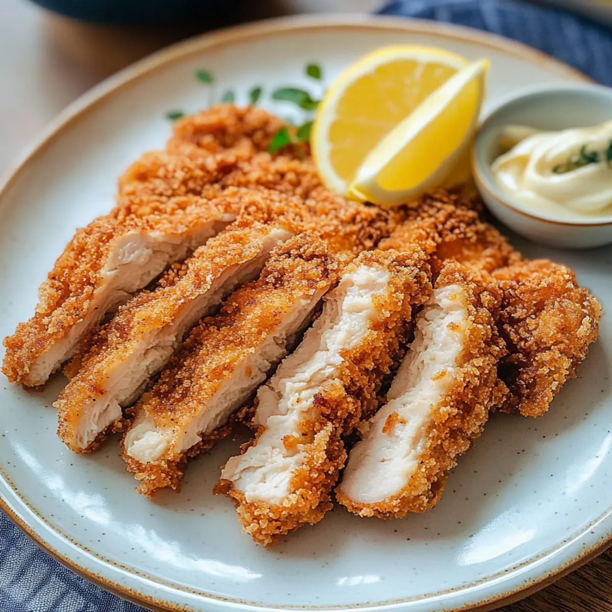 Die knusprige Außenschicht knistert verführerisch, als ich das heiß gebratene Stück Hähnchen auf den Teller lege. Taiwanesisches gebratenes Hähnchen, oder Ji Pai, ist nicht nur ein einfaches Gericht, sondern eine Reise durch die lebhaften Straßen von Taipeh. Den perfekten Mix aus saftigem Hähnchenfleisch und einer einzigartigen, knusprigen Kruste aus Süßkartoffelstärke zu meistern, ist ein wahres Vergnügen. Diese köstliche Spezialität ist nicht nur schnell zubereitet, sondern auch ein absoluter Publikumsliebling, der jeden Gaumen begeistert. Egal, ob für ein gemütliches Abendessen unter der Woche oder als besondere Leckerei für Gäste, dieses Rezept wird Ihre Liebsten sofort in den Bann ziehen. Sind Sie bereit, sich in neue Geschmackshorizonte zu wagen? Lassen Sie uns das Geheimnis dieses außergewöhnlichen Gerichts lüften! Warum ist dieses Rezept ein Muss? Knusprigkeit ist garantiert! Die Kombination aus Süßkartoffelstärke und goldbraunem Hähnchen sorgt für einen unwiderstehlichen Biss. Schnelligkeit ist ein weiterer Pluspunkt: In kürzester Zeit kreieren Sie eine kulinarische Erleuchtung, die sogar am hektischsten Wochentag den Abend rettet. Vielfalt ist ebenfalls gegeben – passen Sie das Rezept an, indem Sie mit Gewürzen experimentieren oder auf Panko-Breadcrumbs zurückgreifen. Und das Beste? Gemütlichkeit wird großgeschrieben! Dieses Gericht ist perfekt für ein gemütliches Abendessen mit Freunden oder Familie. Lassen Sie sich inspirieren und erleben Sie den Geschmack Taiwans mit jedem Bissen! Wenn Sie auf der Suche nach weiteren köstlichen Hähnchenrezepten sind, schauen Sie sich auch unser Hähnchen Mit Gemüse oder Honig Senf Hähnchen an! Zutaten für Taiwanesisches gebratenes Hähnchen • Um die perfekte Kombination aus Geschmack und Textur zu erzielen, werfen wir einen Blick auf die Zutaten, die dieses Gericht großartig machen. Für das Hähnchen • 1 lb Hähnchenoberschenkel (oder Brust) – Die Verwendung von Oberschenkeln sorgt für mehr Saftigkeit und Geschmack. • 2 Esslöffel helle Sojasauce – Verleiht dem Hähnchen eine vollmundige Salzigkeit und Tiefe im Geschmack. • 1 Esslöffel Shaoxing-Wein – Führt zu einer subtilen Komplexität und zartem Fleisch. • 1 Esslöffel Zucker – Balanciert die Aromen und fördert die Karamellisierung beim Frittieren. • 1″ Ingwer, gerieben – Gibt eine wärmende, aromatische Note. • 3 Knoblauchzehen, gerieben – Sorgt für einen kräftigen, aromatischen Geschmack. • 1 Teelöffel weißer Pfeffer – Fügt eine milde Schärfe hinzu, die typisch für die asiatische Küche ist. • 1 Teelöffel Fünf-Gewürze-Pulver – Bringt eine warme, duftende Gewürzmischung. • 1 Teelöffel Salz – Unverzichtbar für die Geschmacksverstärkung. • 1/4 Teelöffel chinesische Chiliflocken – Sorgt für eine subtile Schärfe. • 1/4 Teelöffel Paprika – Gibt Farbe und eine milde Süße. Für die Panade • 2 Pints Erdnussöl (zum Frittieren) – Hat einen hohen Rauchpunkt, ideal für perfektes Frittieren. • 3 Eier – Binden die Kruste an das Hähnchen und sorgen für Knusprigkeit. • 1/4 Tasse Maisstärke – Hilft, eine knusprige äußere Schicht zu erzeugen, wenn sie mit Eiern gemischt wird. • 1 Tasse grobe Süßkartoffelstärke (oder Panko-Brösel) – Hauptbestandteil der Panade, sorgt für den charakteristischen Crunch. Zum Servieren • Zitronenschnitze – Fügt beim Servieren eine erfrischende Säure hinzu. • Mayonnaise – Ein cremiger Dip, der das knusprige Hähnchen perfekt ergänzt. Entdecken Sie die wundervollen Aromen und machen Sie sich bereit, den Geschmack Taiwans in Ihrer eigenen Küche zu erleben! Schritt-für-Schritt-Anleitung für Köstliches Taiwanesisches gebratenes Hähnchen Step 1: Hähnchen klopfen Wickeln Sie die Hähnchenoberschenkel in Frischhaltefolie und klopfen Sie sie mit einem Fleischklopfer gleichmäßig auf etwa 1/3 Zoll Dicke. Dies fördert ein gleichmäßiges Garen und sorgt dafür, dass das Hähnchen zart bleibt. Nehmen Sie sich dafür etwa 5 Minuten Zeit, um das Hähnchen optimal vorzubereiten. Step 2: Hähnchen marinieren Mischen Sie in einer Schüssel die Sojasauce, den Shaoxing-Wein, Zucker, geriebenen Ingwer, Knoblauch, weißen Pfeffer, Fünf-Gewürze-Pulver, Salz, Chiliflocken und Paprika. Legen Sie die Hähnchenstücke in die Marinade und stellen Sie sicher, dass sie gleichmäßig bedeckt sind. Lassen Sie das Hähnchen mindestens 3 Stunden, besser über Nacht, im Kühlschrank ziehen, um die Aromen gut einziehen zu lassen. Step 3: Kochstation einrichten Bereiten Sie Ihre Kochstation vor, indem Sie eine große Schüssel für die Eier und die Maisstärke bereitstellen und die Süßkartoffelstärke in eine separate Schüssel geben. Platzieren Sie eine große, flache Backform oder ein Tablett für die panierten Hähnchenstücke daneben. Dieser Schritt sollte etwa 10 Minuten in Anspruch nehmen, lässt sich jedoch einfach in den vorherigen Marinierprozess integrieren. Step 4: Gewürzmischung vorbereiten Kombinieren Sie die restlichen Gewürze, die Sie für die Gewürzmischung verwendet haben, in einer kleinen Schüssel. Diese werden Sie später verwenden, um dem frisch frittierten Hähnchen zusätzlichen Geschmack zu verleihen. Halten Sie die Mischung bereit, während Sie mit dem nächsten Schritt fortfahren. Step 5: Hähnchen panieren Nehmen Sie ein mariniertes Hähnchenstück und tauchen Sie es zuerst in die Eimischung und dann in die Schüssel mit der Süßkartoffelstärke. Achten Sie darauf, dass das Hähnchen gleichmäßig benetzt ist, um eine knusprige Schicht zu gewährleisten. Führen Sie diesen Schritt für alle Hähnchenteile durch und stellen Sie sicher, dass sie gleichmäßig bedeckt sind. Step 6: Hähnchen frittieren Erhitzen Sie in einem großen Topf oder einer Fritteuse das Erdnussöl auf etwa 185 °C (365 °F). Frittieren Sie die Hähnchenstücke portionsweise für etwa 4 Minuten. Drehen Sie sie nach der Hälfte der Zeit um, um eine g