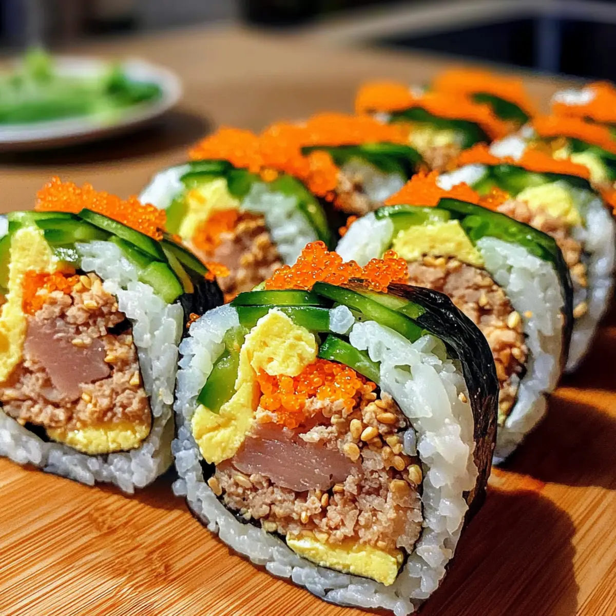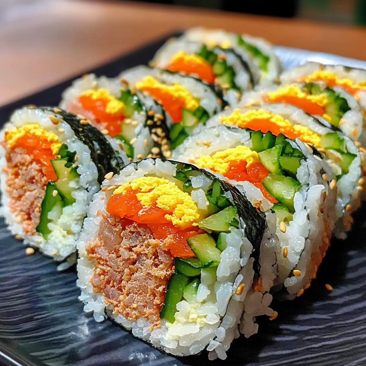 Irgendwo zwischen einem verregneten Nachmittag und der Sehnsucht nach etwas Köstlichem entdeckte ich das Geheimnis des Thunfisch-Mayo-Kimbap mit Gemüse. Diese koreanischen Lunchrollen sind nicht nur ein Genuss für den Gaumen, sondern auch ein Augenschmaus – die bunten Schichten aus weichem Reis, knackigem Gemüse und einer cremigen Thunfischfüllung sind perfekt für jedes Picknick oder zur Aufmunterung im Büro. Das Beste daran? Die Zubereitung ist schnell und unkompliziert, sodass ich in kürzester Zeit ein schmackhaftes Gericht zaubern kann, das nicht nur satt macht, sondern auch gut für die Seele ist. Wer hätte gedacht, dass so viel Freude in einer einfachen Rolle stecken kann? Lass uns zusammen herausfinden, wie man diese leckere Köstlichkeit ganz einfach selbst zubereitet! Warum wirst du dieses Kimbap lieben? Einfache Zubereitung: Die Schritte sind leicht verständlich und erfordern keine besonderen Kochkünste. Vielfältige Füllungen: Das Kimbap lässt sich ganz nach deinem Geschmack anpassen – ob vegan oder mit Fleisch, die Möglichkeiten sind endlos. Wunderbare Frische: Die Kombination aus knackigem Gemüse und cremiger Thunfischfüllung sorgt für ein Geschmackserlebnis, das begeistern wird. Perfekt für unterwegs: Ideal als leichtes Mittagessen oder für ein Picknick, sind diese Rollen einfach zu transportieren. Gesund und nahrhaft: Mit vielen frischen Zutaten ist das Thunfisch-Mayo-Kimbap eine sättigende und gesunde Wahl. Wenn du mehr über die Zubereitung erfahren möchtest, schau dir auch unsere wertvollen Tipps an, um das optimale Kimbap zu kreieren! Thunfisch-Mayo-Kimbap Zutaten Für den Reis Gerösteter Seetang (Nori) – Gibt dem Kimbap Struktur und Geschmack; du kannst auch Sojapapier für einen milderen Geschmack verwenden. Kurzkörniger weißer Reis – Bildet die Grundlage des Kimbap, sorgt für die nötige Klebrigkeit; verwende Sushi-Reis für die beste Textur. Sesamöl – Verleiht ein nussiges Aroma; bei Bedarf durch Pflanzenöl mit Sesamsamen ersetzen. Feines Meersalz – Verbessert den Geschmack von Reis und Füllung; nach Geschmack anpassen. Für die Füllung Dosen-Thunfisch – Liefert Protein; wähle chunk light oder festen weißen Thunfisch in Wasser oder Öl; veganer Ersatz könnte gewürzter Tofu sein. Mayonnaise – Bindet die Thunfischfüllung für Cremigkeit; für eine leichtere Variante griechischen Joghurt verwenden. Eier – Fügt Geschmack und Protein hinzu; kann durch eine Rührei-Alternative aus Tofu ersetzt werden. Spinat – Bringt Nährstoffe und Farbe; blanchiere ihn kurz, um die Textur zu erhalten. Karotte – Sorgt für Süße und Crunch; dünste sie, um die Zartheit zu verbessern; auch Paprika kann verwendet werden. Danmuji (eingelegter Rettich) – Fügt eine süße, würzige Knackigkeit hinzu; ersetze ihn durch leicht eingelegte Gurken, wenn du ihn nicht findest. Für das Finish Optionales Gemüse – Probiere Gurken- oder Paprikastreifen für zusätzlichen Crunch! Schritt-für-Schritt-Anleitungen für Thunfisch-Mayo-Kimbap mit Gemüse Step 1: Reis zubereiten Koche den kurzkörnigen weißen Reis nach Packungsanweisung und lasse ihn abkühlen. Mische den abgekühlten Reis in eine Schüssel mit feinem Meersalz und einem Esslöffel Sesamöl, bis der Reis gleichmäßig gewürzt ist. Dieser Schritt sorgt dafür, dass der Reis die perfekte Klebrigkeit für das Thunfisch-Mayo-Kimbap mit Gemüse hat. Step 2: Thunfischfüllung herstellen Öffne eine Dose Thunfisch und lasse das Wasser oder Öl abtropfen. Mische den Thunfisch in einer Schüssel mit zwei Esslöffeln Mayonnaise, bis die Mischung cremig und gut verbunden ist. Diese Füllung ist das Herzstück des Kimbap und sorgt für den köstlichen, herzhaften Geschmack, den jeder lieben wird. Step 3: Eier zubereiten Verquirle zwei Eier in einer Schüssel und erwärme eine beschichtete Pfanne bei mittlerer Hitze. Gieße die Eier hinein und koche sie für 2-3 Minuten, bis sie fest sind. Nimm das Omelett aus der Pfanne, lasse es abkühlen und schneide es in dünne Streifen. Diese Eierstreifen geben dem Thunfisch-Mayo-Kimbap mit Gemüse eine schönere Textur und reichhaltigen Geschmack. Step 4: Karotten sautieren Schäle und schneide eine Karotte in feine Streifen. Erwärme etwas Öl in einer Pfanne und brate die Karottenstreifen für etwa 3-4 Minuten, bis sie weich und leicht angebraten sind. Vermische sie anschließend mit einem Teelöffel Sesamöl. Diese zarten Karotten bringen einen süßen Kontrast in das Kimbap. Step 5: Spinat blanchieren Bringe einen Topf mit Wasser zum Kochen. Gib die gründlich gewaschenen Spinatblätter für 30 Sekunden hinein, bis sie zusammenfallen. Transferiere den Spinat dann sofort in eine Schüssel mit Eiswasser, um den Garprozess zu stoppen. Drücke das überschüssige Wasser aus und würze leicht mit Salz. Der blanchierte Spinat verleiht deinem Kimbap Farbe und Nährstoffe. Step 6: Kimbap zusammenstellen Lege ein Blatt gerösteten Seetang (Nori) auf eine Bambusmatte. Verteile eine Schicht des gewürzten Reis gleichmäßig auf dem Nori und lasse dabei einen Rand frei. Schichte nun die Thunfischfüllung, die Eierstreifen, die sautierten Karotten und den blanchierten Spinat darauf. Dieser Schritt sorgt für eine schöne Präsentation des Thunfisch-Mayo-Kimbap mit Gemüse. Step 7: Rollen und festdrücken Benutze die Bambusmatte, um das Kimbap vorsichtig fest aufzurollen. Drücke die Rolle sanft an, damit sie gut zusammenhält und die Füllungen nicht herausfallen. Achte darauf, dass die Rolle gleichmäßig und fest ist, um die perfekte Struktur für das Thunfisch-Mayo-Kimbap zu gewährleisten. Step 8: Kimbap schneiden und servieren Nasse ein scharfes Messer mit Wasser, um das Kimbap in gleichmäßige Stücke zu schneiden. Schneide die Rolle vorsichtig in etwa 2-3 cm dicke Scheiben. Serviere die Kimbap-Scheiben umgehend oder wickele sie in Frischhaltefolie, um sie später zu genießen. Dieses Kimbap ist nicht nur köstlich, sondern auch ideal für ein schnelle