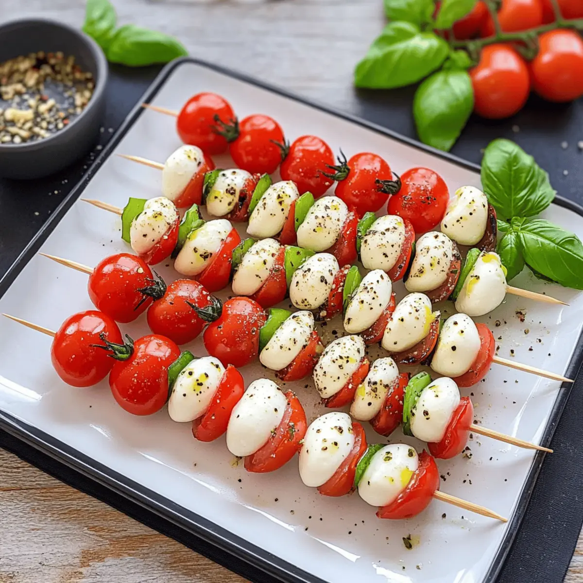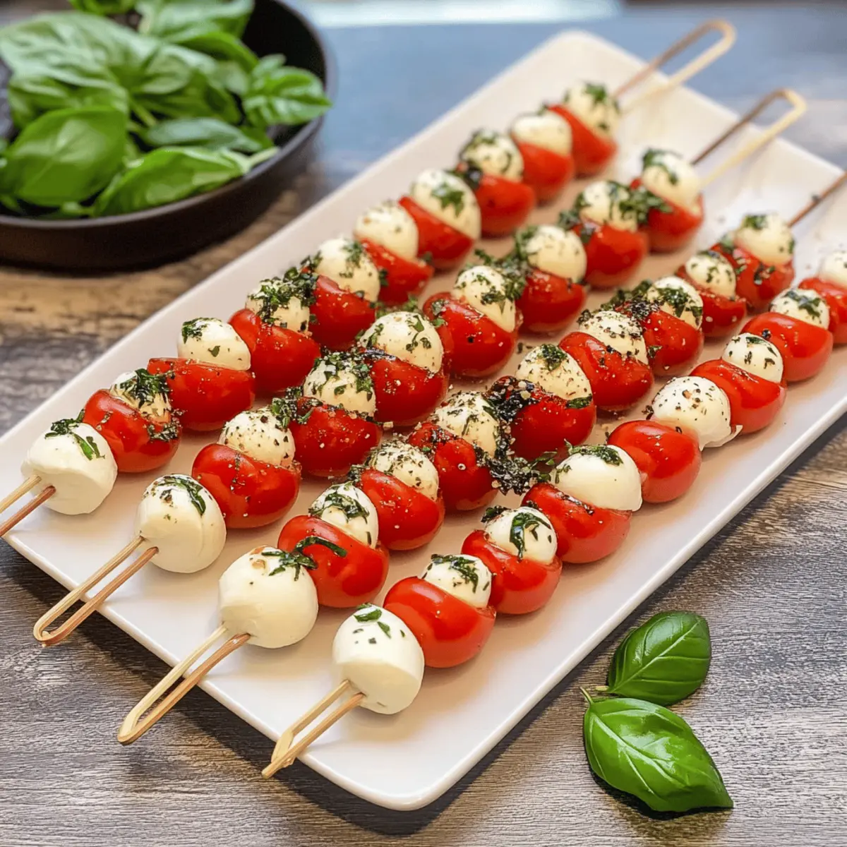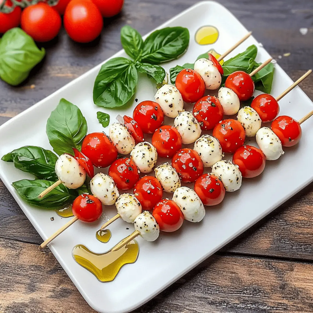 Die Tomate-Mozzarella-Spieße sind die perfekte Lösung für einen kulinarischen Schnellschuss, den jeder zaubern kann! In nur 10 Minuten verwandele ich frische Kirschtomaten und cremige Mini-Mozzarella-Kugeln in ein farbenfrohes, schmackhaftes Fingerfood, das garantiert jedem schmeckt. Diese vegetarischen Leckerbissen sind nicht nur ein echter Blickfang auf jedem Tisch, sondern auch eine gesunde Alternative zu fast food. Sie lassen sich ganz einfach vorbereiten und sind ideal für Partys oder gemütliche Abende mit Freunden. Und wie sieht es mit einer raffinierten Marinade aus italienischen Kräutern aus, die den Geschmack abrundet? Neugierig auf das schnellste Rezept, das deine Gäste entzücken wird? Lass uns gleich loslegen! Warum sind Tomate-Mozzarella-Spieße perfekt? Einfachheit: Mit nur wenigen Zutaten und in nur 10 Minuten zubereitet, sind diese Spieße das ideale Rezept für jeden, der gesunde und schmackhafte Snacks liebt. Frische Aromen: Die Kombination aus frischen Kirschtomaten, cremigem Mini-Mozzarella und aromatischem Basilikum sorgt für einen Geschmack, der begeistert. Vielseitigkeit: Ob als Fingerfood auf Partys oder als leckere Beilage zu Fladenbrot, diese Spieße passen zu jeder Gelegenheit. Gesundheitsbewusst: Vegetarisch und leicht, sind diese Tomate-Mozzarella-Spieße eine hervorragende Alternative zu Fast Food. Ein Blickfang: Die leuchtenden Farben machen sie zum perfekten Appetizer, der garantiert das Interesse deiner Gäste weckt. Tomate-Mozzarella-Spieße Zutaten Für die Spieße: Kirschtomaten – Frisch und saftig für den perfekten Biss; alternativ können auch Cocktailtomaten verwendet werden. Mini-Mozzarella Kugeln – Diese cremigen Kugeln harmonieren wunderbar mit den Tomaten; wir empfehlen etwa 170 g Abtropfgewicht. Basilikumblätter – Sie bringen einen frischen Duft und einen lebhaften Geschmack; die Farbe sorgt zudem für einen hübschen Kontrast. Für die Marinade: Olivenöl – Es sorgt für Geschmeidigkeit und bindet die Aromen; hochwertiges Öl macht einen Unterschied. Italienische Kräuter – Diese Gewürzmischung bringt den typischen italienischen Flair in deine Tomate-Mozzarella-Spieße; frische Kräuter sind ebenfalls eine gute Option. Salz und Pfeffer – Die Basis für die richtige Würze, die die Spieße perfekt abrundet. Schritt-für-Schritt-Anleitung für Tomate-Mozzarella-Spieße Step 1: Kirschtomaten und Mozzarella vorbereiten Wasche die frischen Kirschtomaten gründlich unter fließendem Wasser und trockne sie vorsichtig mit einem Küchentuch ab. Lass die Mini-Mozzarella-Kugeln in einem Sieb abtropfen, damit überschüssige Flüssigkeit entfernt wird. Beide Zutaten sind die Basis deiner Tomate-Mozzarella-Spieße und sollten gut vorbereitet sein, um den besten Geschmack zu garantieren. Step 2: Marinade anrühren Gib in eine kleine Schüssel etwa 3 Esslöffel hochwertiges Olivenöl, eine Prise Salz, frisch gemahlenen Pfeffer und eine Mischung aus italienischen Kräutern. Rühre alles gut um, bis sich die Zutaten verbinden und eine geschmeidige Marinade entsteht. Diese wird die Tomate-Mozzarella-Spieße aromatisch abrunden. Step 3: Mozzarella marinieren Füge die abgetropften Mini-Mozzarella-Kugeln zur Marinade hinzu und rühre vorsichtig um, damit sie gleichmäßig bedeckt werden. Lasse die Kugeln für etwa 5 Minuten in der Marinade, damit sie die Aromen gut aufnehmen. Diese kurze Marinierzeit ist ideal, um den Geschmack zu intensivieren. Step 4: Spieße aufbauen Nimm Holzspieße und beginne, die Zutaten abwechselnd aufzuspießen: zuerst eine Kirschtomate, dann ein Basilikumblatt und schließlich eine Marinierte Mozzarella-Kugel. Dieses Muster wiederhole, bis alle Zutaten aufgebraucht sind. Die leuchtenden Farben machen deine Tomate-Mozzarella-Spieße zu einem optischen Highlight. Step 5: Kühlen und Servieren Platziere die fertigen Spieße auf einem großen Teller oder einer Servierplatte und stelle sie bis zum Servieren in den Kühlschrank. Dies sorgt nicht nur für eine erfrischende Kühle, sondern lässt auch die Aromen etwas intensiver werden. Vor dem Servieren kannst du optional noch etwas Balsamico darüber träufeln. Lagerungstipps für Tomate-Mozzarella-Spieße Kühlschrank: Bewahre die Spieße im Kühlschrank auf und genieße sie innerhalb von bis zu 2 Stunden, um die Frische und den Geschmack zu erhalten. Airtight Wrapping: Wenn du sie länger aufbewahren möchtest, lass sie bis zu 4 Stunden marinieren und verpacke sie in luftdichten Behältern, um das Austrocknen zu verhindern. Vorbereitung: Diese Tomate-Mozzarella-Spieße können problemlos im Voraus zubereitet werden, perfekt als Appetizer für Partys oder gemütliche Abende. Servieren: Vor dem Servieren können die Spieße optional mit Balsamico beträufelt werden, um den Geschmack zu intensivieren. Tomate-Mozzarella-Spieße Variationen Entfalte deine Kreativität und passe die Tomate-Mozzarella-Spieße ganz nach deinem Geschmack an! Dairy-Free: Ersetze den Mozzarella durch pflanzlichen Käse für eine milchfreie Variante. Herzhafter Genuss: Füge dünne Scheiben prosciutto oder salami hinzu, um einen herzhaften Akzent zu setzen. Gegrillte Alternativen: Nutze gegrillte Zucchini oder Paprika anstelle von Kirschtomaten für einen rauchigen Geschmack. Bunter Mix: Kombiniere verschiedene Tomatensorten wie gelbe und schwarze Tomaten für eine aufregende Ergänzung. Zubereitungsvariationen: Lasse die Mozzarella-Kugeln über Nacht in der Marinade ziehen, um den Geschmack zu intensivieren. Kräuter-Boost: Experimentiere mit frischen Kräutern wie Oregano oder Thymian, um dein Lieblingsaroma zu finden. Scharfe Note: Füge etwas rote Chiliflocken zur Marinade hinzu, um eine angenehme Schärfe zu erreichen. Obstige Frische: Mische frische Fruchtstücke wie Melonen oder Ananas in die Spieße für eine süße Überraschung. Wenn du deine Spieße noch interessanter gestalten willst, könnte ein Spritzer von meinem schmackhaften Balsamico-Dressing ihnen eine exquisite Note verleihen!