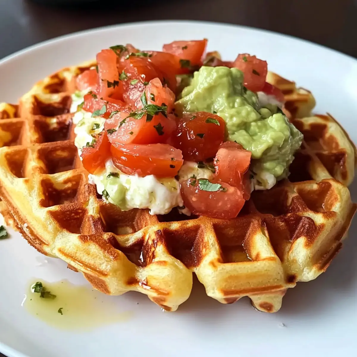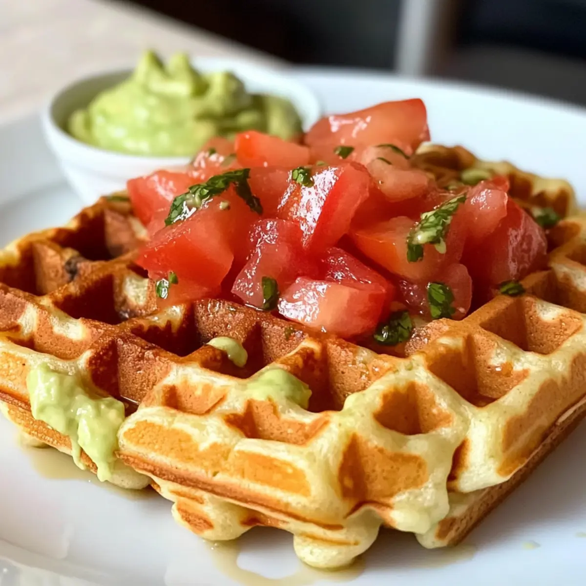 Servieren Sie die Waffeln mit einem cremigen Avocado-Dip oder wählen Sie andere Beilagen nach Geschmack.