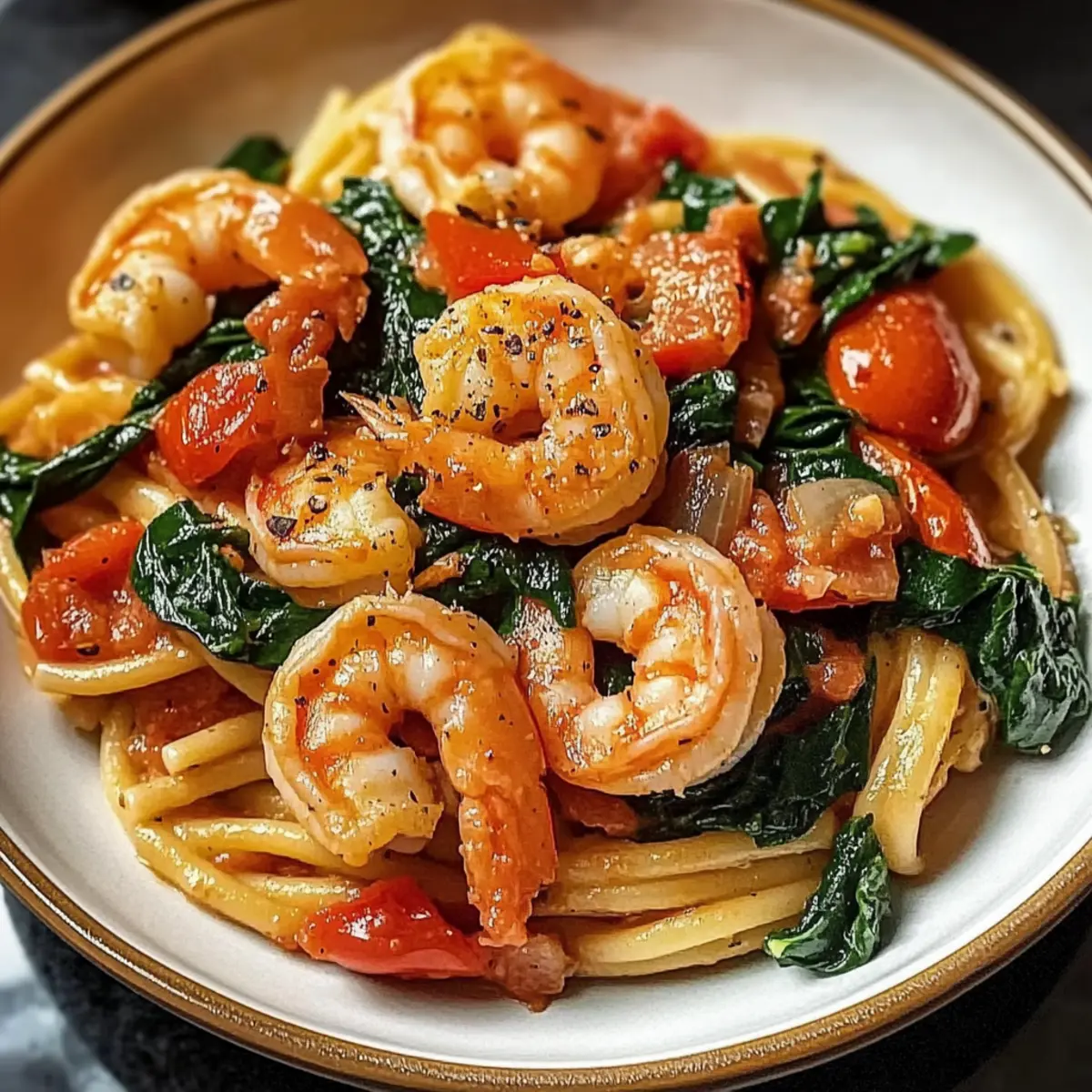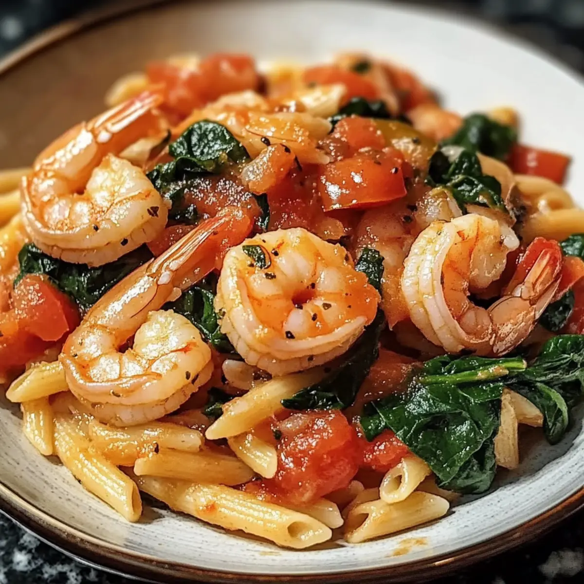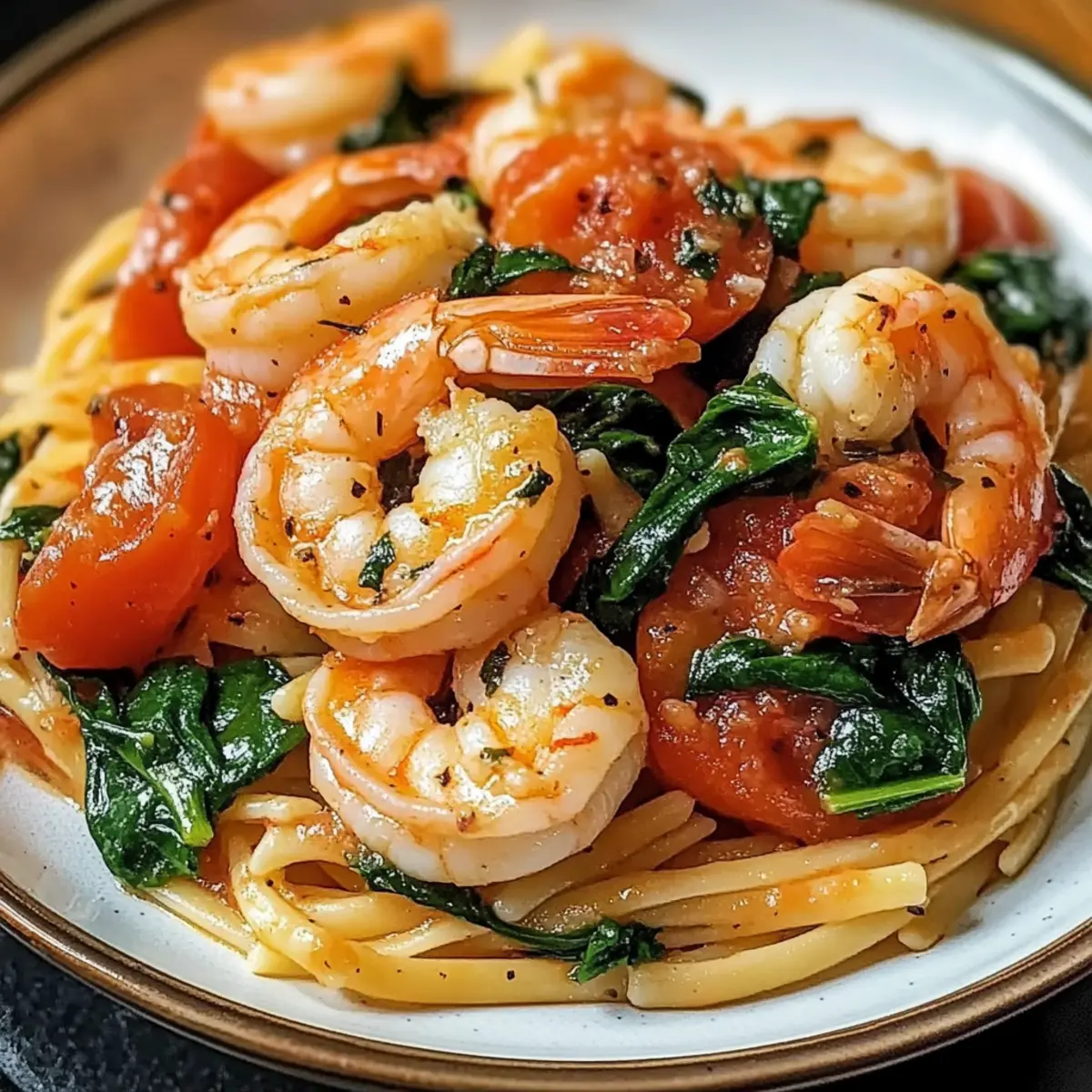 In meiner kleinen Küche riecht es heute nach einem mediterranen Traum. Wenn der Duft von frischem Knoblauch und sautierten Garnelen den Raum erfüllt, kann ich mich kaum zurückhalten. Unser Rezept für Tomaten Spinat Garnelen Pasta ist eine wunderbare Möglichkeit, den Feierabend zu gestalten und gleichzeitig das Gefühl von Urlaub am Meer zu genießen. Dieses schnelle und unkomplizierte Gericht ist nicht nur ideal für stressige Wochentage, sondern auch ein echter Hingucker bei einem entspannten Abendessen mit Freunden. Mit nährstoffreichem Spinat, saftigen Tomaten und zarten Garnelen vereint es gesunde Zutaten in einem schmackhaften Rezept. Und das Beste daran? Du kannst es in weniger als 30 Minuten zubereiten. Bist du bereit, deine Küche in eine kleine mediterrane Oase zu verwandeln? Warum wirst du dieses Rezept lieben? Fleischige Garnelen und frisches Gemüse vereinen sich in einer schnellen und gesunden Mahlzeit. Mediterraner Genuss ist garantiert, während du in weniger als 30 Minuten dieses Gericht zubereitest! Vielseitig in den Variationen, kannst du nach Belieben weitere Gemüse dazugeben oder die Garnelen durch Hähnchen ersetzen. Perfekt für Arrangement: Serviere die Pasta mit einem frischen Salat oder knusprigem Knoblauchbrot für ein rundum gelungenes Dinner. Ein Rezept für jeden Anlass, das sicherlich auch deine Gäste begeistern wird! Zutaten für Tomaten Spinat Garnelen Pasta • Die Zutaten sind einfach zu finden und sorgen für ein schnelles, gesundes Gericht! Für die Garnelen Garnelen – sorgt für reichlich Protein und einen süßlichen, salzigen Geschmack; verwende frische oder gefrorene, die bereits geschält und entdarmt sind. Für das Gemüse Spinat – bringt lebendige Farbe und Nährstoffe; du kannst auch Grünkohl oder Rucola verwenden, wenn du eine andere Geschmacksrichtung wünschst. Tomaten – fügen Saftigkeit und Säure hinzu; frische oder gehackte Tomaten aus der Dose funktionieren gut; Kirschtomaten bieten einen süßen Biss. Knoblauch – verleiht das grundlegende aromatische Profil; frischer Knoblauch ist am intensivsten, aber du kannst auch Knoblauchpulver verwenden. Für die Pasta Pasta – bildet die Grundlage des Gerichts; jede Pasta ist geeignet; ganze Weizen- oder glutenfreie Varianten sind ebenfalls eine Option. Olivenöl – bestens geeignet zum Anbraten und verleiht dem Gericht Reichhaltigkeit; du kannst es durch Butter ersetzen, wenn du das bevorzugst. Für die Würze Rote Paprika-Flocken – optional, sorgt für eine schärfere Note; lasse sie weg oder ersetze sie durch schwarzen Pfeffer für einen milderen Geschmack. Parmesankäse – sorgt für einen salzigen, käsigen Abschluss; optional, verbessert jedoch den Geschmack; veganer Käse ist auch eine gute Alternative. Schritt-für-Schritt-Anleitung für Tomaten Spinat Garnelen Pasta Step 1: Pasta kochen Bringe in einem großen Topf ausreichend Salzwasser zum Kochen und koche die Pasta gemäß der Packungsanweisung al dente, normalerweise etwa 8–10 Minuten. Rühre gelegentlich um, damit die Pasta nicht zusammenklebt. Sobald die Pasta fertig ist, lasse sie abtropfen und stelle sie beiseite, während du die Sauce zubereitest. Step 2: Knoblauch anbraten Erhitze in einer großen Pfanne bei mittlerer Hitze etwa 2 Esslöffel Olivenöl. Füge den fein gehackten Knoblauch hinzu und brate ihn für 1–2 Minuten an, bis er goldbraun und aromatisch ist. Achte darauf, dass er nicht anbrennt, da verbrannter Knoblauch bitter schmeckt. Der Duft sollte bereits verlockend sein und deine Küche erfüllen. Step 3: Garnelen hinzufügen Gib die vorbereiteten Garnelen in die Pfanne und brate sie für 3–4 Minuten, bis sie rosa und undurchsichtig sind. Wende die Garnelen während des Bratens, damit sie gleichmäßig garen. Die Garnelen sollten plump und zart sein, bevor du mit dem nächsten Schritt fortfährst. Step 4: Tomaten einrühren Jetzt ist es an der Zeit, die frischen oder gehackten Tomaten hinzuzufügen. Rühre die Tomaten für etwa 2 Minuten ein, bis sie leicht weich werden und ihre Säfte freisetzen. Du solltest einen aromatischen Duft wahrnehmen, wenn die Tomaten mit den Garnelen und dem Knoblauch verschmelzen. Step 5: Spinat hinzufügen Gib den frischen Spinat in die Pfanne und koche ihn unter Rühren für etwa 1 Minute, bis er zusammenfällt. Achte darauf, nicht zu lange zu kochen, damit der Spinat seine leuchtende Farbe und wertvollen Nährstoffe behält. Die Mischung sollte jetzt farbenfroh und einladend aussehen. Step 6: Pasta untermischen Füge die vorgekochte Pasta direkt in die Pfanne mit der Garnelen-Tomaten-Spinat-Mischung hinzu. Mische alles gut durch, sodass die Pasta gleichmäßig mit der Sauce überzogen wird und die Aromen sich gut vermischen. Lass die Zutaten für 1–2 Minuten zusammen erhitzen, während du sanft umrührst. Step 7: Würzen und servieren Verleihe deiner Tomaten Spinat Garnelen Pasta nach Belieben mit roten Paprika-Flocken etwas Schärfe und würze mit Pfeffer und Salz. Rühre alles noch einmal gut um, bevor du die Pasta auf Tellern anrichtest. Toppe sie mit frisch geriebenem Parmesan, um den letzten Schliff hinzuzufügen und genieße dieses köstliche Gericht! Meal Prep für Tomaten Spinat Garnelen Pasta Die Tomaten Spinat Garnelen Pasta ist perfekt für das Vorbereiten im Voraus! Du kannst die Garnelen über Nacht (bis zu 24 Stunden) marinieren, um ihren Geschmack zu intensivieren. Außerdem kannst du die Pasta vorkochen und im Kühlschrank aufbewahren – so bleibt sie bis zu 3 Tage frisch. Um die Qualität zu erhalten, empfehle ich, die Garnelen erst kurz vor dem Servieren zu garen, damit sie zart und saftig bleiben. Wenn du bereit bist zu essen, brate einfach den Knoblauch, füge die vorbereiteten Zutaten hinzu und gib die vorgekochte Pasta dazu. In nur wenigen Minuten hast du ein schnelles, schmackhaftes Gericht, das genau so köstlich schmeckt wie frisch zubereitet! Expertentipps für Tomaten Spinat Garnelen Pasta Garnelen richtig garen: Achte darauf, 