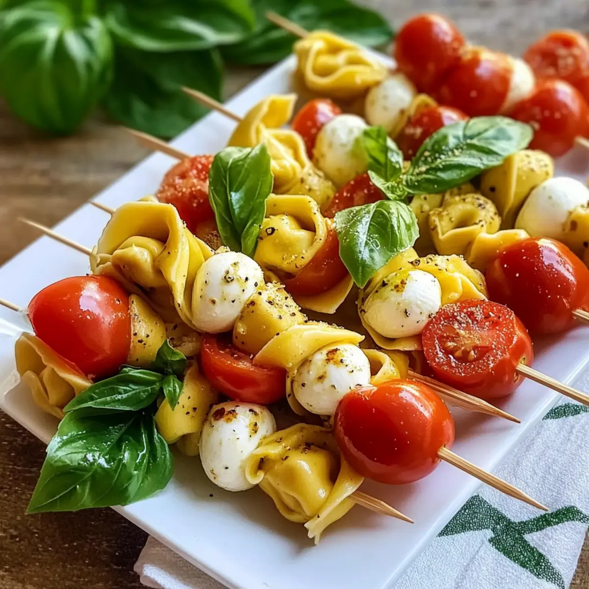 • Präsentation: Arrangiere die Tortellini Spieße auf einer schönen Platte und füge einen Balsamico-Glaze hinzu, um sie optisch ansprechender zu machen – ein echter Hingucker für jedes Buffet!