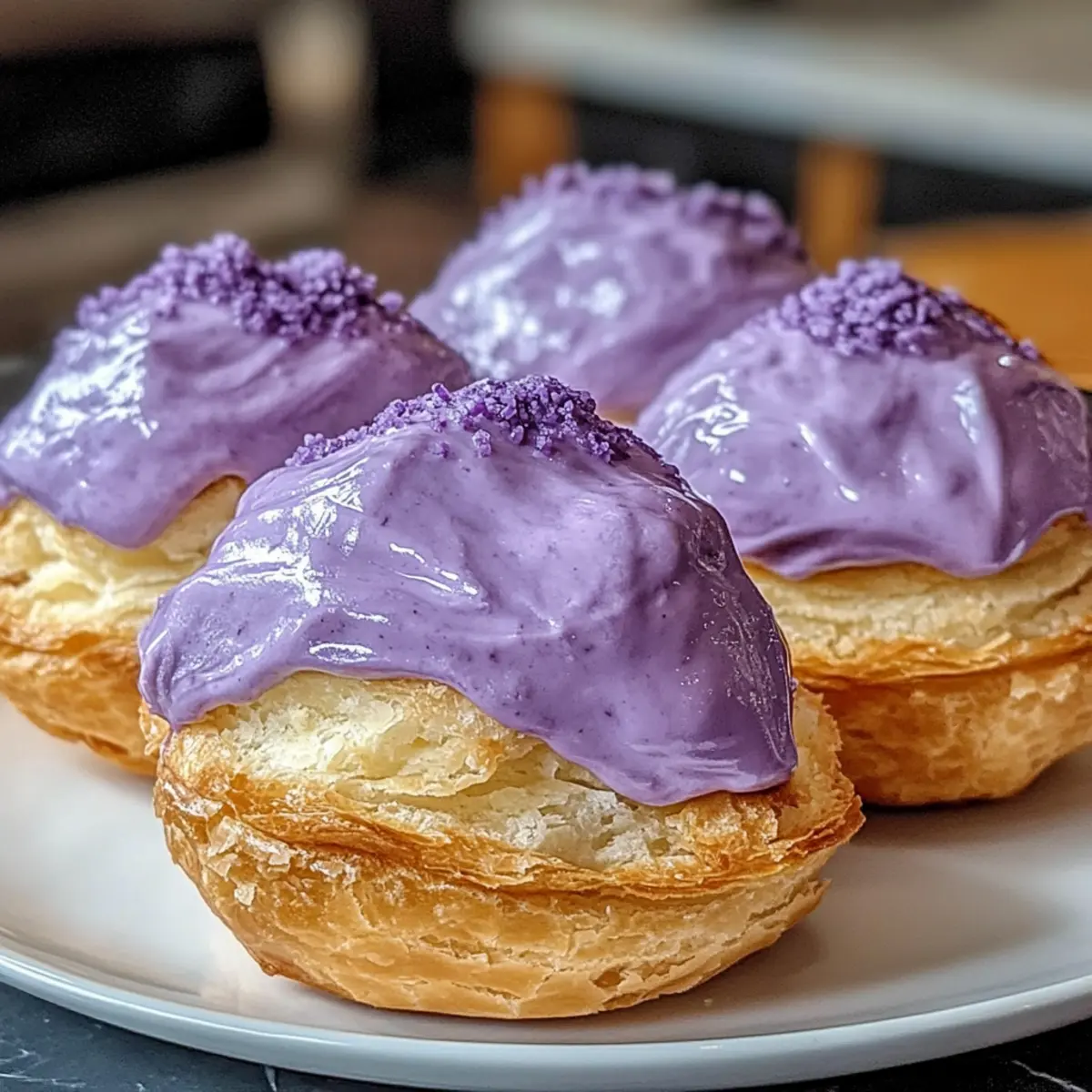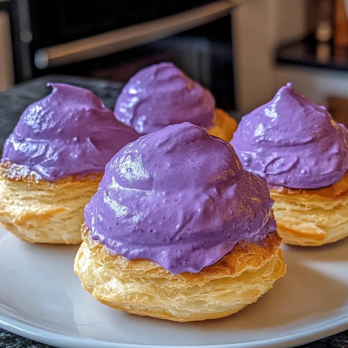 Während ich in der Küche stand und die leuchtend lila Ube-Cremepuffs zubereitete, überkam mich eine Welle der Freude. Diese kleinen Köstlichkeiten sind nicht nur ein Augenschmaus, sondern auch ein wunderbares Erlebnis, das die Aromen der Philippinen vereint. Mit einem knusprigen Craquelin-Topping und luftigen Hüllen, die mit einer seidigen Ube-Custard gefüllt sind, sind diese Ube-Cremepuffs perfekt für jeden Anlass. Sie sind schnell zubereitet und bringen einen Hauch von Exotik in jede Kaffeepause oder Feier. Die leuchtende Farbe und der unverwechselbare Geschmack machen sie zu einem absoluten Hit für alle, die sich nach authentischen, asiatisch inspirierten Desserts sehnen. Wer könnte da widerstehen? Lass uns gemeinsam in die faszinierende Welt dieser unwiderstehlichen Süßigkeiten eintauchen und entdecken, wie einfach es ist, sie selbst herzustellen! Warum sind Ube-Cremepuffs so unwiderstehlich? Einzigartiger Geschmack: Die Kombination aus der cremigen Ube-Custard und dem knusprigen Craquelin-Topping sorgt für ein Geschmackserlebnis, das unverwechselbar ist. Einfachheit: Die Zubereitung dieser Köstlichkeiten erfordert nur grundlegende Backfähigkeiten und wenig Zeit. Farbe und Stil: Die leuchtend lila Farbe der Ube macht sie zum perfekten Hingucker für jede Feierlichkeit. Vielseitig einsetzbar: Diese Ube-Cremepuffs sind nicht nur für besondere Anlässe geeignet, sondern auch eine wunderbare Belohnung für einen gemütlichen Nachmittagskaffee. Herzhaft und süß: Diese kleinen Leckerbissen kombinieren die süße Cremigkeit mit dem herzhaften Crunch der Teighülle, was sie zu einem Hit bei jedem macht. Genießen Sie diese innovativen Ube-Cremepuffs und erleben Sie die Aromen der Philippinen in jedem Bissen! Zutaten für Ube-Cremepuffs • Diese Zutaten sind die Basis für deine köstlichen Ube-Cremepuffs, die deine Gäste begeistern werden! Für den Teig Allzweckmehl – Sorgt für die Struktur des Choux-Teigs; darauf achten, dass es gesiebt wird für eine glatte Konsistenz. Butter – Fügt Reichtum und Feuchtigkeit hinzu; ungesalzene Butter bietet besseren Geschmackskontrolle. Eier – Sorgen durch Dampf für den Auftrieb des Gebäcks; verwenden Sie große Eier in Zimmertemperatur für die besten Ergebnisse. Wasser – Hilft, Dampf zu erzeugen, um die Puffs aufzublähen; frisches und sauberes Wasser ist entscheidend. Für die Ube-Custard Ube-Extrakt – Verleiht der Füllung ihre charakteristische lila Farbe und den einzigartigen Geschmack; vanilleshaltiger Extrakt kann verwendet werden, aber verändert Geschmack und Farbe. Zucker – Sorgt für die Süße der Crema; die Menge kann reduziert werden, wenn eine weniger süße Variante gewünscht ist. Milch – Trägt zur cremigen Textur der Füllung bei; Alternativen zu Milch können für eine milchfreie Version verwendet werden. Bereite dich darauf vor, deine eigenen Ube-Cremepuffs zu kreieren und die köstlichen Aromen der Philippinen zu erleben! Schritt-für-Schritt-Anleitungen für Ube-Cremepuffs Step 1: Choux-Teig zubereiten In einem Topf Wasser, Butter und eine Prise Salz zum Kochen bringen. Sobald die Mischung kocht, das gesiebte Allzweckmehl auf einmal hinzufügen und kräftig rühren, bis sich ein fester Teigball bildet, der sich von den Seiten löst. Vom Herd nehmen und kurz abkühlen lassen, bevor nacheinander die Eier hinzuzufügen und gut zu vermischen, bis der Teig glatt und glänzend ist. Step 2: Piping und Backen Den Backofen auf 200°C vorheizen und Backbleche mit Backpapier auslegen. Mit einem Spritzbeutel den Teig in gleichmäßige, runde Häufchen auf die Bleche spritzen, dabei genügend Abstand halten. Die Ube-Cremepuffs ca. 25 Minuten backen, bis sie aufgegangen und goldbraun sind; sie sollten beim Klopfen leicht hohl klingen. Step 3: Ube-Custard-Füllung herstellen In einer Schüssel Zucker und Eigelbe gut verquirlen. Dann Ube-Extrakt und Milch hinzufügen und in einem Topf unter ständigem Rühren erhitzen, bis die Mischung eindickt und eine cremige Konsistenz erreicht. Achte darauf, dass die Custard nicht zu stark kocht, um ein Gerinnen zu vermeiden; dauerhafte Rührung hilft, eine glatte Textur zu behalten. Step 4: Cremepuffs füllen Sobald die Ube-Cremepuffs komplett abgekühlt sind, einen Spritzbeutel mit der vorbereiteten Ube-Custard-Füllung füllen. An einer Seitenfläche ein kleines Loch einstechen und die Füllung vorsichtig hineinspritzen, bis die Puffs leicht gefüllt sind. Fülle die Puffs am besten kurz vor dem Servieren, um ihre Knusprigkeit zu bewahren. Ube-Cremepuffs effizient im Voraus vorbereiten Die Zubereitung von Ube-Cremepuffs ist perfekt für alle, die ihre Zeit in der Küche optimal nutzen möchten! Der Choux-Teig kann bis zu 24 Stunden im Voraus zubereitet und in einem luftdichten Behälter im Kühlschrank aufbewahrt werden, um eine hervorragende Qualität zu gewährleisten. Wenn du die Puffs backst, lasse sie vollständig abkühlen und lagere sie bis zu 2 Tagen in einem luftdichten Behälter, damit sie ihre Knusprigkeit bewahren. Die Ube-Custard-Füllung kann ebenfalls im Voraus zubereitet und bis zu 3 Tage im Kühlschrank aufbewahrt werden. Achte darauf, sie in einem gut verschlossenen Behälter zu lagern, um ein Ausdrehen und die Bildung einer Haut zu vermeiden. Wenn es Zeit ist zu servieren, fülle die Puffs kurz vor dem Verzehr, um die frischeste Textur zu garantieren und einen himmlischen Genuss zu erleben! Ube-Cremepuffs nach Wunsch variieren Kreiere deine eigenen Ube-Cremepuffs mit diesen tollen Variationen, die den Geschmack und die Textur verändern! Dairy-Free: Ersetze die Milch durch eine pflanzliche Alternative wie Mandel- oder Kokosmilch für eine milchfreie Option. Schokoladige Versuchung: Füge Kakaopulver zum Choux-Teig hinzu, um einen schokoladigen Twist zu erzielen. Dies bringt eine neue Dimension in die Klassiker! Klassische Vanille: Tausche den Ube-Extrakt durch Vanilleextrakt aus, um einen klassischen Geschmack zu erreichen, der ebenfalls köstlich ist. 