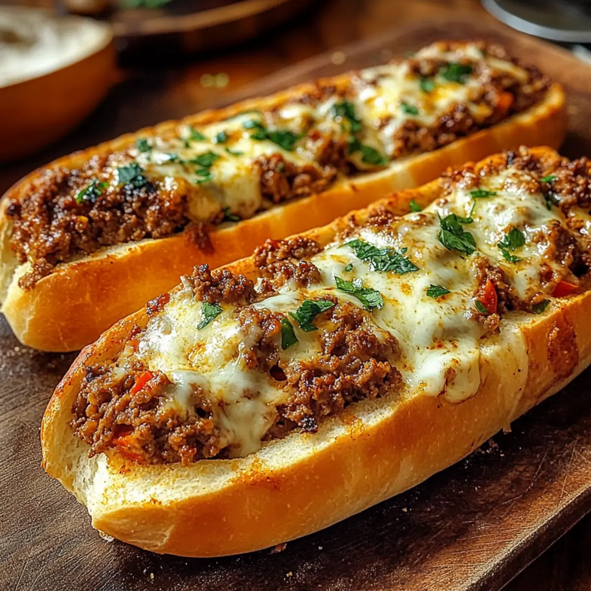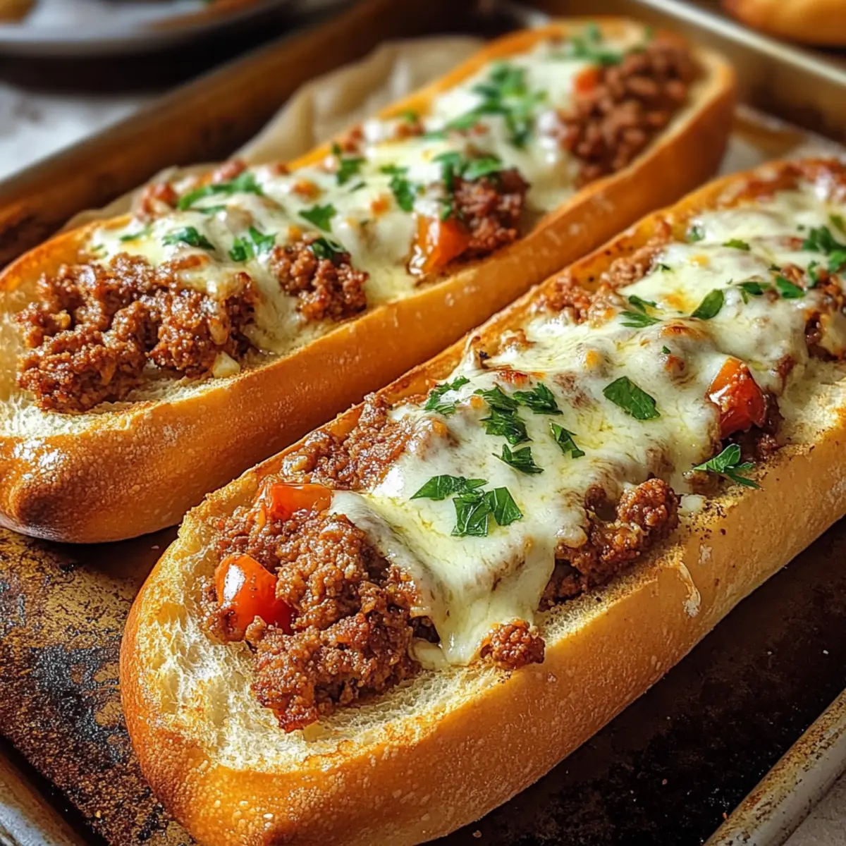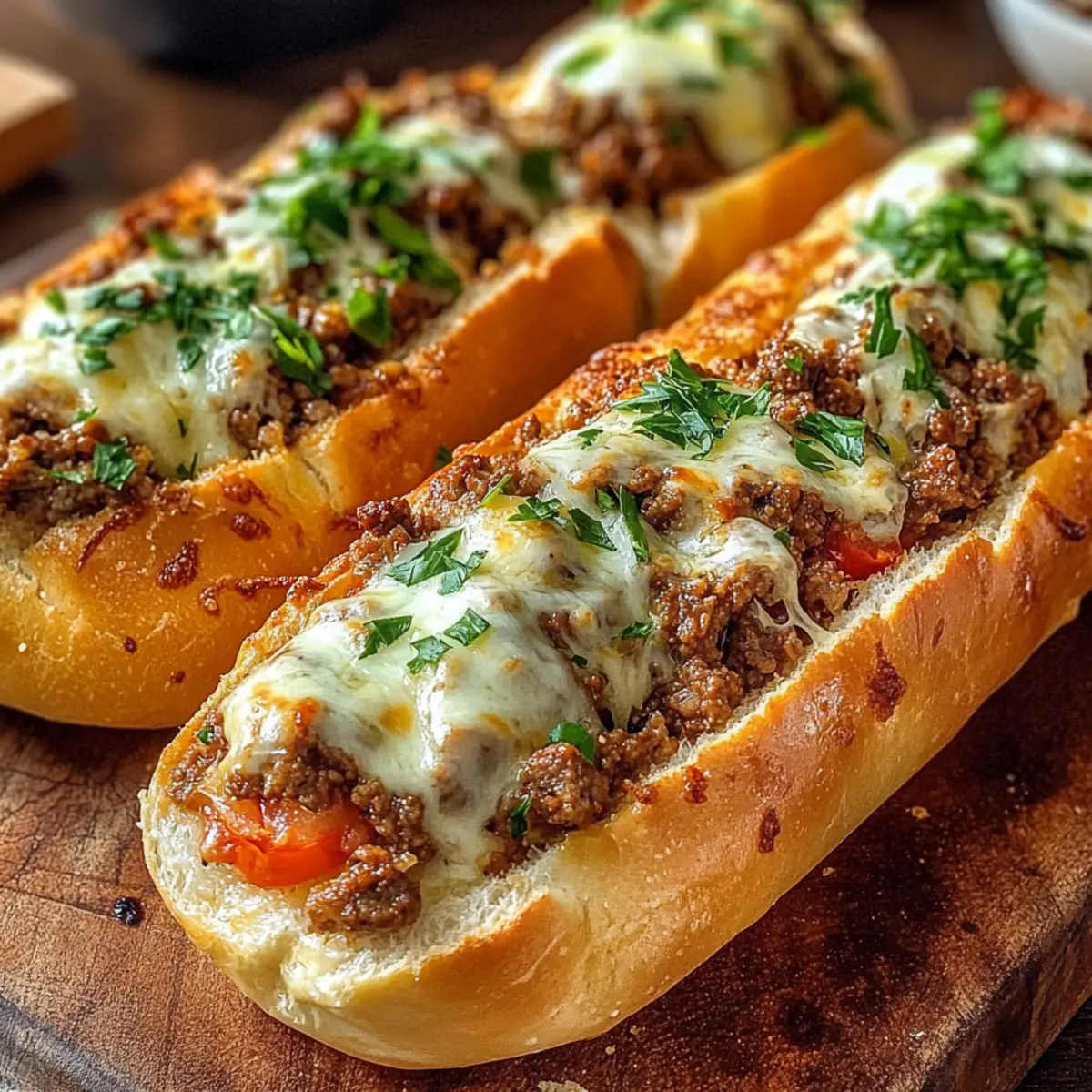 Wenn ich an gemütliche Abende mit Familie und Freunden denke, kommen mir sofort die köstlichen Überbackenen Hackfleisch-Baguettes in den Sinn. Sie sind die perfekte Kombination aus einem knackigen Brot und einer herzhaften, saftigen Füllung, die gut für jeden Feierabend geeignet ist. Diese Baguettes sind nicht nur ein absoluter Genuss, sondern auch ein cleveres Anti-Soggy-Rezept, das dafür sorgt, dass dein Brot bis zum letzten Biss knusprig bleibt. Mit ihrem mediterranen Flair bringen sie Urlaubsgelüste auf den Tisch und sind im Handumdrehen zubereitet! Lust auf eine köstliche, einfach nachzukochen, die jeder lieben wird? Warum sind Überbackene Hackfleisch-Baguettes so lecker? Herzhaft und befriedigend: Diese Baguettes sind vollgepackt mit würzigem Rinderhackfleisch und mit geschmolzenem Käse überbacken, was sie zu einem echten Gaumenschmaus macht. Crispy Genuss: Die spezielle Backtechnik sorgt für eine perfekt knackige Oberfläche, während das Innere saftig bleibt – einfach unwiderstehlich! Mediterranes Flair: Mit Zutaten wie Oregano und Knoblauch erleben Sie eine geschmackliche Reise, die Ferienstimmung auf den Teller bringt. Schnell zubereitet: In weniger als 30 Minuten können Sie diese delikaten Baguettes zaubern – ideal für stressige Wochentage oder unerwartete Gäste. Vielfältige Variation: Ob mit vegetarischem Hack oder anderen Käsesorten – experimentieren Sie nach Herzenslust . Probieren Sie diese Überbackenen Hackfleisch-Baguettes aus und überzeugen Sie sich selbst von ihrem köstlichen Aroma und der einfachen Zubereitung! Überbackene Hackfleisch-Baguettes Zutaten Entdecken Sie die köstlichen Zutaten, die diese Überbackenen Hackfleisch-Baguettes zu einem wahren Genuss machen! Für die Baguettes • Baguettes oder Ciabatta – Diese dienen als knuspriger Grundstock für die herzhaften Füllung. Zwei kleine Baguettes oder Ciabatta sind ideal. Für die Füllung • Rinderhackfleisch – Sorgt für einen reichhaltigen Geschmack und eine gute Portion Protein; verwenden Sie mageres Hackfleisch, um überschüssiges Fett zu vermeiden. • Zwiebel – Bringt Süße und Tiefe durch das Sautieren; die geschmackliche Grundlage für Ihr Gericht. • Knoblauch – Verleiht dem Rinderhack viel Aroma; ein Muss für Liebhaber der mediterranen Küche. • Gehackte Tomaten – Bilden die saftige Basis der Füllung und sorgen für einen intensiv leckeren Geschmack. • Tomatenmark – Verstärkt die Reichhaltigkeit der Füllung und sorgt für ein geschmackvolles Finish. • Gemüsebrühe – Fügt der Füllung zusätzliche Tiefe und Geschmack hinzu; auch eine gute Basis für die Saucen. • Oregano – Ist das Herzstück des mediterranen Geschmacks; ein wenig bringt den Urlaub auf den Tisch. • Salz und Pfeffer – Zum Abschmecken; gerne nach eigenem Geschmack anpassen. Für den Belag • Mozzarella – Ideal zum Schmelzen und für eine goldene, knusprige Kruste; kann durch jede gute Schmelzkäse-Variante ersetzt werden. • Frische Petersilie – Bringt einen Hauch von Frische und Farbe als Garnitur; perfekt für das Auge und den Gaumen. Schritt-für-Schritt-Anleitung für Überbackene Hackfleisch-Baguettes Step 1: Ofen vorheizen Heize deinen Ofen auf 200 °C (Ober-/Unterhitze) vor. Dies sorgt dafür, dass die Überbackenen Hackfleisch-Baguettes gleichmäßig gebacken werden und eine schön knusprige Oberfläche erhalten. Während der Ofen aufheizt, kannst du die Baguettes vorbereiten und den restlichen Vorbereitungen nachgehen. Step 2: Baguettes vorbereiten Halbiere die Baguettes der Länge nach und höhle etwas vom Innenbrot aus, um Platz für die Füllung zu schaffen. Achte darauf, dass du die äußere Kruste unversehrt lässt, damit sie beim Backen knusprig bleibt. Leg die vorbereiteten Baguettehälften auf ein Backblech, sodass sie bereit für das Vorbacken sind. Step 3: Baguettes vorbacken Backe die halben Baguettes 5-7 Minuten lang im vorgeheizten Ofen, bis sie leicht gebräunt und knusprig sind. Diese Vorbackzeit stellt sicher, dass die Baguettes nicht durch die Füllung matschig werden. Nimm sie danach aus dem Ofen und lass sie kurz abkühlen. Step 4: Hackfleisch anbraten Erhitze in einer Pfanne bei mittlerer Hitze etwas Öl und brate das Rinderhackfleisch an, bis es krümelig und gut durchgegart ist. Achte darauf, überschüssiges Fett abzugießen, um ein fettiges Endergebnis zu vermeiden. Dies dauert etwa 5-7 Minuten und sorgt dafür, dass das Hackfleisch schön aromatisch wird. Step 5: Zwiebel und Knoblauch hinzufügen Füge die gehackten Zwiebeln und den Knoblauch zum angebratenen Hackfleisch hinzu. Sautiere alles zusammen für 2-3 Minuten, bis die Zwiebeln weich und durchsichtig geworden sind. Dies bringt zusätzliches Aroma in die Füllung der Überbackenen Hackfleisch-Baguettes. Step 6: Tomaten und Gewürze einrühren Mische das Tomatenmark unter das Hackfleisch und lasse es kurz anbraten, um die Aromen zu intensivieren. Füge dann die gehackten Tomaten und die Gemüsebrühe hinzu, gefolgt von Oregano, Salz und Pfeffer. Lasse die Mischung 10-15 Minuten lang köcheln, bis sie eingedickt ist und die Aromen sich gut miteinander verbunden haben. Step 7: Baguettes füllen Verteile die herzhafte Füllung großzügig auf den vorgebackenen Baguettehälften. Achte darauf, die Baguettes nicht zu überfüllen, um ein Überlaufen während des Backens zu verhindern. Diese leckeren Überbackenen Hackfleisch-Baguettes sollten ordentlich und ansprechend gefüllt sein. Step 8: Mit Käse bestreuen Streue den geriebenen Mozzarella gleichmäßig über die gefüllten Baguettehälften. Dieser sorgt für eine schmelzende, goldene Kruste, die die Baguettes perfekt abrundet. Wenn du Vielfalt magst, kannst du auch andere Käsesorten mischen, um einen ausgefallenen Geschmack zu erzielen. Step 9: Fertig backen Backe die gefüllten Baguettes für weitere 10-12 Minuten, bis der Käse sprudelt und goldbraun ist. Achte darauf, sie nicht zu lange im Ofen zu lassen, um ein Austrocknen 