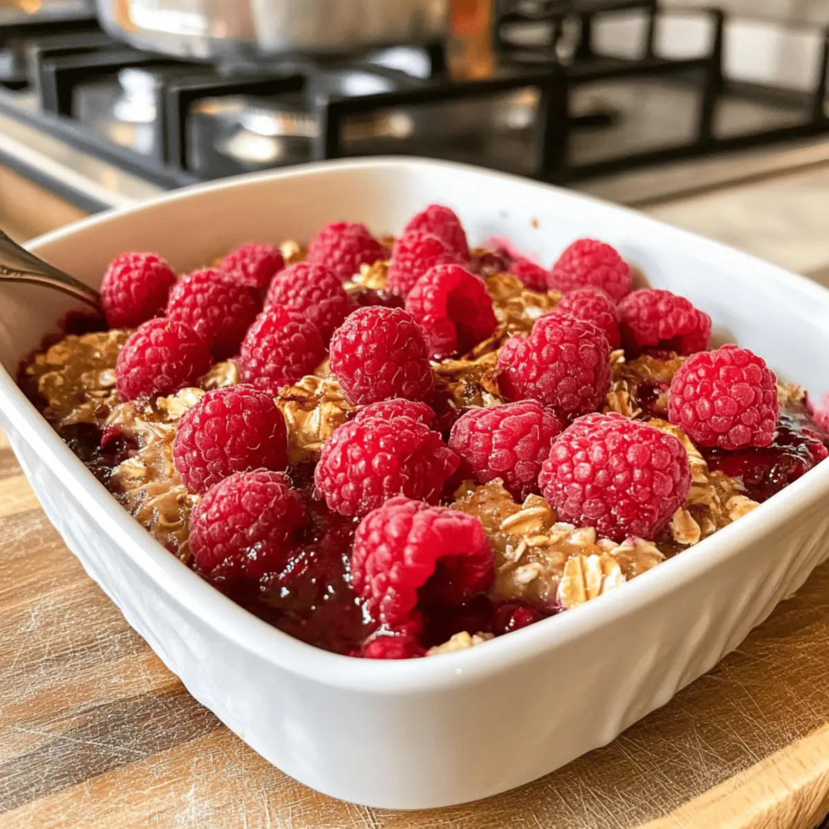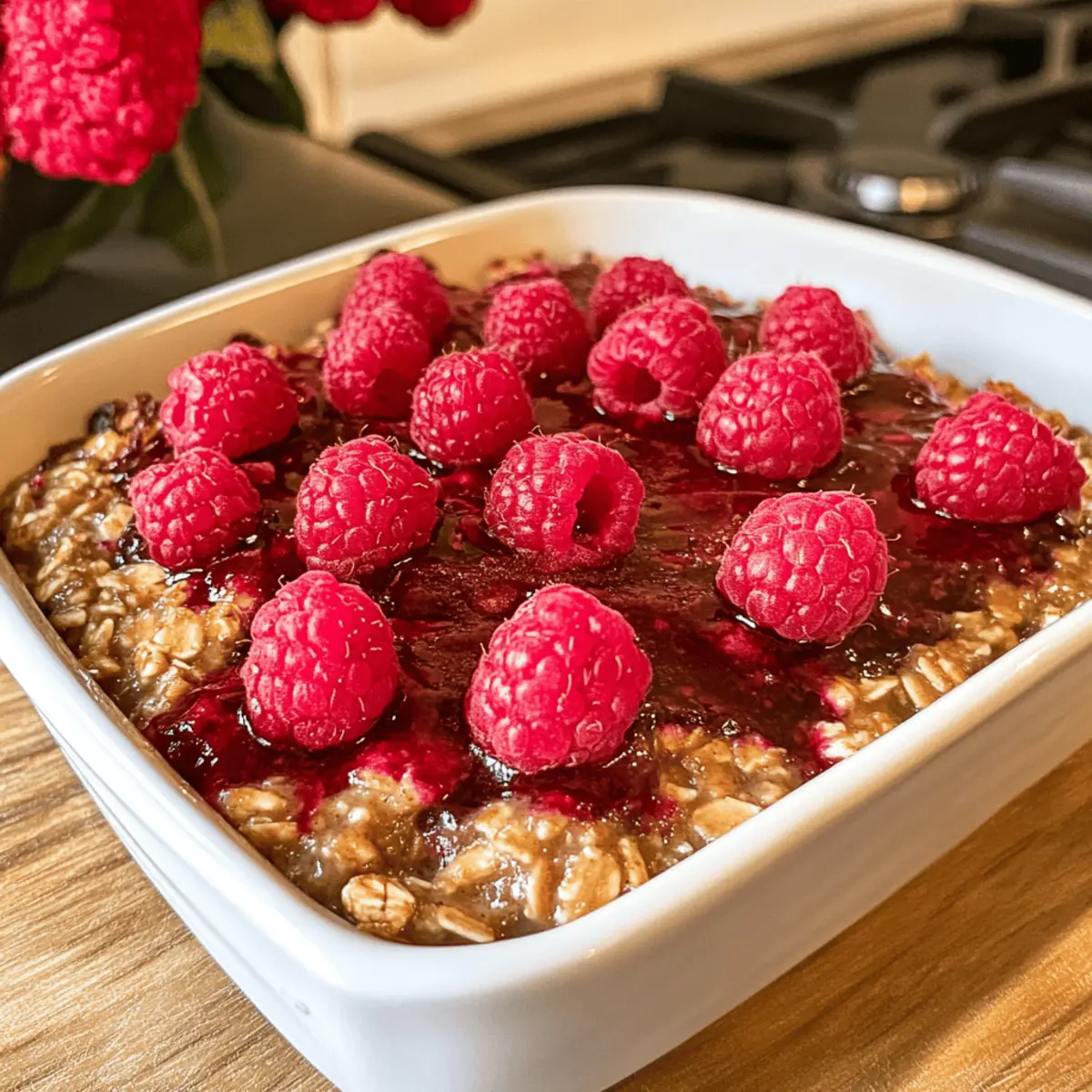 Genießen Sie gesunde, vegane gebackene Haferflocken mit Himbeeren, perfekt für ein energiereiches Frühstück.