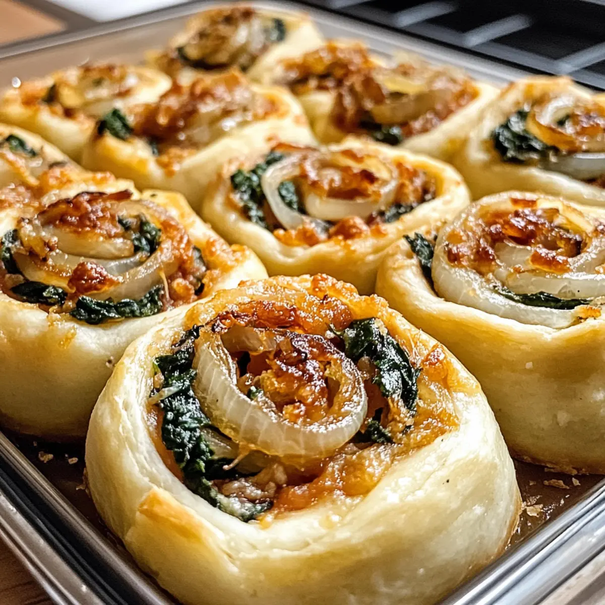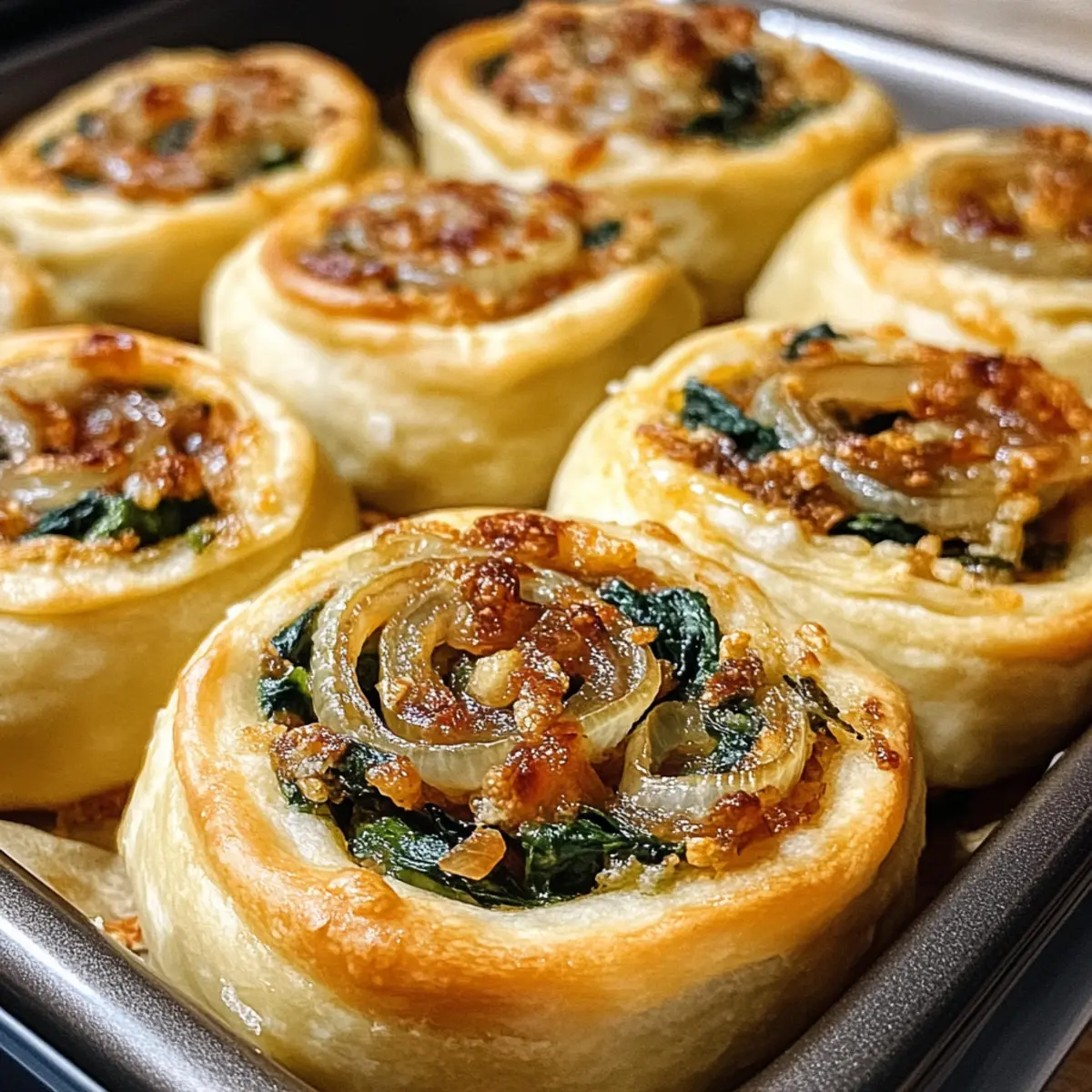 Letztes Wochenende saß ich mit Freunden zusammen und bemerkte, wie sehr sie nach einer herzhaften Leckerei verlangten. Genau in diesem Moment kamen mir die Ideen für meine vegane karamellisierte Zwiebel- und Spinat-Pizzarollen! Diese fluffigen, goldbraunen Rollen sind nicht nur das perfekte Fingerfood für die nächste Party, sondern auch eine köstliche Möglichkeit, sich von Fast Food zu verabschieden. Gefüllt mit süßen, karamellisierten Zwiebeln und würzigem Spinat, gepaart mit einer Note von marinara, wurden sie im Handumdrehen zum Star unseres Buffets. Ein weiteres Plus: Sie sind einfach zuzubereiten und lassen sich hervorragend vorbereiten – ideal für alle, die gesund kochen und dabei auf Genuss nicht verzichten möchten. Lust auf ein neues, leckeres Rezept? weiterlesen, um zu erfahren, wie du diese unwiderstehlichen Pizzarollen selbst zaubern kannst! Warum sind diese Pizzarollen unverzichtbar? Einfachheit: Die Zubereitung ist kinderleicht und erfordert keine aufwendigen Kochkünste, sodass du dich ganz auf den Genuss konzentrieren kannst. Herzhafter Geschmack: Die Kombination aus süßen, karamellisierten Zwiebeln und würzigem Spinat bringt einen unvergleichlichen Geschmack in die Rollen, der deine Geschmacksknospen begeistert. Vielseitigkeit: Du kannst die Füllung ganz nach deinem Geschmack variieren! Warum nicht mal mit Waffel Sandwich Mit experimentieren? Perfekt zum Teilen: Ob als Appetizer auf deiner nächsten Feier oder als Snack für gemütliche Abende – diese Pizzarollen sind der Hit bei jedem Anlass! Zeitsparend: Ideal für Meal Prep – bereite sie vor und backe sie einfach frisch, wenn die Lust auf einen herzhaften Snack kommt! Vegane karamellisierte Zwiebel- und Spinat-Pizzarollen Zutaten • Diese Zutaten sind der Schlüssel zu unwiderstehlichen veganen karamellisierten Zwiebel- und Spinat-Pizzarollen! Für den Teig Allzweckmehl – bildet die Struktur des Teigs; du kannst auch eine glutenfreie Mehlmischung mit Xanthan verwenden. Warmes Wasser – aktiviert die Hefe und hydratisiert den Teig. Aktive Trockenhefe – sorgt dafür, dass der Teig aufgeht. Olivenöl – verleiht dem Teig Feuchtigkeit und Geschmack. Salz – intensiviert das Aroma. Für die Füllung Karamellisierte Zwiebeln – bringen eine süße, reichhaltige Note; achte darauf, sie langsam zu garen. Spinat – bietet einen erdigen Geschmack und viele Nährstoffe; ihn mit Knoblauch anbraten macht ihn noch besser! Nährhefe (optional) – verleiht eine käsige Geschmacksnote. Marinara-Sauce – fügt Säure hinzu, um die Süße der Zwiebeln auszugleichen; wähle eine dicke, gut gewürzte Variante, um ein Durchweichen zu vermeiden. Erlebe, wie einfach es sein kann, köstliche vegane Pizzarollen aus frischen, hochwertigen Zutaten zuzubereiten! Step-by-Step Instructions for Vegane karamellisierte Zwiebel- und Spinat-Pizzarollen Step 1: Teig zubereiten Erwärme 240 ml Wasser und streue die aktive Trockenhefe hinein. Lass die Mischung 5–10 Minuten ruhen, bis sie schäumt. In einer großen Schüssel vermische 500 g Allzweckmehl, 2 EL Olivenöl und 1 TL Salz. Füge die Hefe-Mischung hinzu und verknete alles für etwa 8–10 Minuten, bis ein glatter Teig entsteht. Lasse den Teig zugedeckt an einem warmen Ort für 1 Stunde gehen, bis er sich verdoppelt hat. Step 2: Füllung sautieren Erhitze in einer großen Pfanne 2 EL Olivenöl bei mittlerer Hitze. Füge 2 große, in Ringe geschnittene Zwiebeln hinzu und brate sie langsam für 20–25 Minuten, bis sie tiefgolden und karamellisiert sind. Gib dann 2 Knoblauchzehen, fein gehackt, und 200 g frischen Spinat hinzu und brate alles weitere 3–4 Minuten, bis der Spinat weich ist. Lass die Mischung etwas abkühlen und vermenge sie optional mit 2 EL Nährhefe. Step 3: Teig ausrollen Sobald der Teig aufgegangen ist, punchst du ihn runter und rollst ihn auf einer leicht bemehlten Arbeitsfläche auf etwa 0,5 cm Dicke aus. Verteile gleichmäßig 250 g Marinara-Sauce über den Teig und achte darauf, die Ränder frei zu lassen. Dann verteilst du die Zwiebel-Spinat-Füllung gleichmäßig auf die Sauce, sodass jede Rolle Geschmack erhält. Step 4: Rollen und schneiden Beginne am Rand des Teigs und rolle diesen straff auf, um eine lange Rolle zu formen, und drücke die Kanten gut zusammen. Schneide die Rolle anschließend in gleichmäßige Stücke von etwa 5 cm. Platziere die Pizzarollen mit der Schnittseite nach oben in eine gefettete Auflaufform. Lasse die Rollen dann nochmals 15–20 Minuten gehen. Step 5: Backen Heize den Ofen auf 175°C (350°F) vor. Backe die Pizzarollen für 25–30 Minuten, bis sie goldbraun und knusprig an der Oberfläche sind. Sie sollten beim Klopfen auf die Unterseite hohl klingen. Nimm sie aus dem Ofen und lasse sie einige Minuten abkühlen, bevor du sie servierst, damit die Füllung sich setzen kann. Step 6: Servieren Serviere die veganen karamellisierten Zwiebel- und Spinat-Pizzarollen warm, idealerweise mit zusätzlicher Marinara-Sauce zum Dippen. Diese herzhaften Leckerbissen sind perfekt für gesellige Abende oder als leckerer Snack für zwischendurch! Lagerungstipps für vegane karamellisierte Zwiebel- und Spinat-Pizzarollen Raumtemperatur:: Die Pizzarollen sollten nicht länger als 2 Stunden bei Raumtemperatur aufbewahrt werden, um ihre Frische zu bewahren. Kühlschrank:: Bewahre die Pizzarollen in einem luftdichten Behälter im Kühlschrank auf; so bleiben sie bis zu 4 Tage genießbar. Gefrierschrank:: Du kannst die Pizzarollen vor dem Backen einfrieren; lege sie auf ein Backblech und friere sie ein, bis sie fest sind. Platziere sie dann in einem Gefrierbeutel für bis zu 2 Monate. Wiederaufwärmen:: Um die Rollen wieder aufzuwärmen, erhitze den Ofen auf 175°C (350°F) und backe sie 8–10 Minuten, bis sie warm und knusprig sind. Variationen & Alternativen für vegane karamellisierte Zwiebel- und Spinat-Pizzarollen Lass deiner Kreativität freien Lauf und passe dieses einfache Rezept nach deinem Geschmack an! Glutenfrei: Verwen