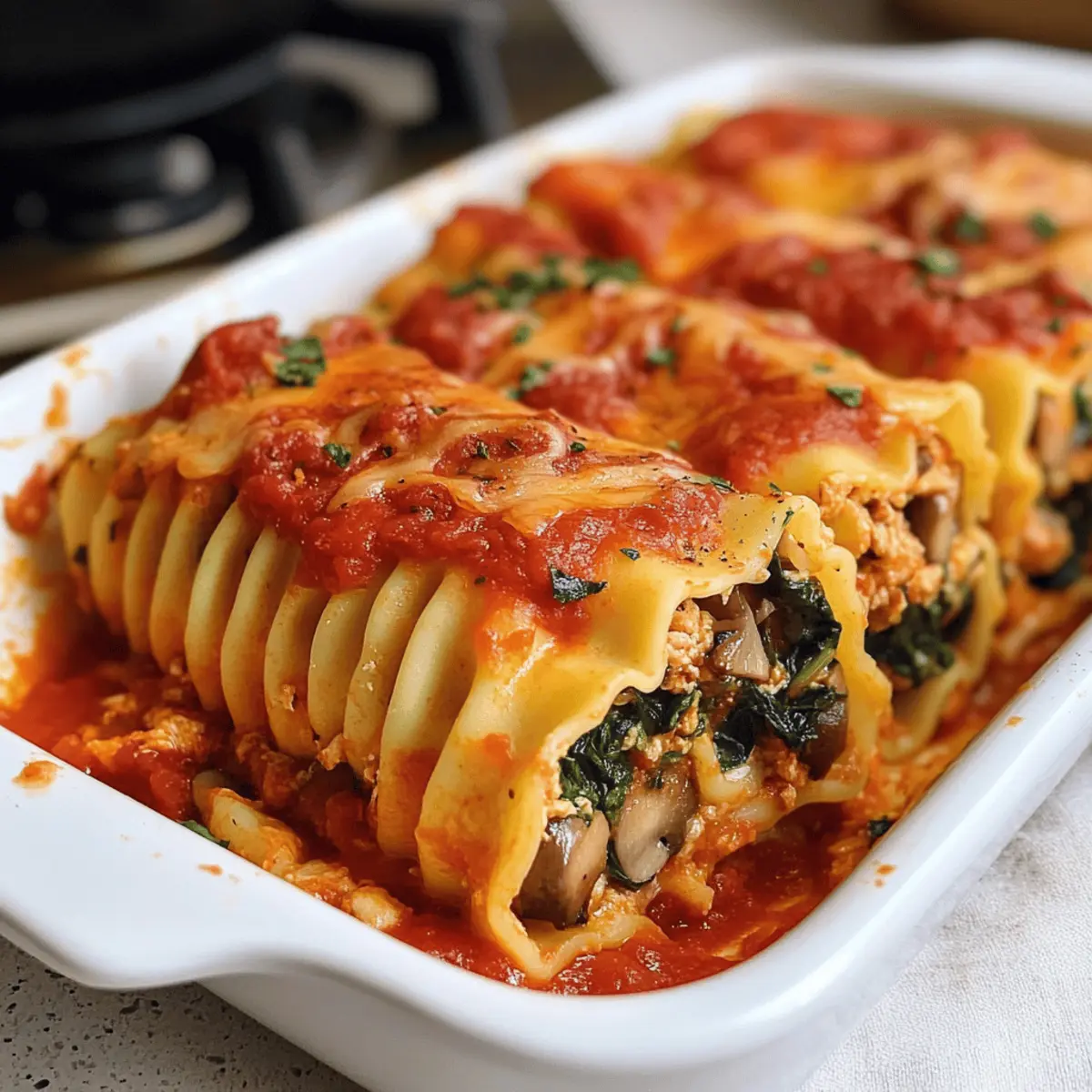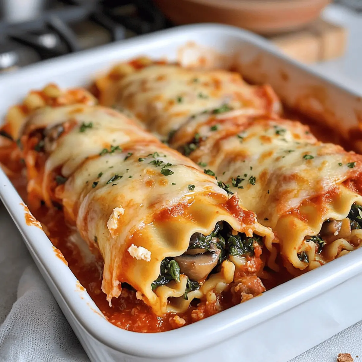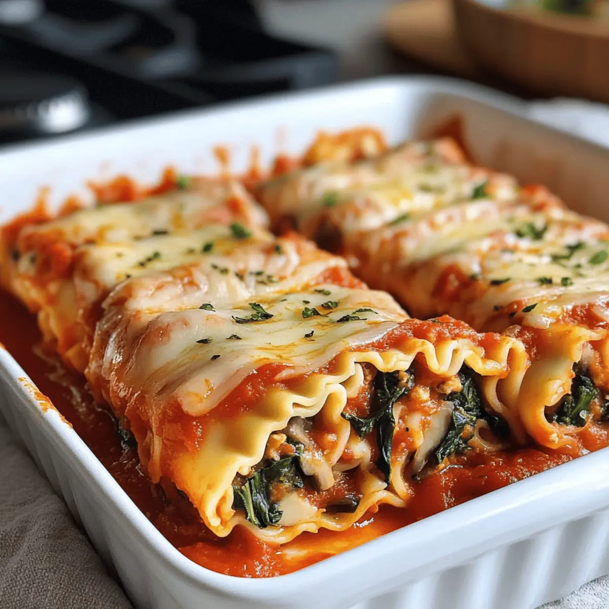 Es gibt kaum etwas Besseres, als sich in der Küche kreativ auszutoben und dabei gesunde, köstliche Gerichte zu zaubern. Heute lade ich euch ein, die unwiderstehlichen Veganen Lasagne Rollen mit Hummus, Spinat und Champignons zu entdecken. Diese alternative Version des klassischen italienischen Gerichts ist nicht nur vegan und voller Geschmack, sondern auch blitzschnell zubereitet – perfekt für einen entspannten Abend oder ein geselliges Wochenende. Diese Rollen sind ein echtes Highlight für alle, die sich nach einer gesunden, tröstlichen Mahlzeit sehnen, ohne auf Vielfalt zu verzichten. Seid ihr bereit, eure Familie oder Freunde mit diesem visuellen und geschmacklichen Genuss zu beeindrucken? Lasst uns loslegen! Warum wirst du diese Lasagne Rollen lieben? Einfachheit: Die Zubereitung ist kinderleicht und erfordert keine speziellen Kochkünste. Jeder kann mit nur wenigen Zutaten beeindruckende Ergebnisse erzielen! Köstlicher Geschmack: Die Kombination aus cremigem Hummus, frischem Spinat und herzhaften Champignons sorgt für ein Geschmackserlebnis, das sowohl vegan als auch nahrhaft ist. Vielseitigkeit: Diese Lasagne Rollen können ganz nach deinem Geschmack variiert werden – probiere zum Beispiel auch unsere leckeren Sommerrollen mit Erdnussdip als Beilage! Gesund und nahrhaft: Vollgepackt mit frischem Gemüse und gesunden Zutaten, bieten diese Rollen eine ausgewogene Mahlzeit. Schnell und praktisch: Sie sind sowohl im Voraus zubereitbar als auch gut für Reste geeignet – perfekt für stressige Wochen! Familienfreundlich: Kinder lieben die bunten und aufregenden Rollen, die ideal zum Teilen sind – perfektes Essen für gesellige Abende. Vegane Lasagne Rollen Zutaten • Um diese köstlichen Vegane Lasagne Rollen perfekt zuzubereiten, benötigst du die folgenden Zutaten. Jedes Element spielt eine wichtige Rolle in diesem schmackhaften Gericht! Für die Füllung Olivenöl – sorgt für Feuchtigkeit und Geschmack; alternativ kann jedes neutrale Öl verwendet werden. Zwiebel – bildet die aromatische Basis; ggf. mit Schalotten für einen milderen Geschmack ersetzen. Knoblauch – bringt zusätzliche Geschmackstiefe; bei Bedarf kann auch Knoblauchpulver verwendet werden. Champignons – liefern eine vollmundige Erdigkeit; Zucchini oder Paprika sind tolle Variationen. Sojasauce – fügt einen herzhaften Umami-Geschmack hinzu (glutenfrei möglich); Liquid Aminos sind eine gute Wahl für Allergiker. Frischer Spinat – bringt Farbe und Nährstoffe; alternativ kann auch Grünkohl verwendet werden. Hummus – die cremige Füllung verleiht tollen Geschmack; jede pflanzliche Aufstrichvariante funktioniert gut. Kreuzkümmel – bringt eine warme Note in die Füllung (optional); kann weggelassen werden, wenn nicht gewünscht. Paprika – fügt eine süße Note und Farbe hinzu (optional); Räucherpulver ist eine geschmackvolle Alternative. Zitronensaft – hebt die Aromen hervor (optional); Essig kann ebenfalls verwendet werden. Salz und schwarzer Pfeffer – unverzichtbare Gewürze; nach Geschmack mit weiteren Gewürzen verfeinern. Für die Lasagne Lasagne-Nudeln – die Basis der Rollen; wähle normale oder glutenfreie Varianten. No-boil-Nudeln sind ebenfalls eine praktische Option. Marinara-Sauce – sorgt für einen köstlichen Geschmack; deine Lieblings-Tomatensoße funktioniert ebenfalls hervorragend. Veganer Käse – verleiht zusätzliche Cremigkeit und bindet die Rollen; Nährhefe bietet ebenfalls einen herzhaften Käsegeschmack. Schritt-für-Schritt-Anleitung für Vegane Lasagne Rollen Step 1: Lasagne-Nudeln kochen Bringe einen großen Topf mit Wasser zum Kochen und salze es großzügig. Füge die Lasagne-Nudeln hinzu und koche sie gemäß der Anleitung auf der Verpackung, bis sie al dente sind. Dies dauert in der Regel etwa 8 bis 10 Minuten. Sobald sie gekocht sind, gieße sie ab und lasse sie kurz abkühlen, während du die Füllung vorbereitest. Step 2: Ofen vorheizen und Sauce vorbereiten Heize den Ofen auf 180 °C vor. Nimm eine Auflaufform und verteile ein Drittel der Marinara-Sauce gleichmäßig am Boden. Dies sorgt dafür, dass die Veganen Lasagne Rollen nicht ankleben und eine schöne Basis entsteht, die beim Backen für zusätzlichen Geschmack sorgt. Step 3: Füllung anbraten Erhitze in einer mittleren Pfanne bei mittlerer Hitze einen Esslöffel Olivenöl. Füge die gehackte Zwiebel sowie den Knoblauch hinzu und brate beides etwa 2 Minuten lang an, bis sie duften. Gib die in Scheiben geschnittenen Champignons dazu und brate sie für weitere 4 Minuten, bis sie weich und leicht goldbraun sind. Step 4: Spinat und Hummus hinzufügen Rühre die Sojasauce und den frischen Spinat in die Pfanne und koche alles für 30 bis 60 Sekunden weiter, bis der Spinat verwelkt ist. Nimm die Pfanne vom Herd und vermische die Mischung mit dem Hummus. Würze die Füllung nach Belieben mit Kreuzkümmel, Paprika, Salz und Pfeffer. Step 5: Lasagne Rollen formen Lege die gekochten Lasagne-Nudeln flach auf eine saubere Oberfläche. Verteile großzügig die Hummus-Spinat-Mischung über jede Nudel, bevor du sie vorsichtig von einer Seite her aufrollst. Achte darauf, dass die Füllung nicht herausquillt, und lege die Rollen mit der Nahtseite nach unten in die vorbereitete Auflaufform. Step 6: Sauce und Käse hinzufügen Gieße die restliche Marinara-Sauce gleichmäßig über die gerollten Nudeln. Streue zum Schluss den veganen Käse großzügig über die Lasagne Rollen, um eine leckere, geschmolzene Käsekruste zu erzielen. Step 7: Backen Schiebe die Auflaufform in den vorgeheizten Ofen und backe die Veganen Lasagne Rollen für etwa 20 bis 25 Minuten. Achte darauf, dass der Käse geschmolzen und blubbernd ist – das ist der perfekte Moment, um sie herauszunehmen und heiß zu servieren! Variationen & Substitutionen für Vegane Lasagne Rollen Lass deiner Kreativität freien Lauf und passe das Rezept nach deinem Geschmack an – es gibt so viele köstliche Möglichkeiten! Kale statt Spinat: Verwende