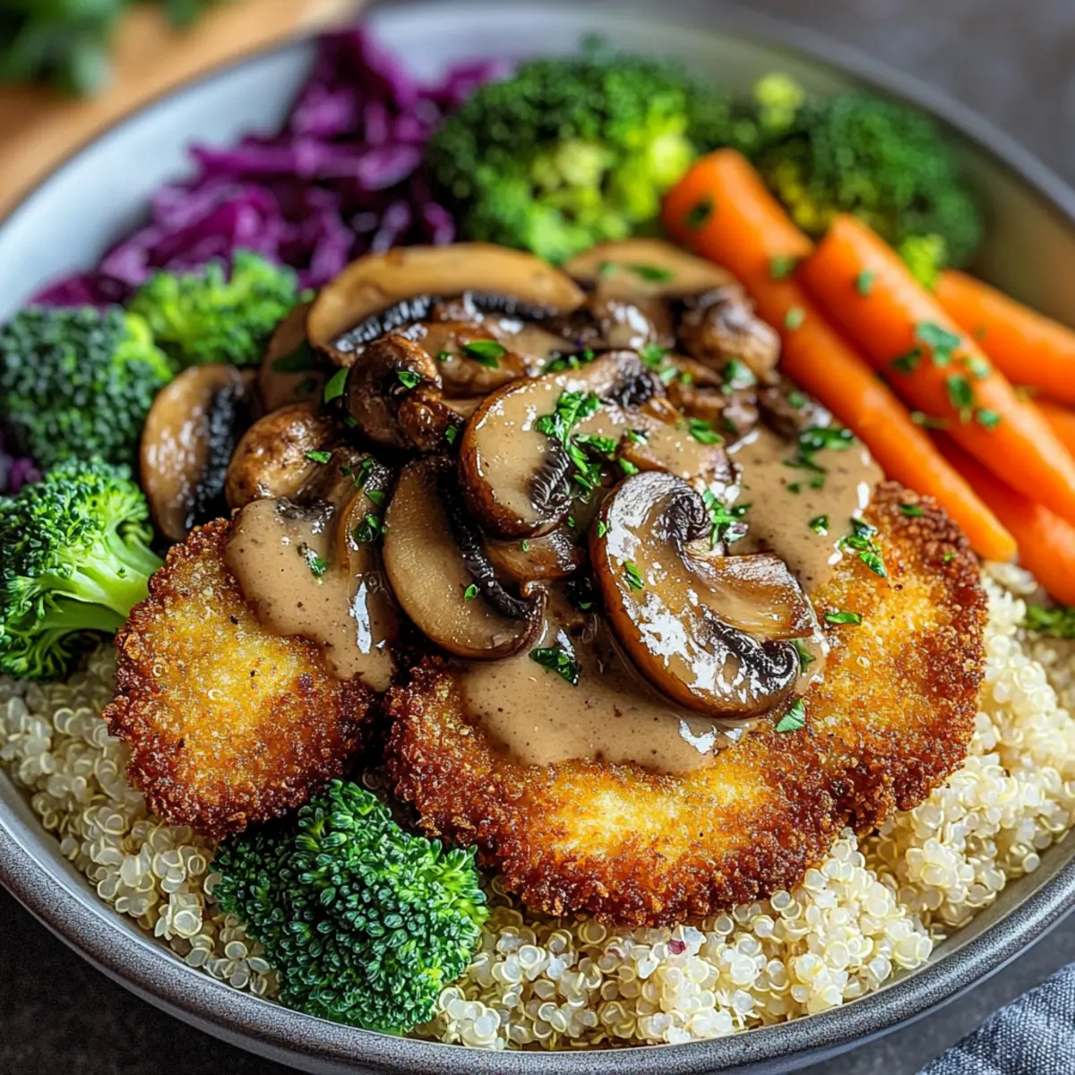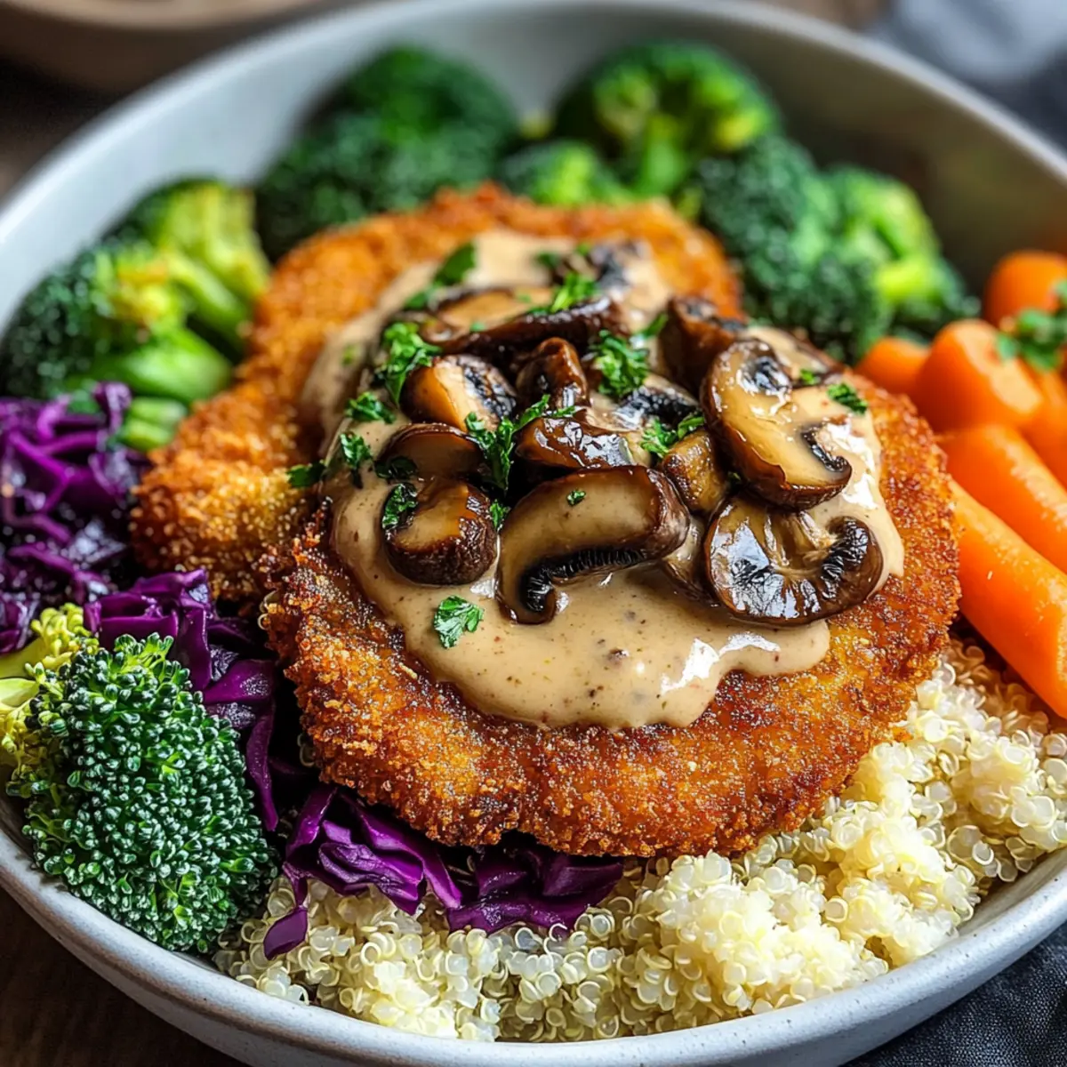 Ein köstlicher Duft durchzog die Küche, als ich zum ersten Mal meine vegane Schnitzel-Bowl mit Pilzsoße zubereitete. Diese kreative Neuinterpretation eines klassischen Gerichts begeistert nicht nur Veganer, sondern auch alle, die leckere, hausgemachte Speisen lieben. Mit einem knusprigen, pflanzlichen Schnitzel und einer cremigen Pilzsoße bringt diese Bowl das Beste aus frischen Gemüse wie Brokkoli, Rotkohl und Karotten in eine Schüssel. Ideal für die Wochenvorbereitung, ist dieses Gericht nicht nur ein Genuss, sondern auch sättigend und nährstoffreich – perfekt für die ganze Familie. Neugierig geworden, wie man dieses vegane Highlight selbst zubereitet? Lass uns gleich loslegen! Warum wirst du diese Bowl lieben? Vielseitigkeit: Diese vegane Schnitzel-Bowl ist nicht nur köstlich, sondern auch anpassbar. Du kannst das Schnitzel einfach durch Tofu oder Seitan ersetzen, um eine glutenfreie Variante zu genießen. Einfachheit: Die Zubereitung ist unkompliziert, sodass auch weniger erfahrene Köche diese Köstlichkeit leicht meistern können. Sättigender Genuss: Mit einer Kombination aus knusprigem Schnitzel, cremiger Pilzsoße und frischem Gemüse, bringt diese Bowl Freude in jede Mahlzeit. Nährstoffreich: Sie ist reich an pflanzlichem Eiweiß und Ballaststoffen, was sie zu einer gesunden Option für jeden macht. Köstliches Aroma: Der Duft der gerösteten Pilze und der speziellen Gewürze wird deine Küche erfüllen und deine Familie an den Tisch rufen. Perfekt fürs Meal Prep: Du kannst die einzelnen Komponenten vorbereiten und sie nach Belieben zusammenstellen, was Zeit spart und dennoch frisch schmeckt. Vegane Schnitzel-Bowl mit Pilzsoße Zutaten • Entdecke die vielfältigen Zutaten, die deine Bowl zu einem wahren Geschmackserlebnis machen! Für das Schnitzel Schnitzel – Der Hauptbestandteil, der für einen befriedigenden Crunch sorgt; alternativ marinierten Tofu oder hausgemachten Seitan verwenden. Weizenmehl – Bindet die Panade des Schnitzels; für eine glutenfreie Version glutenfreies Mehl verwenden. Pflanzliche Milch – Sorgt für Feuchtigkeit in der Panade; verwende Soja- oder Hafermilch. Paniermehl – Fügt dem Schnitzel Knusprigkeit hinzu; Panko gibt zusätzlichen Crunch. Knoblauchpulver – Verleiht dem Paniermix mehr Geschmack. Paprikapulver – Fügt dem Schnitzel Rauchigkeit und Farbe hinzu. Öl – Zum Frittieren des Schnitzels; empfehlenswert ist neutrales Öl. Für die Pilzsoße Zwiebel – Basisaroma für die Pilzsoße. Champignons – Hauptzutat in der Soße, die für Umami sorgt. Gemüsebrühe – Schafft eine herzhafte Soße. Thymian – Gewürz zur Verfeinerung der Soße. Pflanzliche Sahne – Optional für eine cremigere Konsistenz in der Soße. Für die Bowl Reis, Kartoffelpüree oder Quinoa – Grundlage für die Bowl; wähle je nach Vorliebe. Frisches Gemüse – Einschließlich Brokkoli, Rotkohl und Karotten für Nährstoffe und Farbe. Genieße deine vegane Schnitzel-Bowl mit Pilzsoße und entdecke, wie lecker gesunde Mahlzeiten sein können! Schritt-für-Schritt-Anleitung für die Vegane Schnitzel-Bowl mit Pilzsoße Step 1: Schnitzel vorbereiten Richte eine Panierstraße ein, indem du Weizenmehl, pflanzliche Milch und gut gewürztes Paniermehl nebeneinander platziers. Tauche jedes Schnitzel zuerst in das Mehl, dann in die pflanzliche Milch und schließlich in das Paniermehl, bis es gleichmäßig bedeckt ist. Lass die panierten Schnitzel für einige Minuten ruhen, damit die Panade gut haften bleibt. Step 2: Schnitzel braten Erhitze in einer großen Pfanne ausreichend neutrales Öl bei mittlerer Hitze. Sobald das Öl heiß ist, lege die Schnitzel vorsichtig in die Pfanne und brate sie 3-4 Minuten pro Seite, bis sie goldbraun und knusprig sind. Achte darauf, die Pfanne nicht zu überfüllen, damit die Schnitzel gleichmäßig braten können. Anschließend die Schnitzel auf Küchenpapier abtropfen lassen. Step 3: Soße zubereiten In derselben Pfanne etwas Olivenöl erhitzen und die gehackte Zwiebel bei mittlerer Hitze anbraten, bis sie weich und leicht glasig ist. Füge die in Scheiben geschnittenen Champignons hinzu und brate sie, bis sie goldbraun sind. Rühre das Knoblauchpulver unter und streue dann etwas Weizenmehl darüber, um die Soße zu binden. Step 4: Gemüsebrühe hinzufügen Gieße die Gemüsebrühe langsam in die Pfanne und rühre dabei stetig, um Klumpen zu vermeiden. Lass die Soße aufkochen und reduziere dann die Hitze. Füge einen Schuss Sojasauce und etwas Thymian hinzu, um die Aromen zu intensivieren. Lass die Soße für etwa 5 Minuten köcheln, bis sie leicht eindickt. Step 5: Bowl zusammenstellen Nehme eine Schüssel und lege eine Grundlage aus Reis, Kartoffelpüree oder Quinoa hinein. Toppe dies mit einer Auswahl an gedämpftem Gemüse wie Brokkoli, Rotkohl und Karotten, um Farbe und Nährstoffe hinzuzufügen. Platziere das knusprige Schnitzel in der Mitte der Bowl und übergieße es großzügig mit der cremigen Pilzsoße. Step 6: Garnieren und Servieren Garnieren die vegane Schnitzel-Bowl mit frischer Petersilie für einen zusätzlichen Frischekick. Serviere sie heiß und genieße die Kombination aus knusprigem Schnitzel und der herzhaften Pilzsoße. Diese Bowl bietet eine perfekte Balance aus Geschmack und Textur und wird alle am Tisch erfreuen. Expert Tips für die Vegane Schnitzel-Bowl Öltemperatur beachten: Stelle sicher, dass das Öl heiß genug ist, bevor du die Schnitzel hineinlegst. Zu kaltes Öl führt zu einer fettigen Panade und mindert die Knusprigkeit. Nicht überfüllen: Brate die Schnitzel in kleinen Chargen. Zu viele Schnitzel auf einmal in der Pfanne dämpfen sich gegenseitig und verhindern eine gleichmäßige Bräunung. Richtige Lagerung: Wenn du noch Schnitzel übrig hast, lasse sie auf einem Kuchengitter abkühlen, bevor du sie lagerst. So bleiben sie knusprig und weich. Soße vorbereiten: Du kannst die Pilzsoße im Voraus zubereiten und im Kühlschrank aufbewahren. Erwärme sie vorsichtig mit etwas Was