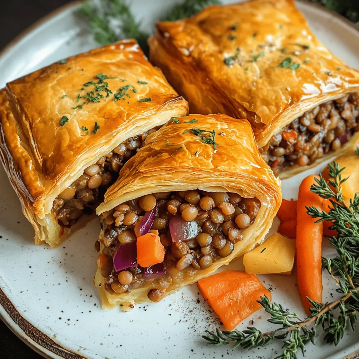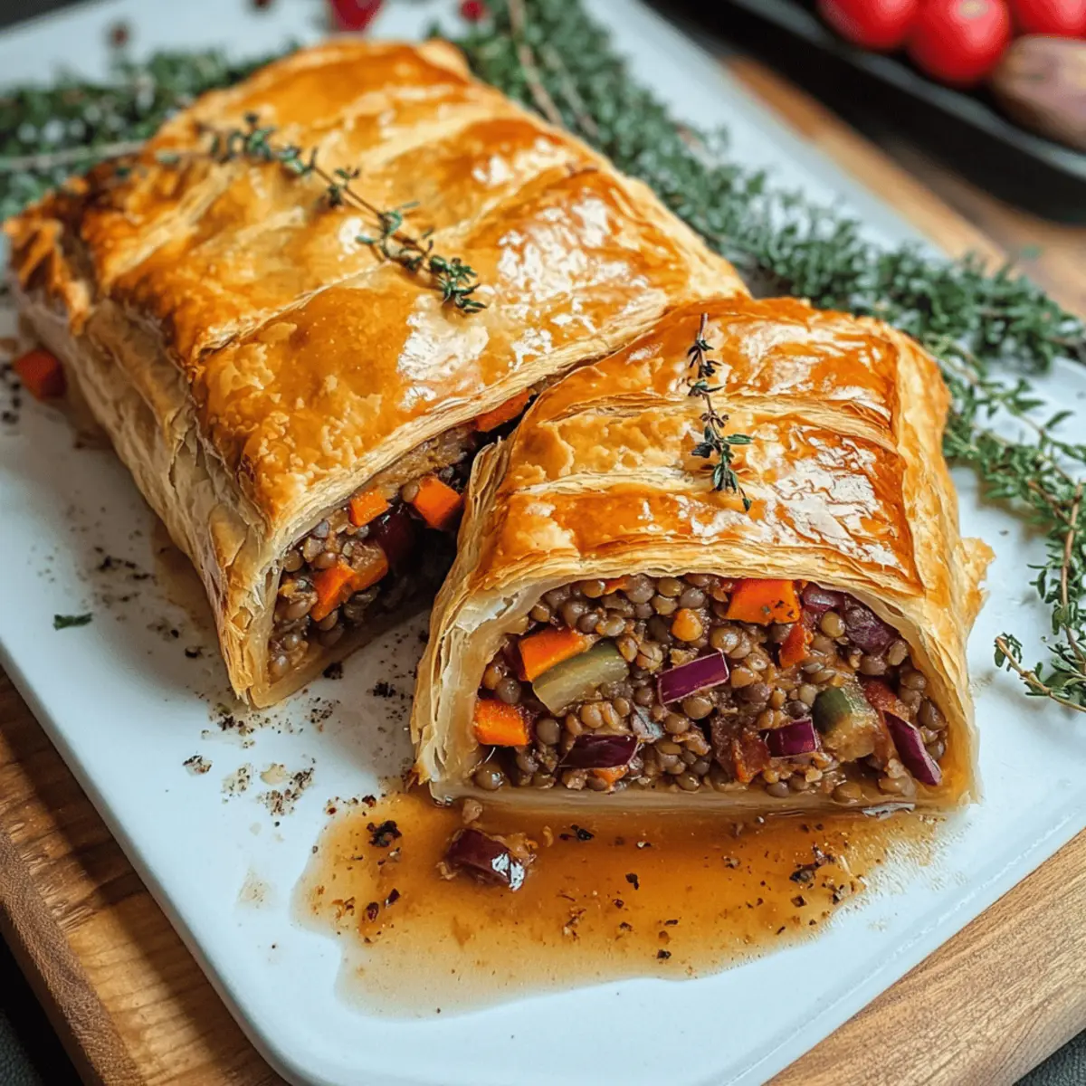 In einem kleinen gemütlichen Café in einer charmanten Stadt entdeckte ich vor kurzem ein Gericht, das mein Herz im Sturm eroberte: den Veganen Linsenbraten im Blätterteigmantel. Dieser liebevoll zubereitete Braten vereint nicht nur den herzhaften Geschmack von Berglinsen mit einer knusprigen Hülle, sondern ist auch eine wunderbare Alternative zur traditionellen Weihnachtsgans. Mit nur wenig Aufwand wird er zum festlichen Highlight auf jedem Tisch und ist gleichzeitig eine gesunde, pflanzenbasierte Wahl. Die besten Nachrichten? Die Zubereitung ist schnell und einfach, und er lässt sich hervorragend vorbereiten! Wer könnte da widerstehen? Lass uns gemeinsam in dieses köstliche Rezept eintauchen und herausfinden, wie wir diesen unwiderstehlichen Linsenbraten zu einem unvergesslichen Highlight zu Hause machen können! Warum ist dieser Linsenbraten besonders? Vielfältige Variationen: Du kannst mit verschiedenen Linsen und Gemüse experimentieren, um dein eigenes Meisterwerk zu schaffen. Knusprige Textur: Der Blätterteigmantel sorgt für einen himmlischen Crunch, der das saftige Innere perfekt ergänzt. Einfache Zubereitung: Auch ohne Kochprofi zu sein, gelingt dir dieses Rezept im Handumdrehen – ideal für stressige Feiertage. Gesund und Nahrhaft: Vollgepackt mit Nährstoffen aus Linsen und frischem Gemüse ist dieses Gericht nicht nur lecker, sondern auch gesund. Beeindruckende Präsentation: Der außergewohnliche Anblick wird deine Gäste verblüffen und das Festessen zu einem unvergesslichen Erlebnis machen. Flexibel und anpassbar: Perfekt für jede Gelegenheit, ob festlich oder alltäglich. Lass dir dieses geschmackliche Erlebnis nicht entgehen! Veganer Linsenbraten im Blätterteigmantel Zutaten • Finde alle Zutaten für deinen köstlichen veganen Linsenbraten hier! Für die Füllung Berglinsen (Puy Linsen) – Bietet einen reichen, nussigen Geschmack; lässt sich auch durch braune oder grüne Linsen ersetzen. Geschrotete Leinsamen – Wirkstoff für die Bindung, unverzichtbar für die Konsistenz; kein Ersatz notwendig. Zwiebeln – Für aromatische Tiefe; können auch durch Schalotten oder Lauch ersetzt werden. Knoblauch – Fügt geschmackliche Komplexität hinzu; optional für einen milderen Geschmack. Champignons – Trägt zur herzhafte Note bei; auch Shiitake- oder Cremini-Pilze sind geeignet. Haferflocken – Für mehr Biss und Fülle; glutenfreie Haferflocken sind auch erhältlich. Zucchini – Sorgt für Frische und Feuchtigkeit; kann im Winter durch Karotten oder Pastinaken ersetzt werden. Karotten – Bringt eine süße Note; lässt sich durch Pastinaken oder Süßkartoffeln austauschen. Walnüsse – Fügt Knusprigkeit hinzu; eventuell durch Pekannüsse ersetzen oder ganz weglassen für eine nussfreie Variante. Für die Würze Salz & Pfeffer – Grundlegend für die Würze; nach persönlichen Vorlieben anpassen. Kräuter der Provence – Gibt eine herzhafte Kräutermischung; italienische Kräuter können auch verwendet werden. Balsamico Essig – Verstärkt den Geschmack; Apfelessig kann für eine andere Note verwendet werden. Kichererbsenmehl – Sorgt für etwas Struktur; kann durch glutenfreies Mehl ersetzt werden. Sojasoße – Fügt Umami hinzu; Tamari ist eine glutenfreie Alternative. Paprikapulver – Für Farbe und Geschmack; mit geräuchertem Paprika für eine andere Nuance austauschbar. Frischer Rosmarin – Erhöht das Aroma; könnte auch durch Thymian oder Salbei ersetzt werden. Für den Blätterteig Veganer Blätterteig – Sorgt für die fröhliche Hülle des Bratens; unbedingt auf die veganen Zutaten achten. Pflanzendrink – Zum Bestreichen des Teigs für eine goldene Farbe; Mandel- oder Hafermilch sind empfehlenswert. Preiselbeermarmelade – Fügt eine süß-säuerliche Schicht hinzu; kann durch andere Beerenkonfitüren ersetzt werden. Schritt-für-Schritt-Anleitung für Veganer Linsenbraten im Blätterteigmantel Step 1: Linsen kochen Beginne damit, die Berglinsen in einem großen Topf nach Packungsanweisung zu kochen. Nach etwa 20–25 Minuten sollten die Linsen weich, aber nicht matschig sein. Wenn sie fertig sind, gieße das überschüssige Wasser ab und püriere die Linsen leicht mit einer Gabel, um eine grobe Textur zu erhalten, die als Basis für den veganen Linsenbraten im Blätterteigmantel dient. Step 2: Leinsamen einweichen Gib die geschroteten Leinsamen in eine kleine Schüssel und füge 3 Esslöffel Wasser hinzu. Lass die Mischung 5-10 Minuten ruhen, bis die Leinsamen quellen und eine gelartige Konsistenz erreichen. Diese Leinsamenmischung wird als Bindemittel für die Füllung dienen und sorgt dafür, dass der Linsenbraten im Blätterteigmantel zusammenhält. Step 3: Gemüse anbraten Erhitze in einer großen Pfanne 2 Esslöffel Pflanzenöl bei mittlerer Hitze. Füge die gewürfelten Zwiebeln und den gehackten Knoblauch hinzu und brate sie etwa 3 Minuten lang an, bis sie weich und duftend sind. Danach kommen die fein gehackten Champignons dazu; brate alles zusammen für weitere 5 Minuten, bis die Pilze schön gebräunt sind. Würze das Gemüse mit Salz, Pfeffer und den Kräutern der Provence. Step 4: Füllung mischen In einer großen Schüssel vermischst du die leicht pürierten Linsen, die quellen Leinsamen, das angebratene Gemüse, Haferflocken, geriebene Zucchini, Karotten, Kichererbsenmehl und die gehackten Walnüsse. Rühre die Mischung gut um, bis alles gleichmäßig verteilt ist. Diese aromatische Füllung ist das Herzstück deines veganen Linsenbratens im Blätterteigmantel und sorgt für eine köstliche Geschmackskombination. Step 5: Braten formen Nimm eine Kastenform (24-26 cm), lege sie mit Backpapier aus und drücke die vorbereitete Linsenfüllung gleichmäßig hinein. Achte darauf, dass die Masse gut festgedrückt wird, damit der Braten seine Form behält. Lass den Linsenbraten für mindestens 15 Minuten abkühlen; das hilft, die Füllung zu festigen, bevor du ihn in den Blätterteig wickelst. Step 6: Blätterteig vorbere