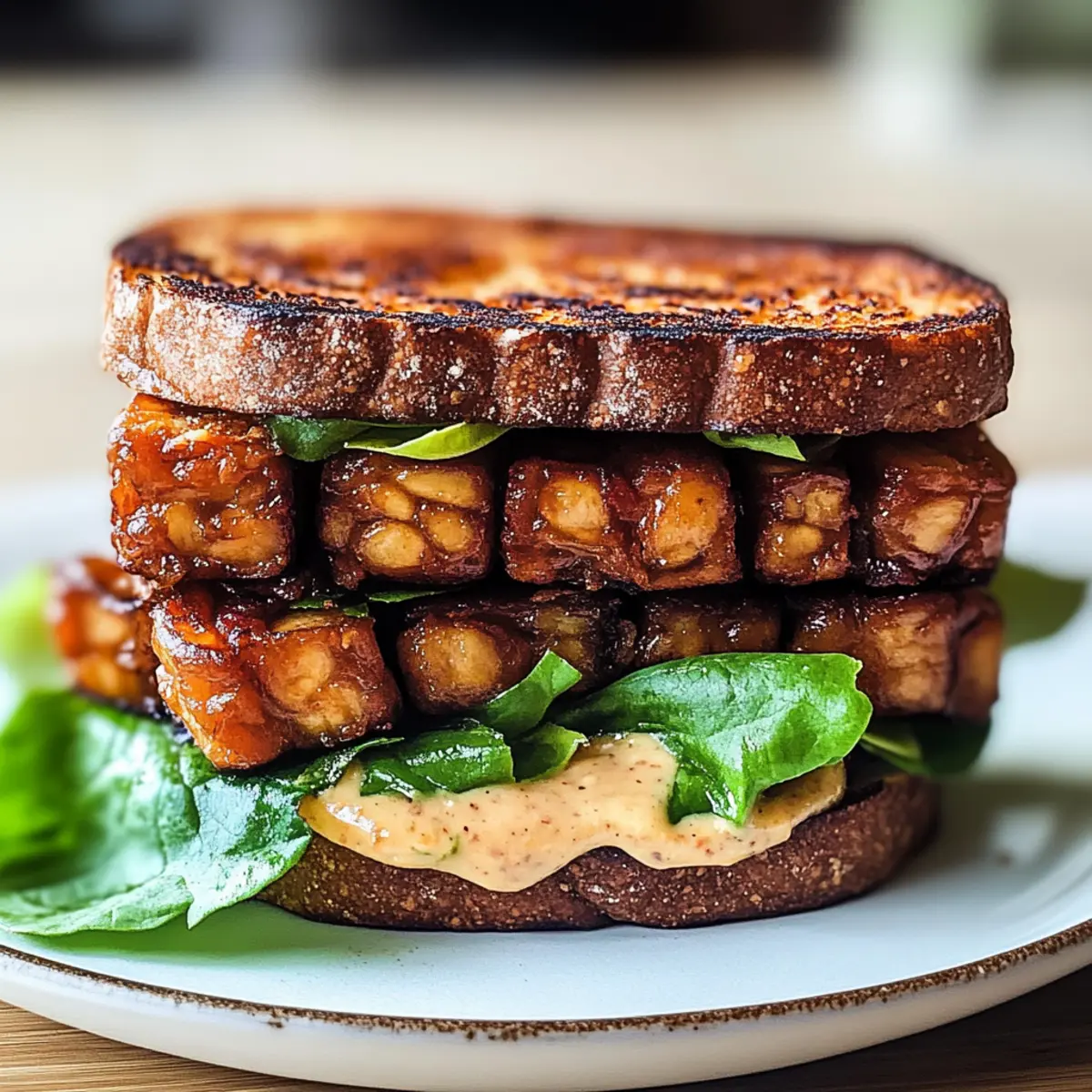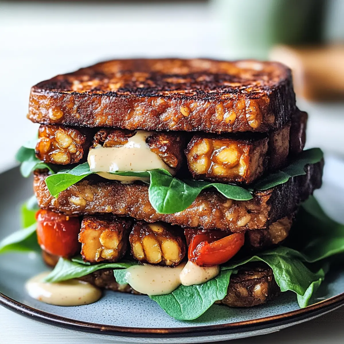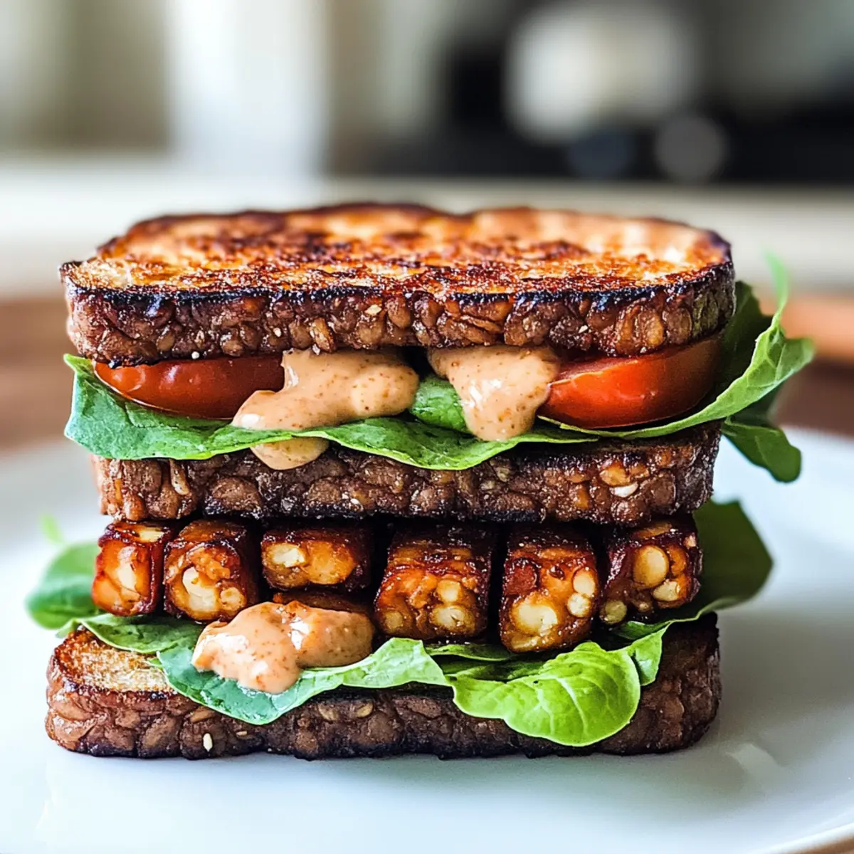 Genießen Sie ein köstliches Veganer Tempeh BLT Sandwich, gefüllt mit rauchigem Tempeh, frischem Gemüse und einer cremigen Sauce.