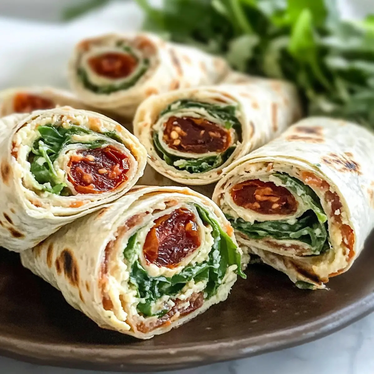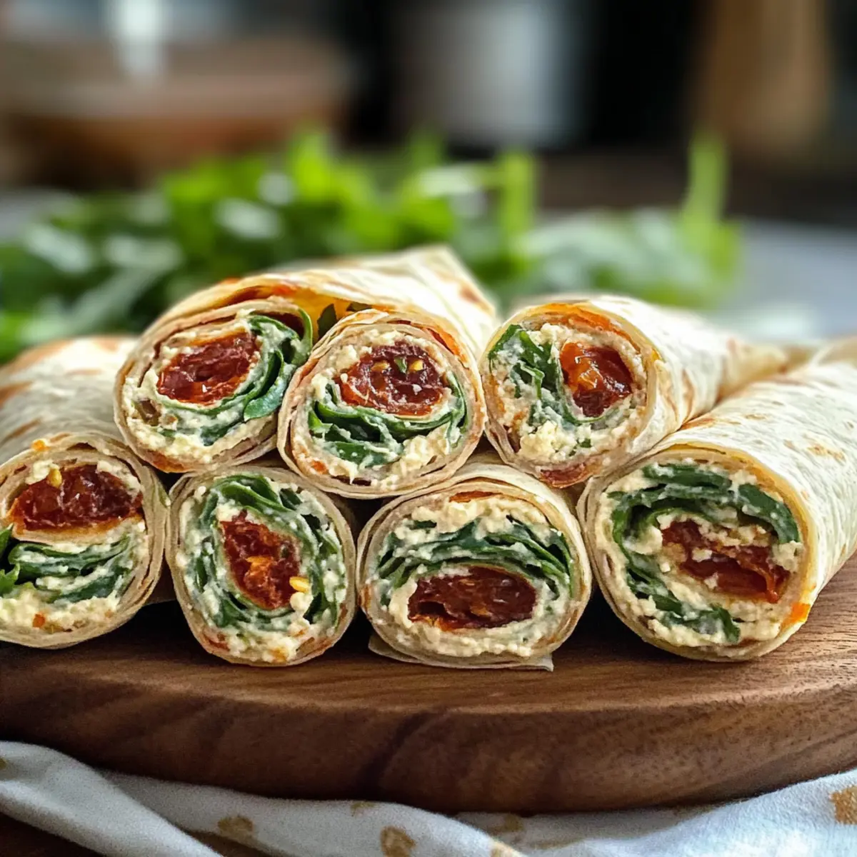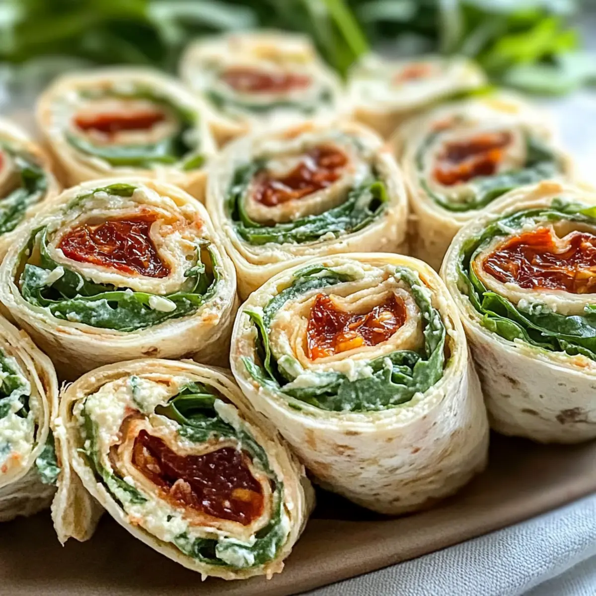 Ein wenig frischer Wind in der Küche gefällig? Mit meinen cremigen Vegetarischen Wrap Röllchen mit Rucola und Tomaten bringe ich Farbe und Geschmack auf dein Partybuffet! Diese schnellen und unkomplizierten Fingerfood-Köstlichkeiten sind nicht nur ein Hit bei jedem Anlass, sondern auch ein Genuss für alle, die gesundes Essen lieben. In nur 15 Minuten zubereitet und mit einer leckeren Füllung aus Frischkäse und sonnengetrockneten Tomaten gefüllt, sind sie der perfekte Snack für den Sommer oder einen entspannten Abend mit Freunden. Warum nicht gleich einmal ausprobieren und sehen, wie verblüffend einfach es ist, etwas Besonderes zu kreieren? Bereit, deine Gäste zu beeindrucken? Warum sind diese Wrap Röllchen einzigartig? Frische Aromen: Die Kombination aus würzigem Rucola und intensiven, sonnengetrockneten Tomaten bringt das Beste der mediterranen Küche auf deinen Tisch. Schnelle Zubereitung: In nur 15 Minuten erhältst du ein köstliches Fingerfood, das sich perfekt für spontane Gäste eignet. Vielseitig einsetzbar: Ob als Party-Snack oder leichter Sommer-Snack, diese Wrap Röllchen passen zu jedem Anlass. Gesund und lecker: Mit einer cremigen Füllung aus Frischkäse sind sie nicht nur zufriedenstellend, sondern auch nährstoffreich. Vorbereitung leicht gemacht: Du kannst diese Röllchen einen Tag im Voraus zubereiten, sodass du am Tag der Veranstaltung stressfrei genießen kannst. Crowd-Pleaser: Dank ihrer ansprechenden Optik und dem köstlichen Geschmack werden sie sicher zum Highlight auf jedem Buffet. Vegetarische Wrap Röllchen Zutaten • Diese Wrap Röllchen sind nicht nur lecker, sondern auch einfach zuzubereiten! Für die Füllung Rucola – verleiht den Wraps eine würzige Frische; wenn gewünscht, mit Spinat oder frischen Kräutern ersetzen. Getrocknete Tomaten in Öl – sorgt für umami und reichhaltigen Geschmack; sonnengetrocknete Tomaten in Öl verwenden, um die Feuchtigkeit zu erhalten. Frischkäse – sorgt für die cremige Konsistenz; für eine vegane Option mit pflanzlichem Frischkäse ersetzen. Knoblauchzehen – bringt ein kräftiges Aroma; kann weggelassen oder durch frische Kräuter ersetzt werden, wenn ein milderer Geschmack gewünscht ist. Bio-Zitrone (Abrieb) – fügt einen hellen, frischen Kontrast zur Cremigkeit hinzu; für zusätzliche Säure kann auch etwas Zitronensaft verwendet werden. Salz & Pfeffer – unverzichtbar zur Würze der Füllung; stets nach Geschmack hinzufügen. Für den Wrap Weizen-Tortillas – die Grundlage für die Röllchen; verwende Vollkorn- oder Maistortillas für glutenfreie Optionen. Nutze die Zutaten und bereite dir deine eigenen vegetarischen Wrap Röllchen mit Rucola und Tomaten zu! Step-by-Step Instructions for Vegetarische Wrap Röllchen mit Rucola und Tomaten Step 1: Rucola vorbereiten Wasche den Rucola gründlich unter fließendem Wasser, um Schmutz und Rückstände zu entfernen. Trockne ihn anschließend in einer Salatschleuder oder auf einem Küchentuch. Schneide den Rucola fein und gib ihn in eine große Schüssel. Die frische Würze des Rucolas verleiht deinen vegetarischen Wrap Röllchen den nötigen Geschmack. Step 2: Tomaten schneiden Nimm die getrockneten Tomaten aus dem Öl und lasse sie gut abtropfen. Schneide die Tomaten in kleine Würfel und füge sie der Schüssel mit dem Rucola hinzu. Diese saftigen Tomaten bringen zusätzliche Tiefe und umami in die Füllung deiner Wraps. Step 3: Füllung mischen Gib den Frischkäse in die Schüssel mit dem Rucola und den Tomaten. Presse die Knoblauchzehen hinein und füge den Abrieb der Bio-Zitrone hinzu. Würze die Mischung mit Salz und Pfeffer, dann vermenge die Zutaten gründlich mit einem Löffel, bis eine cremige Konsistenz entsteht. Diese Füllung ist das Herzstück deiner vegetarischen Wrap Röllchen. Step 4: Wraps zusammenstellen Lege eine Weizen-Tortilla auf eine saubere Arbeitsfläche. Verteile die Füllung gleichmäßig über die Tortilla, lasse dabei einen Rand frei. Rolle die Tortilla von unten nach oben eng auf, sodass die Füllung vollständig umschlossen ist. Wickle die fertigen Wraps in Frischhaltefolie, um sie frisch zu halten. Step 5: Kühlen Lass die Wraps für mindestens eine Stunde im Kühlschrank ruhen. Dies sorgt dafür, dass die Füllung fest wird und die Aromen gut durchziehen. Eine kühle Ruhezeit ist entscheidend, um die besten vegetarischen Wrap Röllchen zu kreieren. Step 6: Servieren Nimm die Wraps nach dem Kühlen aus dem Kühlschrank und entferne die Frischhaltefolie. Schneide jeden Wrap in acht gleich große Stücke. Richte die Stücke ansprechend auf einer Servierplatte an und garniere sie mit restlichem Rucola für eine hübsche Präsentation. Guten Appetit! Was passt zu Cremigen Vegetarischen Wrap Röllchen mit Rucola und Tomaten? Ein köstlicher Snack, der deine Gäste begeistert und deine Feier aufpeppt! Tzatziki: Kühler, cremiger Dip mit Gurke und Joghurt, ideal um die Aromen der Wrap Röllchen zu ergänzen. Chips: Knusprige Tortilla-Chips bieten einen spannenden Kontrast zur Cremigkeit der Füllung und sind perfekt zum Dippen. Frischer Salat: Ein leichter grüner Salat mit einem Zitronendressing sorgt für Frische und ist der perfekte Begleiter zu deinen Wraps. Oliven: Das salzige und herzhafte Aroma von Oliven erstellt einen schönen Geschmacks-Kontrast, der das mediterrane Thema unterstreicht. Rotwein: Ein eleganter, fruchtiger Rotwein harmoniert wunderbar mit den Aromen der sonnengetrockneten Tomaten. Zitronenlimonade: Eine erfrischende, spritzige Limonade bringt die Aromen der Wraps richtig zur Geltung und hebt den Genuss. Hummus: Cremiger Hummus ergänzt die Wrap Röllchen hervorragend und fügt eine schmackhafte, proteinreiche Dimension hinzu. Obstspiess: Süßes, frisches Obst, das am Ende serviert wird, bringt eine kinderleichte Süße und geschmacklichen Ausgleich. Expert Tips für Vegetarische Wrap Röllchen • Frische Kräuter hinzufügen: Verleihe deinen Wrap Röllchen eine zusätzliche Geschmacksebene, in