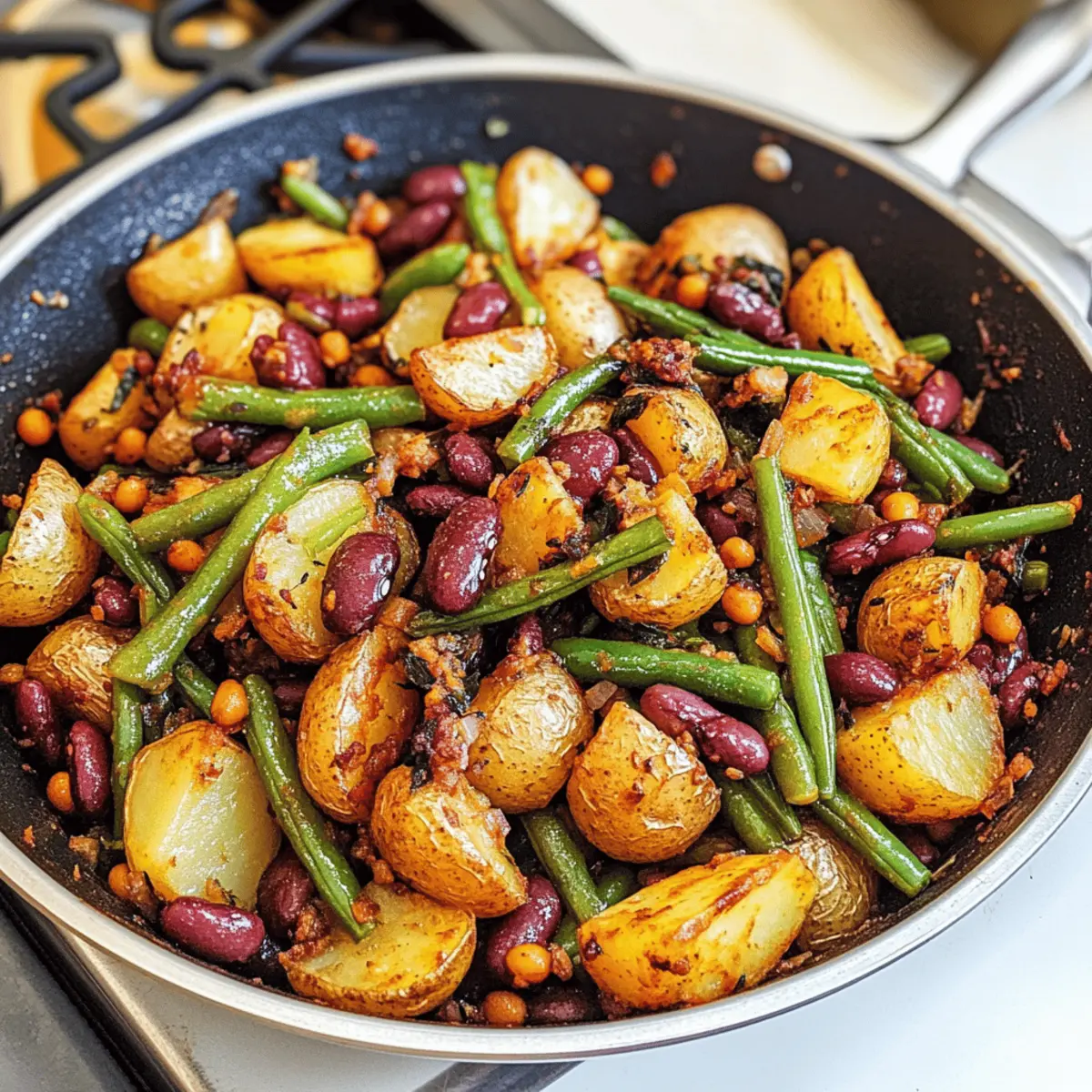 Sobald die Zwiebeln und der Knoblauch bereit sind, geben Sie die abgetropften Bohnen und den Mais in die Pfanne. Fügen Sie die gerösteten Kartoffeln, die blanchierten grünen Bohnen und das Tomatenmark hinzu. Rühren Sie alles gut um, sodass sich die Aromen verbinden können, und lassen Sie die Mischung für etwa 5 Minuten bei niedriger Hitze garen.