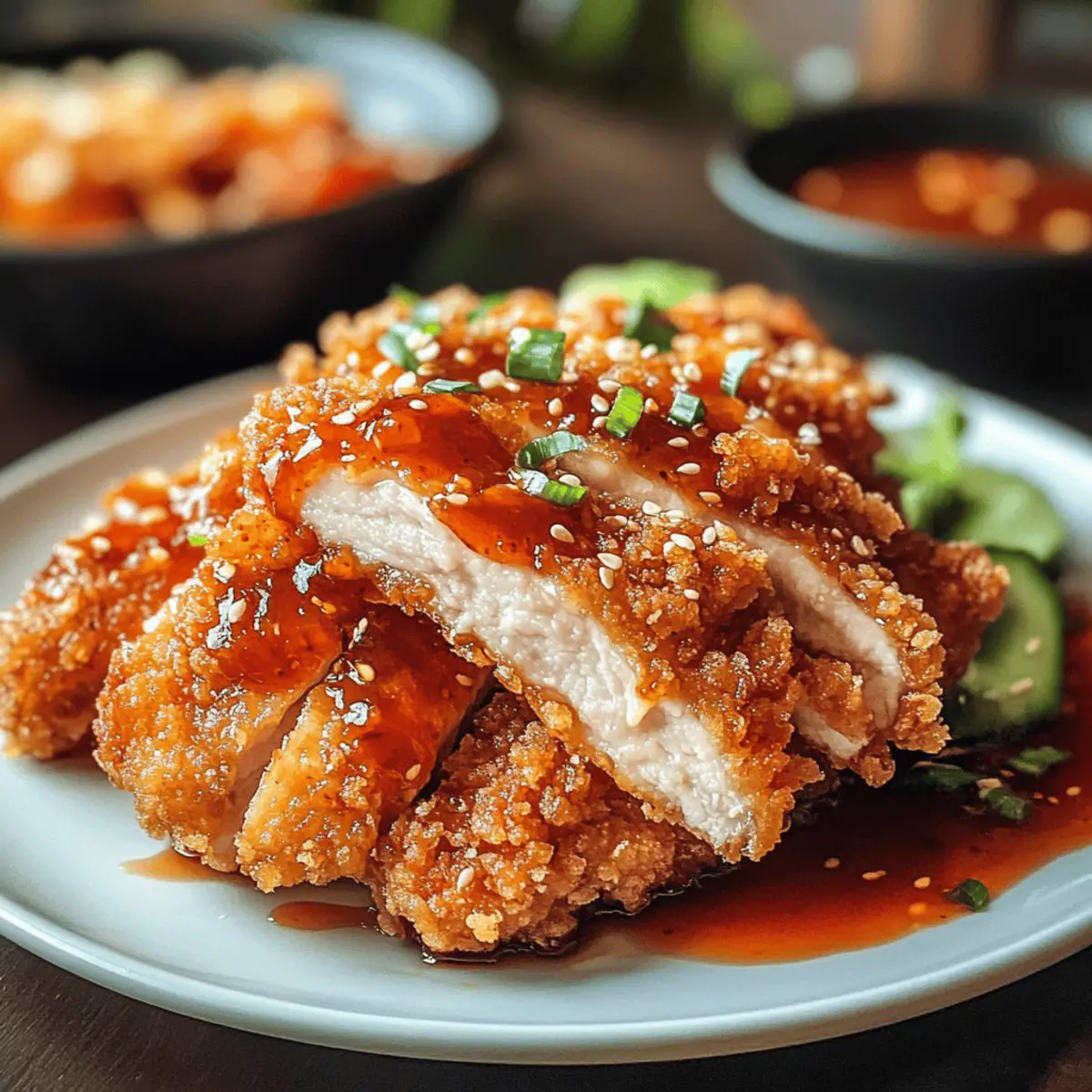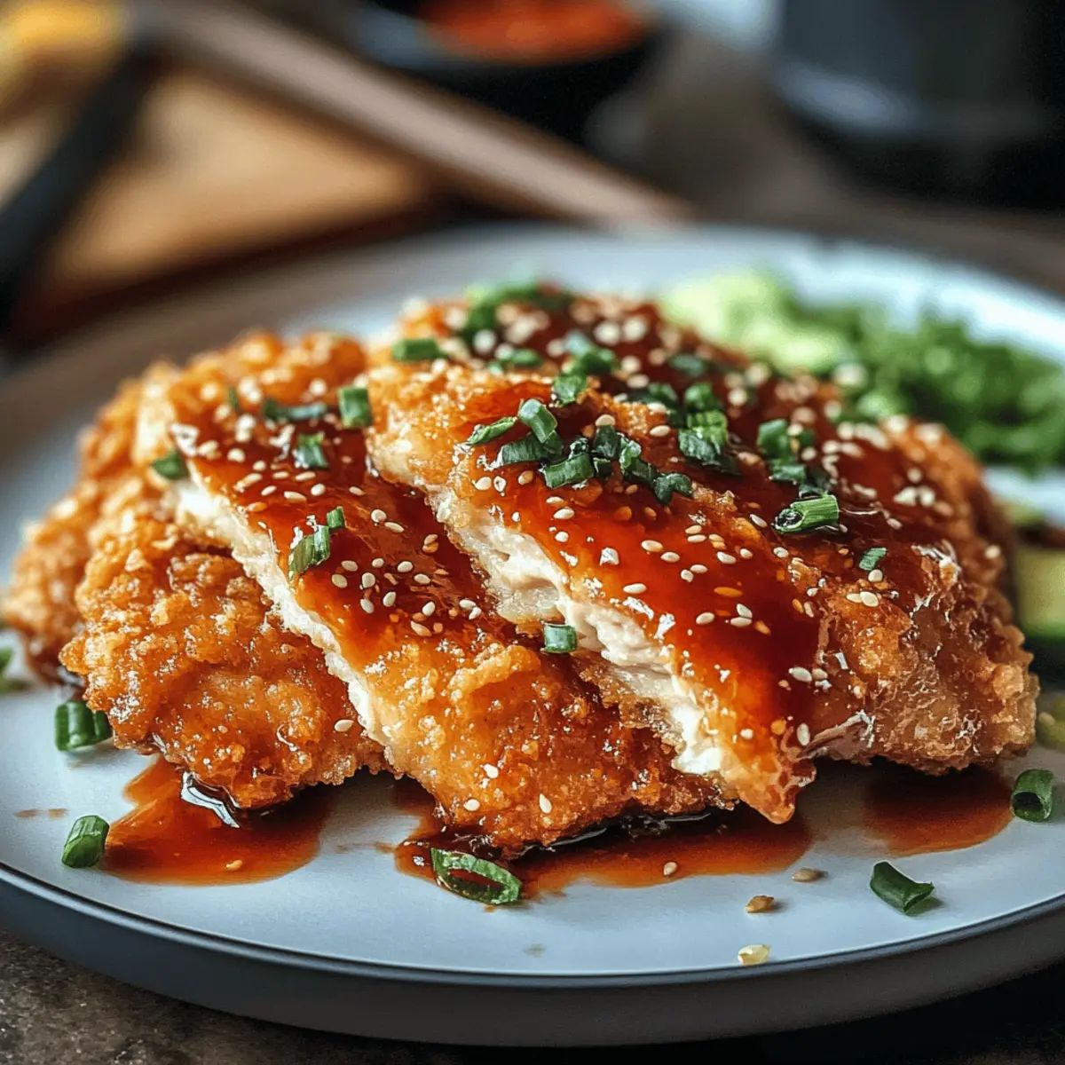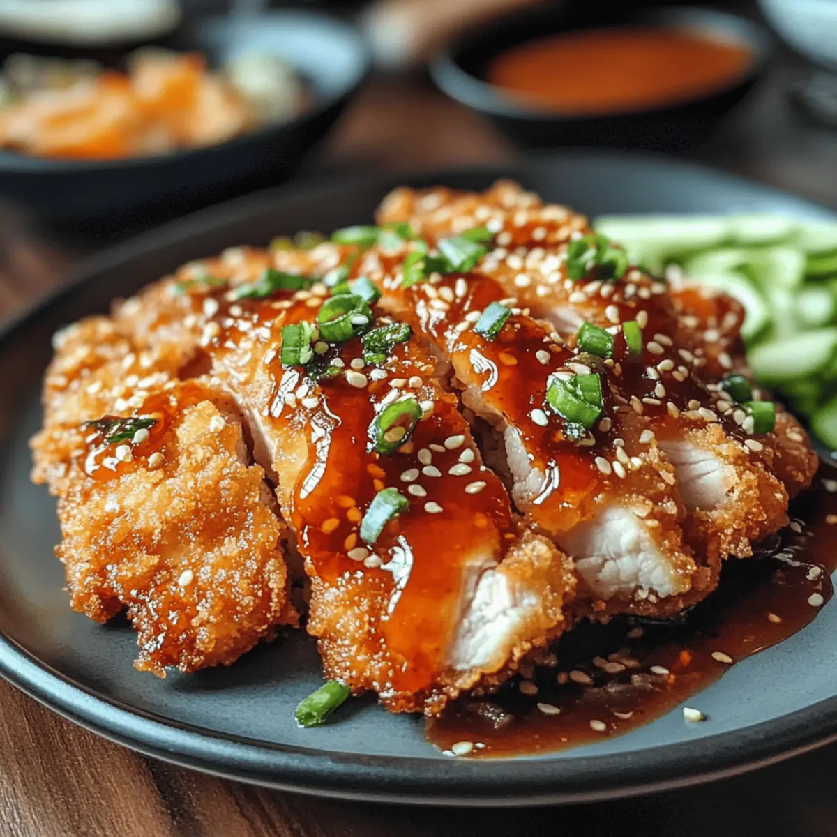 Manchmal gibt es Momente, in denen der Hunger auf etwas Herzhaftes und Spannendes überhandnimmt. Genau dann ist das Rezept für Würziges Koreanisches Hähnchen Katsu genau das Richtige! Mit seiner perfekt knusprigen Panade und einem zarten, saftigen Inneren wird dieses Gericht dein neues Liebkind in der Küche. Die Kombination aus süßem und scharfem Geschmack sorgt dafür, dass jeder Bissen zu einem kleinen Fest für die Geschmacksknospen wird. Zudem ist dieses Rezept einfach zuzubereiten – ideal für ein schnelles Abendessen unter der Woche oder ein festliches Wochenende. Bist du bereit, die Geheimnisse dieser köstlichen Fusion zu entdecken? Warum wirst du dieses Rezept lieben? Einfachheit: Die Zubereitung ist unkompliziert und erfordert nur grundlegende Kochfähigkeiten. Würziger Geschmack: Die Kombination aus Gochujang, Sojasauce und einem Hauch von Honig sorgt für ein unverwechselbares Geschmackserlebnis. Herzhafter Genuss: Diese knusprige Hähnchenvariation ist eine Bereicherung für dein Comfort-Food-Repertoire. Vielfältig anpassbar: Du kannst es mit Beilagen wie Sieben Schichten Huehnchen oder frischem Gemüse kombinieren. Selbst ein einfaches Salatdressing passt perfekt dazu! Schneller Genuss: Perfekt für eilige Abende, lässt sich das Gericht schnell zubereiten, ohne dass du auf den herzhaften Geschmack verzichten musst. Würziges Koreanisches Hähnchen Katsu Zutaten Für das Hähnchen • 2 große, entbeinte, hautlose Hähnchenbrustfilets (längs halbiert) – Hauptprotein; achte auf eine gleichmäßige Dicke für gleichmäßiges Garen. • 1 Tasse Allzweckmehl – Beschichtet das Hähnchen und bildet die Basis für die Panade. • 1 Teelöffel Knoblauchpulver – Fügt Geschmack hinzu, frischer, gehackter Knoblauch kann für einen intensiveren Geschmack verwendet werden. • 1 Teelöffel Salz – Verstärkt den Geschmack, nach Belieben anpassen. • ½ Teelöffel schwarzer Pfeffer – Sorgt für eine milde Schärfe; kann weggelassen oder durch weißen Pfeffer ersetzt werden. • 2 große Eier (verquirlt) – Verbindet die Semmelbrösel mit dem Hähnchen; verwende einen Ei-Ersatz für eine vegane Version. • 2 Tassen Panko-Semmelbrösel – Sorgt für eine leichte, knusprige Kruste; normale Semmelbrösel sind möglich, aber ergeben nicht die gleiche Textur. • Öl (zum Frittieren) – Notwendig für das Kochen des Hähnchens; kann durch gesündere Öle wie Avocado- oder Rapsöl ersetzt werden. Für die Sauce • 3 Esslöffel Sojasauce – Liefert Umami-Geschmack; verwende Tamari für eine glutenfreie Option. • 1 Esslöffel Reisessig – Fügt Säure hinzu, um die Aromen auszubalancieren. • 2 Esslöffel Zucker – Süße, die die Schärfe ausgleicht; kann durch Honig oder Agavendicksaft ersetzt werden. • 1 Esslöffel Honig – Für Süße und Glasur; kann Zucker ersetzen oder reduziert werden für weniger Süße. • 2 Esslöffel Gochujang (koreanisches Chilipaste) – Schlüsselzutat für Schärfe und Geschmack; Menge reduzieren für milderen Geschmack. • 2 Knoblauchzehen (gehackt) – Verstärkt den aromatischen Geschmack. • 1 Teelöffel Ingwer (gerieben) – Fügt Wärme und Tiefe zur Sauce hinzu. Schritt-für-Schritt-Anleitung für Würziges Koreanisches Hähnchen Katsu Step 1: Hähnchen vorbereiten Schneide die Hähnchenbrustfilets längs in zwei gleichmäßige Stücke. Würze das Fleisch großzügig mit Salz, Pfeffer und Knoblauchpulver. Lasse die Hähnchenstücke etwa 10 Minuten ruhen, damit die Aromen eindringen können. Diese Vorbereitungen sorgen dafür, dass dein Würziges Koreanisches Hähnchen Katsu von Anfang an geschmacklich rund ist. Step 2: Panierstationen einrichten Richte drei flache Schalen ein: fülle die erste mit Allzweckmehl, die zweite mit den verquirlten Eiern und die dritte mit Panko-Semmelbröseln. Diese Stationen ermöglichen eine einfache und ordentliche Panierung des Hähnchens. Stelle sicher, dass alles bereit ist, bevor du mit dem nächsten Schritt fortfährst. Step 3: Hähnchen panieren Nehme ein Stück Hähnchen und wälze es zuerst im Mehl, bis es gleichmäßig bedeckt ist. Tauche es anschließend in die Eier und schließlich in die Panko-Semmelbrösel, wobei du darauf achtest, die Krümel fest auf das Hähnchen zu drücken. Wiederhole dies mit allen Hähnchenstücken, um eine schöne, knusprige Panade für das Würzige Koreanische Hähnchen Katsu zu erreichen. Step 4: Hähnchen frittieren Erhitze in einer großen Pfanne ausreichend Öl bei mittelhohe Hitze. Füge die panierten Hähnchenstücke vorsichtig hinzu und brate sie für etwa 4-5 Minuten auf jeder Seite, bis sie goldbraun und knusprig sind. Achte darauf, die Pfanne nicht zu überfüllen, um gleichmäßige Garung und Knusprigkeit zu gewährleisten. Step 5: Sauce zubereiten Während das Hähnchen brät, kombiniere in einem kleinen Topf Sojasauce, Reisessig, Zucker, Honig, Gochujang, gehackten Knoblauch und Ingwer. Erhitze die Mischung bei mittlerer Hitze und rühre regelmäßig um, bis sie gut vermischt und leicht eingedickt ist, was etwa 5 Minuten dauern sollte. Diese würzige Sauce wird das Aroma des Würzigen Koreanischen Hähnchen Katsu perfekt abrunden. Step 6: Servieren Nehme das Hähnchen aus der Pfanne und lasse es kurz auf Küchenpapier abtropfen, um überschüssiges Öl zu entfernen. Drizzle die vorbereitete Sauce über die knusprigen Hähnchenstücke oder serviere sie daneben. Dekoriere dein Gericht nach Belieben mit Sesamsamen oder gehackten Frühlingszwiebeln. Genieße dein köstliches Würziges Koreanisches Hähnchen Katsu! Was passt gut zu Würzigem Koreanischem Hähnchen Katsu? Ergänze dein Herzhaftes Erlebnis mit köstlichen Beilagen, die den unwiderstehlichen Geschmack des Würzigen Koreanischen Hähnchen Katsu perfekt unterstützen. Gedämpfter Jasmindreis: Schlicht und klassisch, dieser Reis bietet die perfekte Grundlage, um die würzige Sauce aufzusaugen. Eingelegtes Gemüse: Ein Hauch von Säure und Knackigkeit bringt Balance und Frische in 