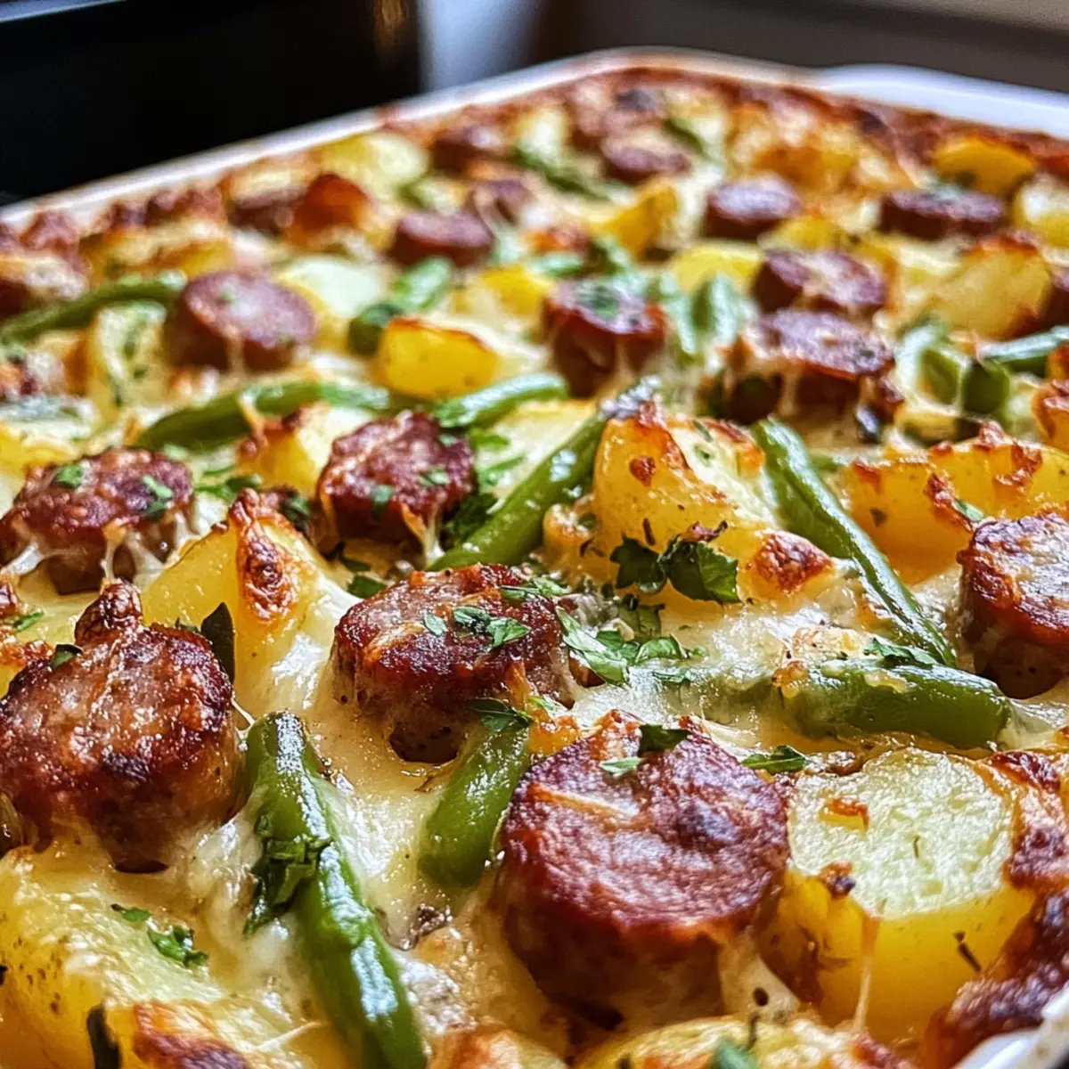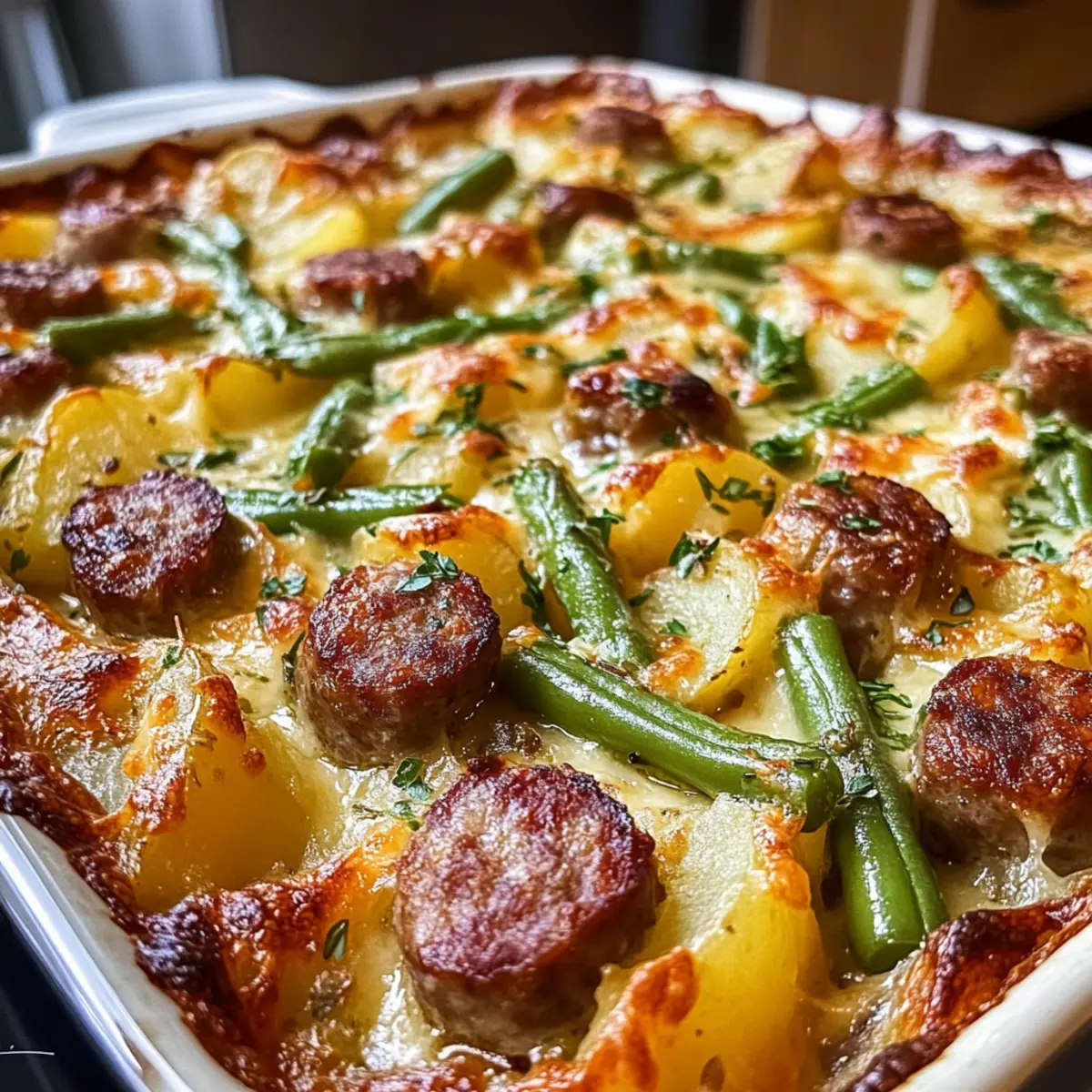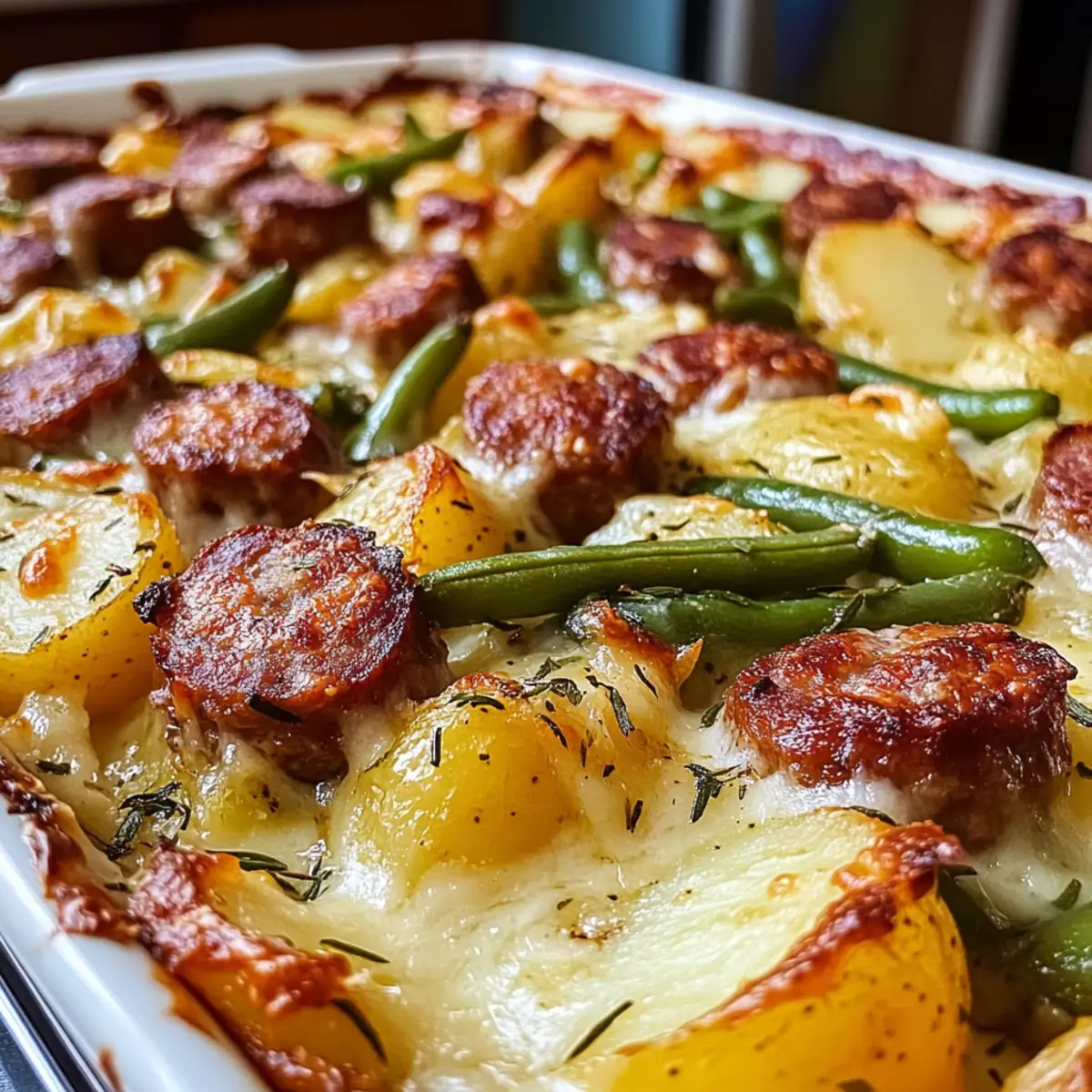 „Ich kann nicht glauben, wie einfach es ist, ein herzhaftes Gericht wie den Wurst Bohne Kartoffel Auflauf zuzubereiten!“ hörte ich neulich in der Küche meiner Nachbarin. Genau das wollte ich für einen geselligen Abend mit Freunden zaubern. Das Beste daran? Dieser Auflauf verbindet die rauchigen Aromen von Wurst mit zarten Kartoffeln und knackigen grünen Bohnen, alles eingehüllt in eine cremige Käsesoße. Ideal für ein schnelles Abendessen unter der Woche oder ein gemütliches Familienessen am Sonntag – in nur 65 Minuten steht dieses köstliche Comfort Food auf dem Tisch. Außerdem kann man es ganz nach Belieben anpassen, sei es mit einer vegetarischen Wurst oder einer Variation bei den Gemüsesorten. Welches Gemüse wirst du ausprobieren? Warum ist dieser Auflauf so besonders? Einfache Zubereitung: Die Schritte sind unkompliziert und erfordern keine speziellen Kochkünste, sodass jeder, vom Neuling bis zum erfahrenen Koch, ein köstliches Ergebnis erzielen kann. Vielseitigkeit: Du kannst verschiedene Gemüsesorten oder Würste verwenden, egal ob traditionell oder pflanzlich, was diesen Auflauf perfekt an deine Vorlieben anpasst. Herzhafte Aromen: Die Kombination aus Rauchigkeit der Wurst und cremigem Käse sorgt für einen unvergesslichen Geschmack, der deine Gäste garantiert begeistert. Familienfreundlich: Dieses Gericht ist ideal für große Runden und lässt sich einfach in Portionen servieren – so bleiben alle glücklich und satt. Schnell zubereitet: Mit einer Gesamtkochzeit von nur 65 Minuten ist dies das perfekte Rezept für ein schnelles Abendessen nach einem langen Tag. Bereite dich darauf vor, diesen leckeren Wurst Bohne Kartoffel Auflauf in dein wöchentliches Repertoire aufzunehmen! Wurst Bohne Kartoffel Auflauf Zutaten • Der perfekte Start für dein Rezept! Für den Auflauf Wurst – sorgt für rauchigen Geschmack und hochwertigen Proteingehalt; verwende für eine leichtere Option Hähnchenwurst oder pflanzliche Wurst. Kartoffeln – bilden die cremige Basis, die beim Backen wunderbar zart wird; nutze Sorten wie Yukon Gold oder Russet für optimalen Geschmack. Grüne Bohnen – bringen Frische und Textur ins Gericht; ersetze sie durch Karotten oder Paprika, je nach Vorliebe. Olivenöl – zum Würzen der Gemüse und zum Verfeinern des Geschmacks; Butter oder Ghee sind ebenfalls großartige Alternativen. Salz & Pfeffer – zum abschmecken und für den letzten Schliff. Paprika & Kräutermischung – verleiht dem Gericht eine aromatische Tiefe; geräucherte Paprika ist besonders empfehlenswert für mehr Geschmack. Zwiebel & Knoblauch – sorgt für eine ansprechende Aromabasis; ersetze sie optional durch Schalotten für einen milden Geschmack. Hühnerbrühe – bringt Feuchtigkeit in den Auflauf; nutze Gemüsebrühe für eine vegetarische Variante. Schlagsahne – sorgt für die cremige Konsistenz; kann durch Halbfett-Sahne oder pflanzliche Creme ersetzt werden. Cheddar Käse – schmilzt köstlich und bildet eine goldene Kruste; nutze auch andere schmelzbare Käsesorten wie Gruyère oder Mozzarella. Entdecke das köstliche Zusammenspiel dieser Zutaten im Wurst Bohne Kartoffel Auflauf und lass dich von den Aromen verzaubern! Step-by-Step Instructions for Wurst Bohne Kartoffel Auflauf Step 1: Ofen vorheizen Heize den Ofen auf 190°C vor und fette eine 23×33 cm große Auflaufform leicht ein. So sorgt die Fettung dafür, dass der Auflauf später nicht an der Form kleben bleibt. Während der Ofen aufheizt, kannst du mit der Vorbereitung der weiteren Zutaten beginnen. Step 2: Gemüse vorbereiten In einer großen Schüssel die halbierten Kartoffeln und die grünen Bohnen geben. Diese mit Olivenöl, Salz, Pfeffer, Paprika und der Kräutermischung gut vermengen, bis alles gleichmäßig bedeckt ist. Der angenehme Duft zeigt, dass die Gewürze gut eingearbeitet sind, was die Basis für unseren Wurst Bohne Kartoffel Auflauf bildet. Step 3: Wurst anbraten Erhitze eine Pfanne bei mittlerer bis hoher Hitze und brate die Wurstscheiben etwa 5 Minuten lang an, bis sie eine schöne goldbraune Farbe erhalten. Dies verleiht der Wurst zusätzliche Aromen. Nach dem Anbraten die Wurst aus der Pfanne nehmen und beiseitelegen. Step 4: Zwiebeln und Knoblauch anbraten In derselben Pfanne die gehackten Zwiebeln und den gehackten Knoblauch für etwa 3 Minuten anbraten. Achte darauf, dass sie weich werden und leicht glasig sind. So entsteht die aromatische Grundlage für den Wurst Bohne Kartoffel Auflauf, die dem Gericht Tiefe verleiht. Step 5: Zutaten kombinieren Mische die angebratene Wurst mit dem gewürzten Gemüse und den sautierten Zwiebeln. Alles gut vermengen, damit die Aromen miteinander verschmelzen. Gib diese Mischung gleichmäßig in die vorbereitete Auflaufform, sodass sie gut verteilt ist. Step 6: Brühe und Sahne hinzufügen Gieße die Hühnerbrühe und die Schlagsahne gleichmäßig über das Gemüse und die Wurst in der Auflaufform. Decke das Ganze mit Aluminiumfolie ab, um eine optimale Feuchtigkeit zu gewährleisten, und backe es für 35-40 Minuten, bis die Kartoffeln zart werden. Step 7: Käse hinzufügen Nach der Backzeit die Folie vorsichtig abnehmen und den Cheddar Käse gleichmäßig darauf streuen. Den Auflauf ohne Folie für weitere 10-15 Minuten backen, bis der Käse geschmolzen ist und eine goldene Kruste bildet. Diese knusprige Oberfläche ist das i-Tüpfelchen für unseren Wurst Bohne Kartoffel Auflauf. Step 8: Ruhen lassen und servieren Lass den Wurst Bohne Kartoffel Auflauf für 5-10 Minuten ruhen, bevor du ihn servierst. Dies gibt der Füllung Zeit, sich zu setzen und erleichtert das Portionieren. Serviere ihn warm und genieße das herzliche Gericht mit Freunden oder Familie! Was passt gut zum Wurst Bohne Kartoffel Auflauf? Dieser herzhafte Auflauf wird zu einem unvergesslichen Abendessen, wenn du ihn mit den passenden Beilagen kombinierst. Cremige Kartoffelpüree: Dieses vielseitige Püree ergänzt die Textur des Auflaufs wunderbar und bringt eine zusätzli