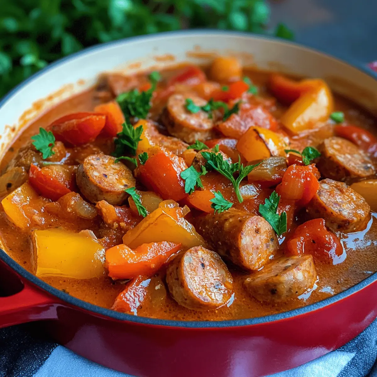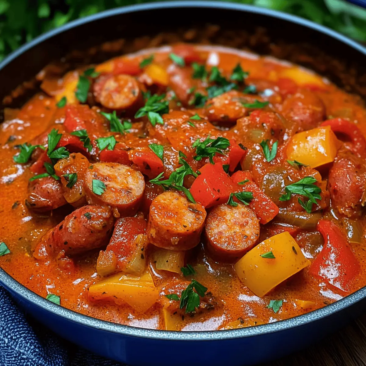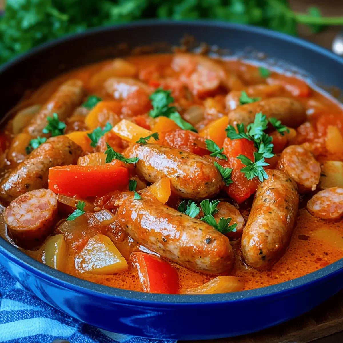 In der Hektik des Alltags gibt es diese besonderen Gerichte, die uns sofort in eine behagliche Stimmung versetzen. Mein One-Pot Würstchengulasch vereint die köstlichen Aromen von Wiener Würstchen, süßem roten Paprika und einer cremigen Tomatensoße zu einem herzhaften Mahl, das in nur 35 Minuten zubereitet ist. Dies ist das perfekte Rezept für eine schnelle Familienmahlzeit, die sowohl Kinder als auch Erwachsene verzaubert. Und das Beste? Es lässt sich nach Herzenslust variieren, sei es mit Debrecziner, Mettenden oder sogar in einer vegetarischen Version. Das dazugehörige Aroma und die cremige Konsistenz machen jeden Löffel zu einem echten Genuss! Bist du bereit, das nächste Küchenabenteuer zu starten? Warum ist Würstchengulasch so unwiderstehlich? Einfachheit: Die unkomplizierte Zubereitung macht es perfekt für stressige Tage. In nur 35 Minuten steht ein köstliches Gericht auf dem Tisch. Vielfältige Variationen: Ob mit Debrecziner oder in einer vegetarischen Version – passe das Rezept ganz nach deinem Geschmack an! Herzhafter Geschmack: Die Kombination aus würzigen Würstchen, süßem Paprika und cremiger Soße sorgt für ein unvergessliches Geschmackserlebnis. Familienfreundlich: Dieses Comfort Food begeistert sowohl Kinder als auch Erwachsene und ist ideal für ein geselliges Abendessen. Zeitersparnis: Als One-Pot-Gericht bleibt dir der Abwasch nicht erspart – ein Genuss ohne Stress! Beilage nach Wahl: Serviere es über Pasta, Reis oder mit frischem Brot, um die leckere Soße aufzutunken. Würstchengulasch Zutaten • Hier sind die Zutaten für dein köstliches Würstchengulasch: Für die Würstchen Wiener Würstchen – Hauptquelle des Proteins; du kannst sie durch Debrecziner, Mettenden oder Cabanossi ersetzen, um verschiedene Aromen zu kreieren. Speckwürfel – Fügt Raucharoma und Reichhaltigkeit hinzu; für die vegetarische Version einfach weglassen oder durch geräucherten Tofu ersetzen. Für das Gemüse Zwiebel – Bringt Süße und Tiefe ins Gericht; nehme rote oder weiße Zwiebeln, je nach Vorliebe. Knoblauchzehe – Verstärkt den Geschmack und das Aroma; frisch ist immer am besten. Rote Paprikaschote – Sorgt für Farbe und Süße; du kannst auch gelbe oder grüne Paprika verwenden. Für die Soße Olivenöl – Ideal zum Anbraten; verwende auch ein anderes Bratöl, wenn du magst. Tomatenmark – Intensiviert den Tomatengeschmack; ein Muss für die Soße. Gehackte Tomaten – Basis der Soße; frische oder aus der Dose bieten sich ebenso an. Rinderbrühe – Verleiht Umami-Geschmack; alternativ mit Gemüsebrühe für die vegetarische Version arbeiten. Crème fraîche – Sorgt für Cremigkeit und einen leicht säuerlichen Geschmack; kann auch durch Sauerrahm oder Joghurt ersetzt werden. Für die Gewürze Paprikapulver – Bringt Süße und Farbe ins Gericht; verwende geräuchertes Paprikapulver für ein neues Geschmacksprofil. Gehackte Petersilie – Frische Kräuter zum Garnieren; gibt dem Gericht den letzten Schliff. Mit diesen Zutaten kannst du dein eigenes, unwiderstehliches Würstchengulasch zaubern! Schritt-für-Schritt-Anleitung für Würstchengulasch Step 1: Gemüse vorbereiten Schneide die Wiener Würstchen in Scheiben, würfle die Zwiebel und hacke den Knoblauch und die rote Paprika. Achte darauf, dass du gleichmäßige Stücke erhältst, um eine einheitliche Garzeit zu gewährleisten. Diese bunte Mischung bringt Farbe und Geschmack in dein Würstchengulasch. Stelle alle vorbereiteten Zutaten in Reichweite, um den Kochprozess zu beschleunigen. Step 2: Zutaten anbraten Erhitze in einem großen Topf bei mittlerer Hitze einen Esslöffel Olivenöl. Gib die Speckwürfel und die gewürfelte Zwiebel hinzu und brate sie für etwa 2 Minuten, bis die Zwiebel glasig wird. Achte darauf, dass der Speck leicht knusprig wird, da dies dem Würstchengulasch eine besondere Note verleiht und das Aroma entfaltet. Step 3: Wurst und Gemüse hinzufügen Füge die geschnittenen Würstchen, den gehackten Knoblauch und die Paprika in den Topf hinzu. Brate alles für weitere 2 Minuten an, bis die Paprika weich ist und die Würstchen leicht angebraten sind. Die Kombination der Zutaten beginnt, eine köstliche Basis für dein Würstchengulasch zu bilden, während die Aromen sich vermischen. Step 4: Tomatengeschmack intensivieren Rühre das Tomatenmark unter das Gemüse und brate es für etwa eine Minute an, bis es gut duftet. Diese kurze Phase des Anbratens verstärkt den Tomatengeschmack und verleiht deinem Würstchengulasch eine reichhaltige, aromatische Grundlage. Du kannst hier den Topf leicht anheben und schwenken, um sicherzustellen, dass alles gleichmäßig erhitzt wird. Step 5: Brühe und Tomaten hinzufügen Gieße nun die Rinderbrühe und die gehackten Tomaten in den Topf. Rühre alles gut um und füge Paprikapulver, Salz und frisch gemahlenen Pfeffer nach Geschmack bei. Lass die Mischung aufkochen, bevor du die Hitze reduzierst. Dies ist der Moment, in dem dein Würstchengulasch äußerlich köstlich aussieht und gut riecht. Step 6: Simmern lassen Lass das Würstchengulasch auf mittlerer Hitze für etwa 20 Minuten leicht köcheln. Gelegentlich umrühren, um sicherzustellen, dass nichts am Boden anhaftet und die Aromen sich gut verbinden. Du wirst sehen, wie das Gericht eindickt und sich die Aromen intensivieren – das perfekte Zeichen für ein herzhaftes Essen. Step 7: Cremige Note hinzufügen Kurz vor dem Servieren rühre die Crème fraîche in das Würstchengulasch ein und achte darauf, dass sie sich gut verteilt. Diese Zugabe verleiht dem Gericht eine cremige Textur und eine angenehme Säure, die perfekt zu den würzigen Aromen passt. Schalte den Herd aus und lass das Würstchengulasch kurz ruhen. Step 8: Anrichten und Garnieren Serviere das Würstchengulasch in tiefen Tellern und garniere es mit frisch gehackter Petersilie. Dies gibt nicht nur eine schöne Farbe, sondern verstärkt auch den frischen Geschmack des Gerichts. Achte darauf, die cremige Soße gro