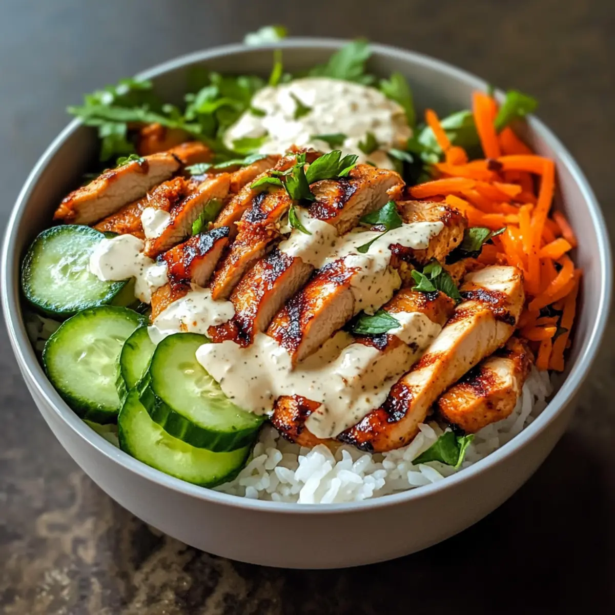 Erlebe eine würzige Hähnchen Bowl mit cremiger Soße für ein unvergleichliches Geschmackserlebnis.