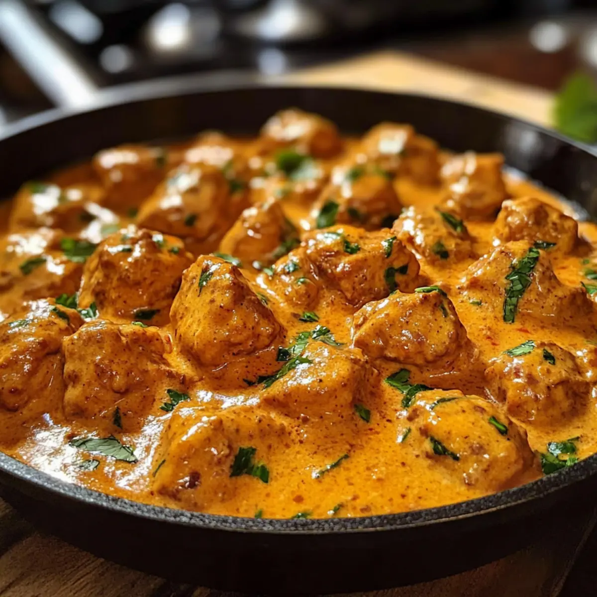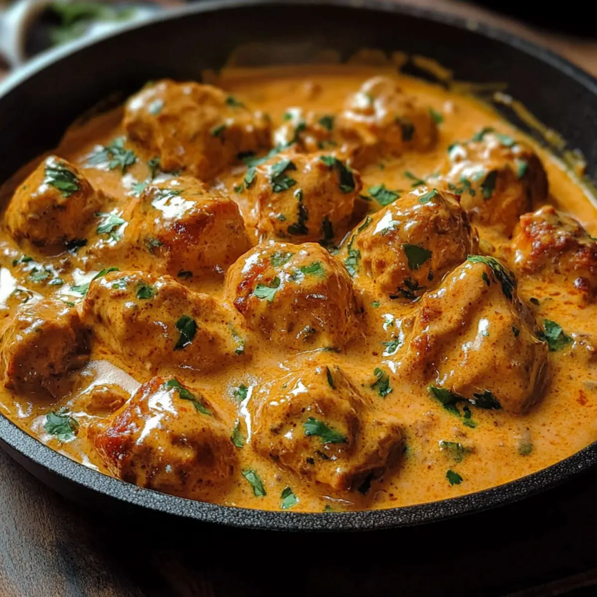 Letzten Sonntag, während ich in der Küche stand und den gemütlichen Duft von geschmolzenem Butter durch den Raum strömen ließ, befiel mich das Verlangen nach etwas Extra Besonderem – und so entstand mein Zartes Butterhähnchen aus Pfanne, Texas Style. Dieses Rezept kombiniert zartes Hähnchen in einer cremigen, reichhaltigen Sauce, perfekt gewürzt mit frischen Kräutern und einer Prise Paprika. Innerhalb von nur 35 Minuten verwöhnt es euch mit einem Geschmack, der selbst an hektischen Wochentagen viele Herzen höher schlagen lässt. Ob für besondere Anlässe oder einfach nur einen gemütlichen Abend zu Hause, dieses Gericht zeigt, dass Comfort Food nicht kompliziert sein muss – es erfüllt den Bauch und die Seele gleichermaßen. Seid ihr bereit, euer Zuhause mit diesem köstlichen Geschmack zu verzaubern? Warum wird dieses Butterhähnchen zum Favoriten? Schnelle Zubereitung: In nur 35 Minuten könnt ihr dieses köstliche Gericht auf den Tisch bringen — ideal für geschäftige Abende! Cremige Textur: Die reichhaltige Sauce umhüllt das zarte Hähnchen und sorgt für ein unvergleichliches Geschmackserlebnis. Vielseitigkeit: Perfekt zu Reis, Pasta oder frischem Brot — es passt zu nahezu jeder Beilage! Herzhafter Geschmack: Mit einem tollen Mix aus Kräutern und Gewürzen wird jeder Bissen zum Genuss. Geselliges Essen: Serviert in der Pfanne bringt ihr einen Hauch von Familie und Community an den Tisch. Probiert es auch mit unserer Schnelle Kartoffel Pfanne für eine abwechslungsreiche Beilage! Zartes Butterhähnchen Zutaten • Die Zutaten für dieses Rezept sind einfach und sorgen für ein köstliches Ergebnis. Für das Hähnchen Hähnchenbrustfilets – Diese zarte Proteinquelle nimmt die leckere Sauce wunderbar auf. Salz und Pfeffer – Unverzichtbar für die richtige Würze des Hähnchens. Für die Sauce Butter – Sie sorgt für die reichhaltige Basis der Sauce und verleiht Geschmack. Schlagsahne (Heavy Cream) – Sie macht die Sauce cremig; alternativ kann auch eine Mischung aus Frischkäse und Milch verwendet werden. Hühnerbrühe (Chicken Broth) – Fügt Tiefe und Geschmack hinzu; Verwendung von natriumarmer Brühe für eine gesündere Variante empfohlen. Zwiebel (Onion) – Grundlegender Geschmacksträger, fein gewürfelt für gleichmäßiges Garen. Knoblauchpulver (Garlic Powder) – Bringt ein wunderbares Aroma; frischer Knoblauch ist ebenfalls eine gute Option. Paprikapulver (Paprika) – Verleiht Farbe und Geschmack; geräuchertes Paprikapulver kann für eine besondere Note verwendet werden. Getrockneter Thymian (Dried Thyme) – Unterstützt das Kräuterprofil; frische Alternativen wie Petersilie oder Schnittlauch sind ebenfalls denkbar. Für die Präsentation Frische Kräuter – Zum Garnieren und für zusätzlichen Geschmack; ideal ist frischer Thymian oder Petersilie. Genießt euer Zartes Butterhähnchen aus Pfanne und lasst es in eurer Küche zauberhaft duften! Schritt-für-Schritt-Anleitung für Zartes Butterhähnchen aus Pfanne Step 1: Butter schmelzen Erhitzt eine große Pfanne bei mittlerer Hitze und fügt die Butter hinzu. Lasst sie langsam schmelzen, bis sie leicht schäumt. Achte darauf, dass die Butter nicht braun wird, denn für unser Zartes Butterhähnchen aus Pfanne ist eine goldene, flüssige Butterbasis ideal für den nächsten Schritt. Step 2: Zwiebeln anbraten Fügt die fein gewürfelten Zwiebeln hinzu und sautiert sie in der geschmolzenen Butter für etwa 3-5 Minuten, bis sie weich und durchsichtig sind. Die Zwiebeln sollten leicht glänzen und ihre Farbe verändern, was den köstlichen Grundgeschmack für das Hähnchen schafft. Step 3: Hähnchen würzen In einer Schüssel gebt die Hähnchenbrustfilets und würzt sie großzügig mit Knoblauchpulver, Paprika, Salz und Pfeffer. Vermischt alles gut, sodass jede Hähnchenstück gut ummantelt ist. Diese Würzschicht sorgt dafür, dass jedes Stück zart und aromatisch im Zartes Butterhähnchen aus Pfanne bleibt. Step 4: Hähnchen anbraten Legt die gewürzten Hähnchenstücke vorsichtig in die Pfanne zu den Zwiebeln und bratet sie für etwa 5-7 Minuten an. Wendet sie einmal, bis sie rundherum schön goldbraun sind. Achtet darauf, dass die Stücke gut durchgebraten sind, bevor ihr mit dem nächsten Schritt fortfahrt. Step 5: Brühe hinzugeben Gießt die Hühnerbrühe in die Pfanne und lasst sie sanft aufkochen. Reduziert die Hitze und lasst das gesamte Gericht für etwa 5 Minuten sanft köcheln. Dies lässt die Aromen verschmelzen und das Hähnchen wird saftig und zart – das ist der Zauber des Zarten Butterhähnchens aus Pfanne. Step 6: Sahne einrühren Reduziert die Hitze weiter und fügt die Schlagsahne hinzu, indem ihr gut umrührt. Sorgt dafür, dass die Sahne vollständig in die Brühe eingearbeitet ist. Diese Mischung verleiht dem Gericht die cremige Textur, die das Zarte Butterhähnchen so besonders macht, und sorgt für einen tollen Kontrast zu den Gewürzen. Step 7: Sauce eindicken Lasst die Sauce auf niedriger Hitze für weitere 5 Minuten köcheln. Die Sauce sollte leicht eindicken und eine samtige Konsistenz erreichen. Rührt gelegentlich um, damit die Sauce gleichmäßig eindickt und das Hähnchen weiterhin zart bleibt, während sie sich um die Stücke legt. Step 8: Garnieren und servieren Vor dem Servieren könnt ihr das Zarte Butterhähnchen aus Pfanne mit frischen Kräutern nach Wahl bestreuen, um einen zusätzlichen Geschmackskick zu geben. Serviert es direkt aus der Pfanne für einen rustikalen Look oder auf einem schönen Teller mit Beilagen eurer Wahl, um ein gemütliches Abendessen zu genießen. Zartes Butterhähnchen Variationen & Ersatzmöglichkeiten Lasst eure Kreativität freien Lauf und passt dieses Rezept ganz nach eurem Geschmack an! Dunkles Fleisch: Ersetzt Hähnchenbrust durch Hähnchenschenkel für mehr Geschmack und Saftigkeit. Drumsticks machen das Gericht noch zarter! Low-Carb: Nutzt Blumenkohlreis anstelle von herkömmlichem Reis, um die Kohlenhydrate zu reduzier