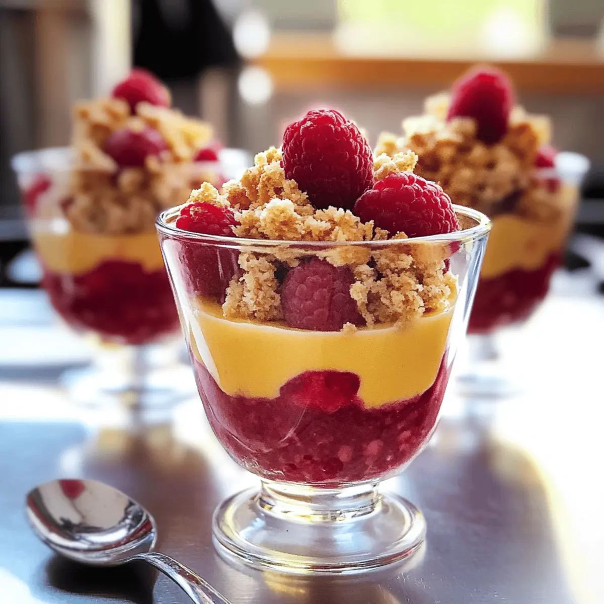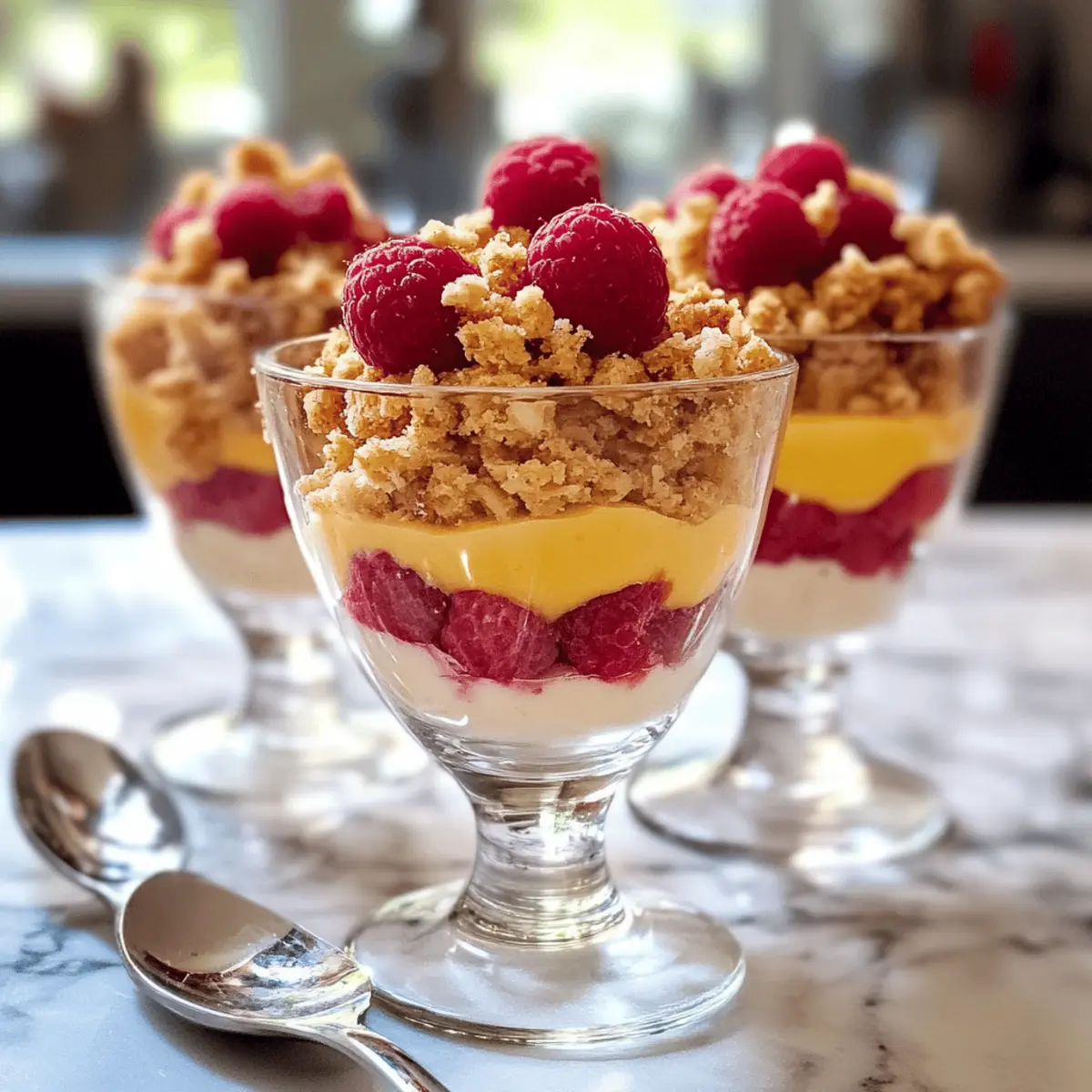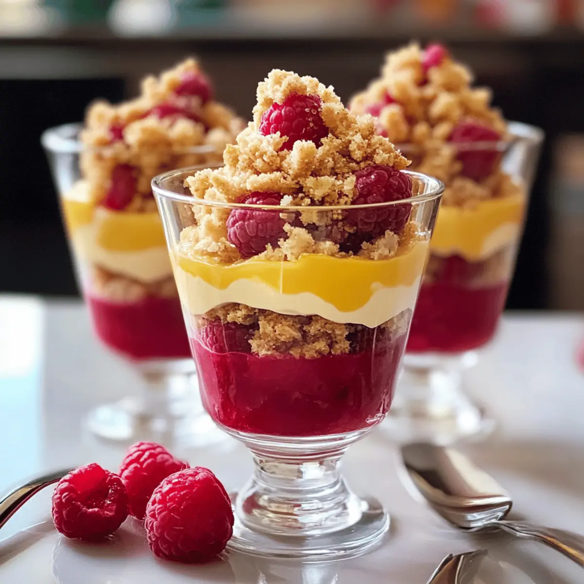 Ein erfrischendes Sommererlebnis wartet auf euch: Die Zitronen-Himbeer-Crumble sind nicht nur ein Augenschmaus, sondern auch ein Hochgenuss für den Gaumen. Bei der Zubereitung dieser köstlichen Schichtdesserts greift ihr auf einfache Zutaten zurück, was sie zu einer perfekten Wahl für jede Gelegenheit macht. Die Kombination aus cremiger Zitronenfüllung und fruchtigen Himbeeren macht diese Parfaits zu einem großartigen Rezept für alle, die in der Küche unkompliziert, aber dennoch raffiniert unterwegs sein möchten. Ob für eine Feier oder einfach nur zum Genießen, diese glutenfreien Desserts sind ein echter Crowd-Pleaser. Wollt ihr wissen, wie ihr dieses himmlische Dessert in kürzester Zeit zubereiten könnt? Weiter geht’s! Warum sind diese Parfaits so besonders? Einfachheit: Die Zubereitung dieser Zitronen-Himbeer-Crumble ist unglaublich unkompliziert und benötigt nur grundlegende Kochfähigkeiten, sodass jeder schnell zum Ziel kommt. Frische Geschmacksexplosion: Die perfekte Kombination aus saftigen Himbeeren und spritziger Zitrone sorgt für einen erfrischenden Genuss, der eure Geschmacksnerven belebt. Vielseitigkeit: Passt die Frucht nach Saison an; anstelle von Himbeeren könnt ihr auch Erdbeeren oder Blaubeeren verwenden. Optischer Genuss: Diese Schichtdesserts sind nicht nur lecker, sondern auch ein echter Hingucker auf jedem Tisch. Geselligkeit: Ideal für Partys oder Familientreffen – jeder wird von diesem laktosefreien Dessert begeistert sein. Vielleicht entdeckt ihr auch einige Variationen, um das Rezept noch persönlicher zu gestalten! Zutaten für Zitronen-Himbeer-Crumble • Diese köstlichen Zitronen-Himbeer-Crumble sind einfach zuzubereiten und erfreuen sich großer Beliebtheit! Für die Streusel Zucker – Süßungsmittel, das die Säure von Zitrone und Himbeeren ausgleicht. Ersetzt durch Honig für eine natürliche Alternative. Mehl – Bildet die Grundlage für den Streuselteig. Verwende Mandelmehl für eine glutenfreie Option. Gemahlene Mandeln – Fügt einen nussigen Geschmack sowie Textur hinzu. Kann auch durch gemahlene Haselnüsse ersetzt werden. Butter – Gibt den Streuseln und der Creme eine reichhaltige Note. Vegane Butter kann für eine laktosefreie Variante verwendet werden. Haselnüsse – Sorgt für einen knusprigen Biss im Streusel. Pecan oder Walnüsse können ebenfalls verwendet werden. Für die Zitronencreme Zitronen – Essentiell für den Geschmack; frische Zitronen bringen das Beste aus diesem Rezept hervor. Speisestärke – Verdickt die Zitronenmasse. Kann durch Tapiokastärke für eine glutenfreie Option ersetzt werden. Eigelbe – Verleiht der Creme Cremigkeit und Körper. Für vegane Alternativen können Seidentofu oder ein Eiersatz verwendet werden. Für die Himbeerschicht Himbeeren – Sorgt für eine fruchtige Schicht. Frische Beeren sind ideal, aber auch gefrorene Himbeeren können verwendet werden. Entdecke die unzähligen Möglichkeiten, die dieses Rezept der Zitronen-Himbeer-Crumble zu bieten hat! Schritt-für-Schritt-Anleitung für Zitronen-Himbeer-Crumble Schritt 1: Streusel vorbereiten Mische in einer Schüssel den Zucker, das Mehl und die gemahlenen Mandeln. Füge die kalte Butter Stück für Stück hinzu und knete die Mischung mit den Händen, bis sie krümelig wird. Integriere die gehackten Haselnüsse. Decke die Schüssel ab und stelle sie für 1 Stunde in den Kühlschrank, um die Streusel fest werden zu lassen. Schritt 2: Zitronencreme herstellen Presse die Zitronen aus, um 150 ml Saft zu erhalten. Kombiniere den Zitronensaft mit Zucker in einem Topf und bringe die Mischung zum Kochen. Mische die Speisestärke mit etwas Wasser und füge sie zur kochenden Zitronenmasse hinzu, um sie zu verdicken. Nimm den Topf vom Herd und rühre die Eigelbe ein. Siebe die Mischung, um Klumpen zu entfernen, und lasse sie abkühlen. Schritt 3: Streusel backen Heize den Ofen auf 175°C vor. Verteile die Streusel gleichmäßig auf einem mit Backpapier ausgelegten Backblech. Backe die Streusel für 10-15 Minuten, bis sie goldbraun und knusprig sind. Überwache den Backvorgang sorgfältig, um ein Verbrennen zu verhindern. Lass die Streusel danach vollständig abkühlen. Schritt 4: Parfaits schichten Nehme vier Gläser und verteile die Zitronencreme gleichmäßig in den Gläsern. Füge dann eine Schicht frischer Himbeeren hinzu, gefolgt von einer großzügigen Schicht der abgekühlten Streusel. Du kannst die Zitronen-Himbeer-Crumble sofort servieren oder sie im Kühlschrank für eine Weile kühlen, damit die Aromen sich intensivieren. Zitronen-Himbeer-Crumble: Variationen & Alternativen Passt dieses Rezept einfach nach euren Wünschen an, um neue Geschmackserlebnisse zu kreieren und es zu einem ganz persönlichen Dessert zu machen! Beeren-Mix: Tauscht Himbeeren gegen eine Mischung aus Erdbeeren und Heidelbeeren für einen bunten Fruchtgenuss. Die Kombination bringt eine süßere Note und macht die Parfaits besonders einladend. Vanille-Infusion: Fügt der Zitronencreme ein wenig Vanilleextrakt hinzu, um die Aromen zu vertiefen. Dieser kleine Twist kann den Geschmack des Desserts erheblich verändern und es besonders aromatisch machen. Joghurt-Schicht: Ergänzt die Creme mit einer Schicht griechischem Joghurt für mehr Cremigkeit und einen probiotischen Kick. Diese Kombination ist nicht nur gesund, sondern sorgt auch für eine interessante Textur. Nuss-Twist: Ersetzt die Haselnüsse im Streusel durch einige gehackte Pistazien oder Mandeln für zusätzlichen Crunch und ein neues Geschmacksprofil. Nüsse bringen nicht nur Struktur, sondern auch geschmackliche Vielfalt ins Spiel. Schokoladige Note: Für Schokoladenliebhaber könnt ihr der Streuselmischung einen Löffel Kakaopulver hinzufügen. Die Kombination von Zitrone und Schokolade kann überraschend köstlich sein und dem Dessert eine luxuriöse Note verleihen. Minze-Frische: Fügt frisch gehackte Minze zur Himbeerschicht hinzu, um eine erfrischende Kräuternote zu erhalten, die perfekt m